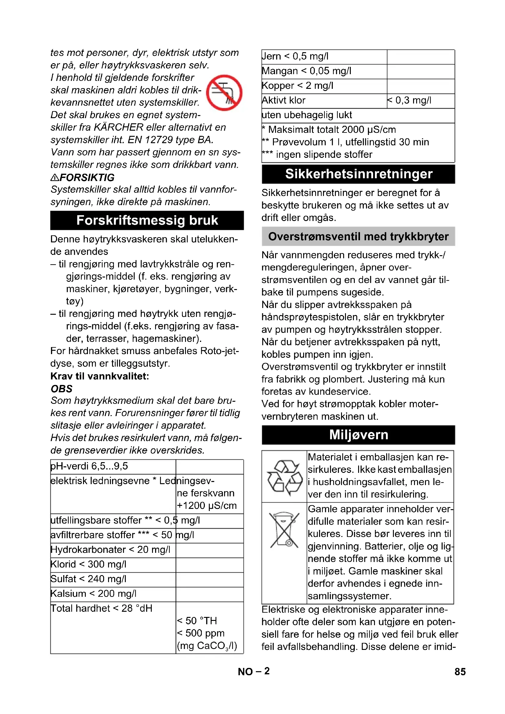 dB(A) 87 Driftsstoffer Oliemængde l 1,2 Olietype: SAE 90 Mål og vægt Længde x bredde x højde mm 560 x 500 x 1090 Vægt uden tilbehør (SX) kg 66(68) Indhold rensemiddeltank l 6 Årsag til undtagelse i henhold til forordning (EU) 2019/1781, bilag I, afsnit 2 (12): j) 83DA– 1 Før første gangs bruk av appa- ratet, les denne originale bruks- anvisningen, følg den og oppbevar den for senere bruk eller for overlevering til neste eier. se omslagsside 1 Håndsrpøytepistol EASY!Force 2 Avtrekkerhendel 3 Sikringshendel 4 Høyttrykksslange EASY!Lock 5 Holder for høytrykkspistol 6 Doseringsventil rengjøringsmiddel 7 Lokk for rengjøringsmiddeltank 8 Rengjøringsmiddel-tank 9 Rengjøringsmiddel-sugeslange med fil- ter 10 Festeskrue maskindeksel 11 Apparatbryter 12 Maskinhette 13 Manometer 14 Høytrykkstilkobling EASY!Lock 15 Dyseholder 16 Vanntilkobling 17 Finfilter 18 Oljenivåindikator 19 Oljebeholder 20 Slangeholder 21 Utlufting rengjøringsmiddeltank 22 Tilbehørsrom 23 Kabelholder 24 Slangetrommel 25 Sveiv 26 Håndtak 27 Unionmutter 28 Dyse 29 Strålerør EASY!Lock 30 Trykk- / mengderegulering (kun 1.286-911.0) 31 Sikringslås – Betjeningselementer for rengjørings- prosessen er gule. – Betjeningselementer for vedlikehold og service er lysegråe. – Det er tvingende nødvendig å lese sik- kerhetsinstruksene nr. 5.951-949.0 før maskinen settes i drift! – Følg gjeldende lovpålagte nasjonale forskrifter for væskestrålemaskiner. – Følg gjeldende lovpålagte nasjonale forskrifter om ulykkesforhindring. Væs- kestrålemaskinen må kontrolleres re- gelmessig og resultatene av kontrollen skal protokollføres. – Det må ikke gjøres endringer på appa- ratet/tilbehøret. FARE Anvisning om en umiddelbar truende fare som kan føre til store personskader eller til død. 몇 ADVARSEL Anvisning om en mulig farlig situasjon som kan føre til store personskader eller til død. 몇 FORSIKTIG Anvisning om en mulig farlig situasjon som kan føre til mindre personskader. OBS Anvisning om en mulig farlig situasjon som kan føre til materielle skader. Høytrykkstråler kan være farlige ved feil bruk. Strålen må ikke ret- Innholdsfortegnelse Maskinorganer . . . . . . . . . . . . NO 1 Sikkerhetsinstruksjoner. . . . . . NO 1 Forskriftsmessig bruk . . . . . . . NO 2 Sikkerhetsinnretninger . . . . . . NO 2 Miljøvern . . . . . . . . . . . . . . . . . NO 2 Før den tas i bruk . . . . . . . . . . NO 3 Ta i bruk . . . . . . . . . . . . . . . . . NO 3 Betjening. . . . . . . . . . . . . . . . . NO 4 Transport. . . . . . . . . . . . . . . . . NO 6 Lagring . . . . . . . . . . . . . . . . . . NO 6 Pleie og vedlikehold . . . . . . . . NO 6 Feilretting . . . . . . . . . . . . . . . . NO 7 Tilbehør og reservedeler. . . . . NO 7 Garanti . . . . . . . . . . . . . . . . . . NO 7 EU-samsvarserklæring . . . . . . NO 8 Tekniske data . . . . . . . . . . . . . NO 9 Maskinorganer Fargemerking Sikkerhetsinstruksjoner Risikotrinn Symboler på maskinen 84 NO– 2 tes mot personer, dyr, elektrisk utstyr som er på, eller høytrykksvaskeren selv. I henhold til gjeldende forskrifter skal maskinen aldri kobles til drik- kevannsnettet uten systemskiller. Det skal brukes en egnet system- skiller fra KÄRCHER eller alternativt en systemskiller iht. EN 12729 type BA. Vann som har passert gjennom en sn sys- temskiller regnes ikke som drikkbart vann. 몇 FORSIKTIG Systemskiller skal alltid kobles til vannfor- syningen, ikke direkte på maskinen. Denne høytrykksvaskeren skal utelukken- de anvendes – til rengjøring med lavtrykkstråle og ren- gjørings-middel (f. eks. rengjøring av maskiner, kjøretøyer, bygninger, verk- tøy) – til rengjøring med høytrykk uten rengjø- rings-middel (f.eks. rengjøring av fasa- der, terrasser, hagemaskiner). For hårdnakket smuss anbefales Roto-jet- dyse, som er tilleggsutstyr. Krav til vannkvalitet: OBS Som høytrykksmedium skal det bare bru- kes rent vann. Forurensninger fører til tidlig slitasje eller avleiringer i apparatet. Hvis det brukes resirkulert vann, må følgen- de grenseverdier ikke overskrides. Sikkerhetsinnretninger er beregnet for å beskytte brukeren og må ikke settes ut av drift eller omgås. Når vannmengden reduseres med trykk-/ mengdereguleringen, åpner over- strømsventilen og en del av vannet går til- bake til pumpens sugeside. Når du slipper avtrekksspaken på håndsprøytespistolen, slår en trykkbryter av pumpen og høytrykksstrålen stopper. Når du betjener avtrekksspaken på nytt, kobles pumpen inn igjen. Overstrømsventil og trykkbryter er innstilt fra fabrikk og plombert. Justering må kun foretas av kundeservice. Ved for høyt strømopptak kobler moter- vernbryteren maskinen ut. Elektriske og elektroniske apparater inne- holder ofte deler som kan utgjøre en poten- siell fare for helse og miljø ved feil bruk eller feil avfallsbehandling. Disse delene er imid- Forskriftsmessig bruk pH-verdi 6,5...9,5 elektrisk ledningsevne * Ledningsev- ne ferskvann +1200 µS/cm utfellingsbare stoffer ** < 0,5 mg/l avfiltrerbare stoffer *** < 50 mg/l Hydrokarbonater < 20 mg/l Klorid < 300 mg/l Sulfat < 240 mg/l Kalsium < 200 mg/l Total hardhet < 28 °dH < 50 °TH < 500 ppm (mg CaCO