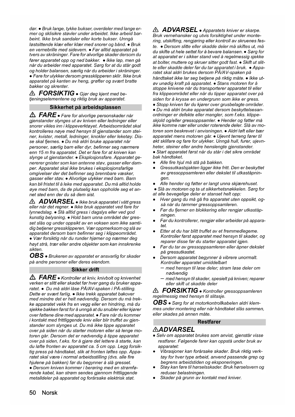 - EU-samsvarserklæring Norsk dør. ● Bruk lange, tykke bukser, overdeler med lange er- mer og sklisikre støvler under arbeidet. Ikke arbeid bar- beint. Ikke bruk sandaler eller korte bukser. Unngå løstsittende klær eller klær med snorer og bånd. ● Bruk en vernebrille med sidevern. ● Før alltid apparatet på tvers av skråninger. Fare for alvorlige skader dersom du fører apparatet opp og ned bakker. ● Ikke løp, men gå når du arbeider med apparatet. Sørg for at du står godt og holder balansen, særlig når du arbeider i skråninger. ● Fare for ulykker dersom gressklipperen sklir. Ikke bruk apparatet på kanten av heng, grøfter og svært bratte bakker og skrenter. 몇 FORSIKTIG ● Gjør deg kjent med be- tjeningselementene og riktig bruk av apparatet. Sikkerhet på arbeidsplassen FARE ● Fare for alvorlige personskader når gjenstander slynges ut av kniven eller ledninger eller snorer vikles inn i klippeverktøyet. Arbeidsområdet skal kontrolleres nøye med hensyn til gjenstander som stei- ner, kvister, metall, ledninger, knokler eller leketøy. Dis- se skal fjernes. ● Du må aldri bruke apparatet når personer, særlig barn eller dyr, befinner seg nærmere enn 15 m fra apparatet. Det er fare for at kniven kan slynge ut gjenstander. ● Eksplosjonsfare. Apparatet ge- nererer gnister som kan antenne støv, gasser eller dam- per. Apparatet skal ikke brukes i eksplosjonsfarlige omgivelser der det befinner seg brennbare væsker, gasser eller støv. ● Alvorlige ulykker med barn. Barn kan bli fristet til å leke med apparatet. Du må alltid holde øye med barn, da de plutselig kan oppholde seg et an- net sted enn der du så dem sist. 몇 ADVARSEL ● Ikke bruk apparatet i vått gress eller når det regner. ● Ikke bruk apparatet ved fare for lynnedslag. ● Slå alltid gress i dagslys eller ved god kunstig belysning. ● Hold barn unna området der gres- set slås og under oppsikt av en voksen som ikke samti- dig betjener gressklipperen. Vær oppmerksom og slå av apparatet dersom barn befinner seg i klippeområdet. ● Vær forsiktig når du runder hjørner og nærmer deg høyt strå, trær eller andre objekter som kan innskrenke sikten. OBS ● Brukeren av apparatet er ansvarlig for skader på andre personer eller deres eiendom. Sikker drift FARE ● Kontroller at kniv, knivbolt og knivenhet verken er slitt eller skadet før hver gang du bruker appa- ratet. ● Du må aldri låse PÅ/AV-spaken i PÅ-stilling. Dette er svært farlig. ● Ikke trekk apparatet bakover med mindre det er helt nødvendig. Dersom du må trek- ke apparatet vekk fra en vegg eller en hindring, må du sjekke bakken først for å unngå at du snubler eller kjører over føttene dine med apparatet. ● Fare når du kommer i kontakt med frittliggende kniv eller blir truffet av gjen- stander som slynges ut. Du må ikke tippe apparatet over på siden når du starter motoren eller så lenge mo- toren går. Dersom det er nødvendig å tippe apparatet over på siden, f.eks. for å gjøre det lettere å starte, kan du løfte fronten av apparatet ca. 5 cm opp. Legg forsik- tig press på håndtaket, slik at fronten løftes opp. Appa- ratet skal være i normal arbeidsstilling (dvs. alle fire hjulene på bakken) før du begynner å slå gresset. ● Dersom kniven kommer i berøring med en strømfø- rende kabel, kan strøm sendes gjennom frittliggende metalldeler på apparatet og forårsake elektrisk støt. 몇 ADVARSEL ● Apparatets kniver er skarpe. Bruk vernehansker og utvis forsiktighet under monte- ring, utskifting, rengjøring eller kontroll av skruenes fes- te. ● Dersom slitte eller skadde deler må skiftes ut, må du skifte ut hele settet for å bevare balansen. ● Sørg for at apparatet er i sikker stand ved å regelmessig sjekke at bolter, muttere og skruer sitter godt fast. ● Skift ut slit- te eller skadde deler før du tar apparatet i bruk. ● Appa- ratet skal aldri brukes dersom PÅ/AV-spaken på håndtaket ikke lar seg betjene på riktig måte. ● Ikke ut- øv unødig kraft på apparatet. ● Stans motoren for å stoppe knivene når du transporterer apparatet til eller fra klippeområdet eller når du tipper apparatet over på siden for å krysse en undergrunn som ikke er gress. ● Stopp kniven før du kjører over grusbelagte områder. ● Du må aldri bruke apparatet dersom beskyttelsesan- ordninger er defekte eller mangler, som f.eks. klippe- skjold og/eller gressoppsamler. ● Hender og føtter må ikke komme nær eller under roterende deler. Slå av mo- toren som beskrevet i anvisningen. ● Aldri løft eller bær apparatet mens motoren går. ● Ujevnt terreng fører til økt sklifare og fare for ulykker. Unngå hull, furer, ujevn- heter, steiner eller andre henslengte gjenstander. ● Start apparatet først når du står i det sikre området bak håndtaket. ● Alle fire hjul må stå på bakken. ● Gressutkastsjakten ligger ikke fritt. Den er beskyttet av gressoppsamleren eller dekslet til utkaståpnin- gen. ● Alle hender og føtter er langt unna skjærehuset. ● Slå av motoren og ta ut sikkerhetsnøkkelen. Sørg for at alle bevegelige deler er stanset helt opp: ● Hver gang du må gå fra apparatet uten oppsikt, og- så når du tømmer gressoppsamleren. ● Før du fjerner en blokkering eller rengjør utkaståp- ningen. ● Før du kontrollerer, rengjør eller arbeider på appara- tet. ● Etter at du har blitt truffet av et fremmedlegeme. Kontroller først apparatet med hensyn til skader, og reparer disse før du starter apparatet igjen. ● Før du tar av gressoppsamleren eller åpner dekslet på gressutkastet. ● Dersom apparatet begynner å vibrere unormalt. Kontroller apparatet umiddelbart – med hensyn til løse deler; stram løse deler om nødvendig – med hensyn til skader, spesielt på kniven; reparer eller skift ut skadde deler 몇 FORSIKTIG ● Kontroller gressoppsamleren regelmessig med hensyn til slitasje. OBS ● Sørg for at motorkontrollkabelen a