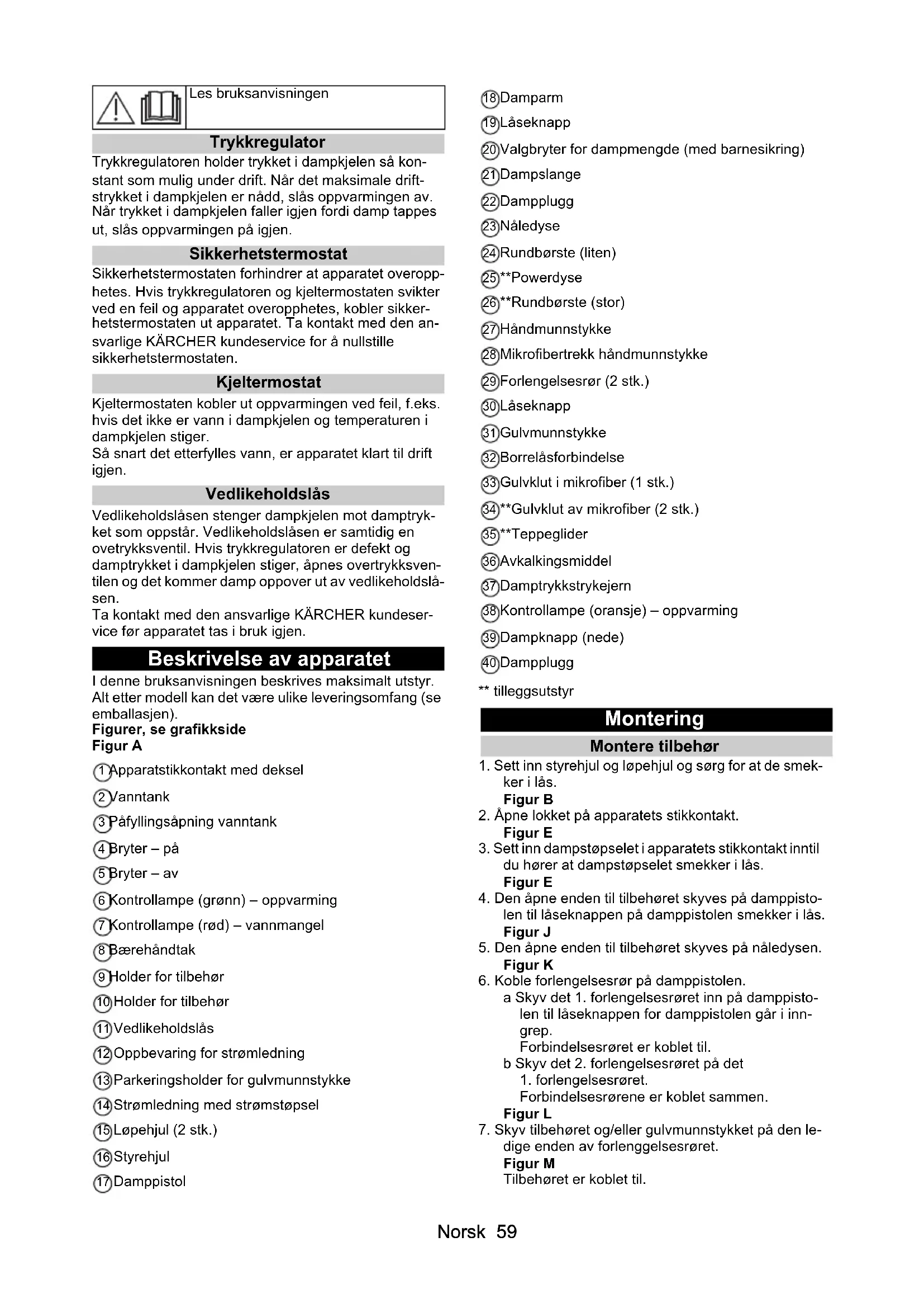 Figur O Damptrykk-strykejern Merknad Vi anbefaler bruk av KÄRCHER strykebord med aktiv dampavsuging. Dette strykebordet er ideelt tilpasset ap- paratet du har kjøpt. Det gjør strykingen enklere og ras- kere. Strykebordet som brukes må uansett ha et dampgjennomtrengelig strykeunderlag av gitter. Merknad Det skal bemerkes at når det gjelder et strykebrett uten dampavsug, er fukting av strykebrettdekselet mulig hvis kondensat akkumuleres. Igangsetting av damptrykkjern OBS Materielle skader på grunn av kondensat/fuktighet Under strykingen kan kondens dryppe ned på gulvet og skade ømfintlige gulvbelegg. Hvis mulig, utfør stryking på et gulvbelegg som er mot- standsdyktig mot kondens (f.eks. fliser / stein). For sensitivt gulv må du forsikre deg om at området som kondensen kan dryppe på er tilstrekkelig beskyttet (f.eks. Vanngjennomtrengelig gulvmatte). Merknad Strykeflaten må være varm slik at dampen ikke konden- serer på flaten og drypper på stryketøyet.