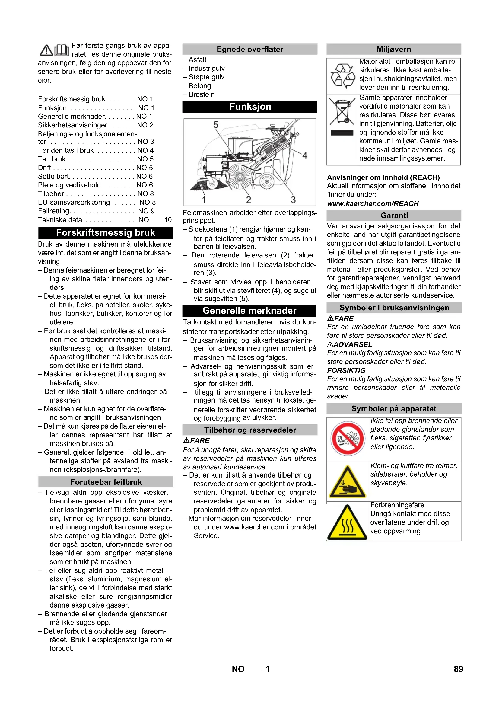 0,2 0,2 88 DA- 1 Før første gangs bruk av appa- ratet, les denne originale bruks- anvisningen, følg den og oppbevar den for senere bruk eller for overlevering til neste eier. Bruk av denne maskinen må utelukkende være iht. det som er angitt i denne bruksan- visning. – Denne feiemaskinen er beregnet for fei- ing av skitne flater innendørs og uten- dørs. – Dette apparatet er egnet for kommersi- ell bruk, f.eks. på hoteller, skoler, syke- hus, fabrikker, butikker, kontorer og for utleiere. – Før bruk skal det kontrolleres at maski- nen med arbeidsinnretningene er i for- skriftsmessig og driftssikker tilstand. Apparat og tilbehør må ikke brukes der- som det ikke er i feilfritt stand. – Maskinen er ikke egnet til oppsuging av helsefarlig støv. – Det er ikke tillatt å utføre endringer på maskinen. – Maskinen er kun egnet for de overflate- ne som er angitt i bruksanvisningen. – Det må kun kjøres på de flater eieren el- ler dennes representant har tillatt at maskinen brukes på. – Generelt gjelder følgende: Hold lett an- tennelige stoffer på avstand fra maski- nen (eksplosjons-/brannfare). – Fei/sug aldri opp eksplosive væsker, brennbare gasser eller ufortynnet syre eller løsningsmidler! Til dette hører ben- sin, tynner og fyringsolje, som blandet med innsugningsluft kan danne eksplo- sive damper og blandinger. Dette gjel- der også aceton, ufortynnede syrer og løsemidler som angriper materialene som er brukt på maskinen. – Fei eller sug aldri opp reaktivt metall- støv (f.eks. aluminium, magnesium el- ler sink), de vil i forbindelse med sterkt alkaliske eller sure rengjøringsmidler danne eksplosive gasser. – Brennende eller glødende gjenstander må ikke suges opp. – Det er forbudt å oppholde seg i fareom- rådet. Bruk i eksplosjonsfarlige rom er forbudt. – Asfalt – Industrigulv – Støpte gulv – Betong – Brostein Feiemaskinen arbeider etter overlappings- prinsippet. – Sidekostene (1) rengjør hjørner og kan- ter på feieflaten og frakter smuss inn i banen til feievalsen. – Den roterende feievalsen (2) frakter smuss direkte inn i feieavfallsbeholde- ren (3). – Støvet som virvles opp i beholderen, blir skilt ut via støvfilteret (4), og sugd ut via sugeviften (5). Ta kontakt med forhandleren hvis du kon- staterer transportskader etter utpakking. – Bruksanvisning og sikkerhetsanvisnin- ger for arbeidsinnretnigner montert på maskinen må leses og følges. – Advarsel- og henvisningsskilt som er anbrakt på apparatet, gir viktig informa- sjon for sikker drift. – I tillegg til anvisningene i bruksveiled- ningen må det tas hensyn til lokale, ge- nerelle forskrifter vedrørende sikkerhet og forebygging av ulykker. FARE For å unngå farer, skal reparasjon og skifte av reservedeler på maskinen kun utføres av autorisert kundeservice. – Det er kun tillatt å anvende tilbehør og reservedeler som er godkjent av produ- senten. Originalt tilbehør og originale reservedeler garanterer for sikker og problemfri drift av apparatet. – Mer informasjon om reservedeler finner du under www.kaercher.com i området Service. Anvisninger om innhold (REACH) Aktuell informasjon om stoffene i innholdet finner du under: www.kaercher.com/REACH Vår ansvarlige salgsorganisasjon for det enkelte land har utgitt garantibetingelsene som gjelder i det aktuelle landet. Eventuelle feil på tilbehøret blir reparert gratis i garan- titiden dersom disse kan føres tilbake til material- eller produksjonsfeil. Ved behov for garantireparasjoner, vennligst henvend deg med kjøpskvitteringen til din forhandler eller nærmeste autoriserte kundeservice. FARE For en umiddelbar truende fare som kan føre til store personskader eller til død. 몇 ADVARSEL For en mulig farlig situasjon som kan føre til store personskader eller til død. FORSIKTIG For en mulig farlig situasjon som kan føre til mindre personskader eller til materielle skader. Forskriftsmessig bruk . . . . . . . NO 1 Funksjon . . . . . . . . . . . . . . . . . NO 1 Generelle merknader. . . . . . . . NO 1 Sikkerhetsanvisninger . . . . . . . NO 2 Betjenings- og funksjonelemen- ter . . . . . . . . . . . . . . . . . . . . . . NO 3 Før den tas i bruk . . . . . . . . . . NO 4 Ta i bruk. . . . . . . . . . . . . . . . . . NO 5 Drift . . . . . . . . . . . . . . . . . . . . . NO 5 Sette bort. . . . . . . . . . . . . . . . . NO 6 Pleie og vedlikehold. . . . . . . . . NO 6 Tilbehør . . . . . . . . . . . . . . . . . . NO 8 EU-samsvarserklæring . . . . . . NO 8 Feilretting. . . . . . . . . . . . . . . . . NO 9 Tekniske data . . . . . . . . . . . . . NO 10 Forskriftsmessig bruk Forutsebar feilbruk Egnede overflater Funksjon Generelle merknader Tilbehør og reservedeler Miljøvern Materialet i emballasjen kan re- sirkuleres. Ikke kast emballa- sjen i husholdningsavfallet, men lever den inn til resirkulering. Gamle apparater inneholder verdifulle materialer som kan resirkuleres. Disse bør leveres inn til gjenvinning. Batterier, olje og lignende stoffer må ikke komme ut i miljøet. Gamle mas- kiner skal derfor avhendes i eg- nede innsamlingssystemer. Garanti Symboler i bruksanvisningen Symboler på apparatet Ikke fei opp brennende eller glødende gjenstander som f.eks. sigaretter, fyrstikker eller lignende. Klem- og kuttfare fra reimer, sidebørster, beholder og skyvebøyle. Forbrenningsfare Unngå kontakt med disse overflatene under drift og ved oppvarming. 89NO- 2 – Før bruk skal det kontrolleres at maski- nen med arbeidsinnretningene er i for- skriftsmessig og driftssikker tilstand. Apparat og tilbehør må ikke brukes der- som det ikke er i feilfritt stand. – Ved bruk av maskinen på farlige steder (f.eks. bensinstasjoner etc.), må det tas hensyn til gjeldende sikkerhetsforskrif- ter. Bruk i eksplosjonsfarlige rom er for- budt. – Apparatet må brukes på korrekt måte. Du må ta hensyn til forholdene på det aktuelle bruksstedet, og være opp- merksom på andre personer, og spesi- elt barn. – Før a