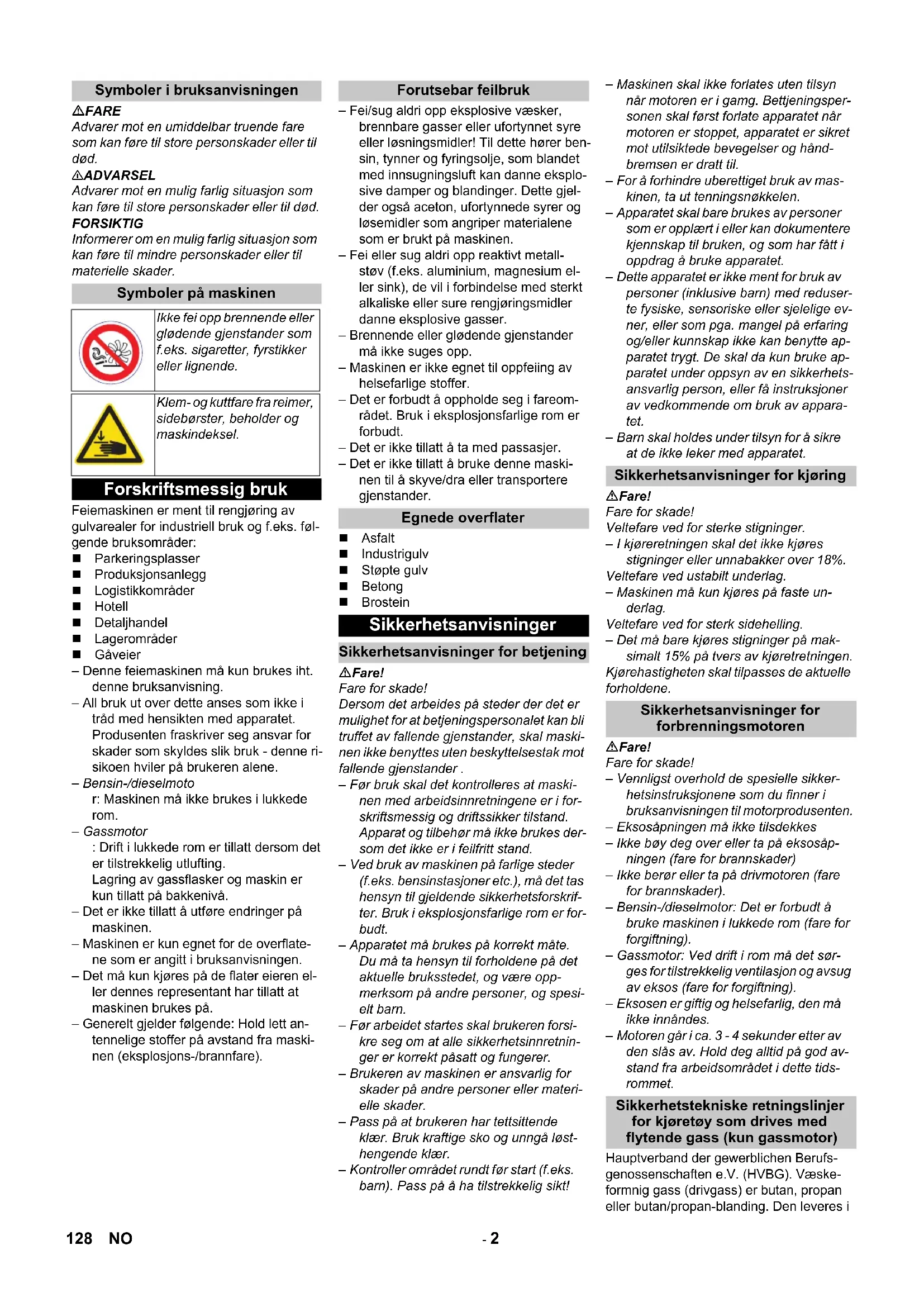 Målt: 95 Garanteret: 98 Chairman of the Board of Management Director Regulatory Affairs & Certification Tilbehør Sidekost 6.905-986.0 Med standardbørste til indendørs og udendørs arealer. Sidekost, blød 6.906-133.0 Til fintstøv på indendørs arealer, fugtig- hedsbestandig. Sidekost, hårdt 6.906-065.0 Til fjernelse af fast siddende snavns i udendørsområdet, fugtighedsbestandig. Standard-fejevalse 6.906-375.0 Slitage- og fugtighedsbestandig Univers- albørste til indendørs- og udendørsrengø- ring. Fejevalse, blød 6.906-533.0 Med naturbørster specielt til fintstøv på jævne områder indendørs. Ikke fugtig- hedsbestandig, ikke til abrassive overfla- der. Fejevalse, hårdt 6.906-532.0 Til fjernelse af fast siddende snavns i udendørsområdet, fugtighedsbestandig. Støvfilter 6.414-532.0 126 DA- 1 Før første gangs bruk av appa- ratet, les denne originale bruks- anvisningen, følg den og oppbevar den for senere bruk eller for overlevering til neste eier. Det er tvingende nødvendig å lese sikker- hetsinstruksene før første bruk! Ta kontakt med forhandleren hvis du kon- staterer transportskader etter utpakking. – Advarsel- og henvisningsskilt som er anbrakt på apparatet, gir viktig informa- sjon for sikker drift. – I tillegg til anvisningene i bruksveiled- ningen må det tas hensyn til lokale, ge- nerelle forskrifter vedrørende sikkerhet og forebygging av ulykker. Motorisering G: Bensinmotor LPG: Gassmotor Anvisninger om innhold (REACH) Aktuell informasjon om stoffene i innholdet finner du under: www.kaercher.com/REACH Vår ansvarlige salgsorganisasjon for det enkelte land har utgitt garantibetingelsene som gjelder i det aktuelle landet. Eventuelle feil på maskinen blir reparert gratis i ga- rantitiden dersom disse kan føres tilbake til material- eller produksjonsfeil. Ved behov for garantireparasjoner, vennligst henvend deg med kjøpskvitteringen til din forhandler eller nærmeste autoriserte kundeservice. FARE For å unngå farer, skal reparasjon og skifte av reservedeler på maskinen kun utføres av autorisert kundeservice. – Det er kun tillatt å anvende tilbehør og reservedeler som er godkjent av produ- senten. Originalt tilbehør og originale reservedeler garanterer for sikker og problemfri drift av apparatet. – Mer informasjon om reservedeler finner du under www.kaercher.com i området Service. Innholdsfortegnelse Innholdsfortegnelse . . . . . . . . NO 1 Generelle merknader . . . . . . . NO 1 Variant med forbrennings- motor. . . . . . . . . . . . . . . NO 1 Miljøvern . . . . . . . . . . . . NO 1 Garanti . . . . . . . . . . . . . NO 1 Tilbehør og reservedeler NO 1 Symboler i bruksanvisnin- gen . . . . . . . . . . . . . . . . NO 2 Symboler på maskinen . NO 2 Forskriftsmessig bruk . . . . . . . NO 2 Forutsebar feilbruk . . . . NO 2 Egnede overflater . . . . . NO 2 Sikkerhetsanvisninger . . . . . . NO 2 Sikkerhetsanvisninger for betjening . . . . . . . . . . . . NO 2 Sikkerhetsanvisninger for kjøring . . . . . . . . . . . . . . NO 2 Sikkerhetsanvisninger for forbrenningsmotoren. . . NO 2 Sikkerhetstekniske retnings- linjer for kjøretøy som drives med flytende gass (kun gassmotor) . . . . . . . . . . NO 2 Sikkerhetsanvisninger for transport av apparatet. . NO 4 Sikkerhetsanvisninger for pleie og vedlikehold . . . NO 4 Funksjon. . . . . . . . . . . . . . . . . NO 4 Betjenings- og funksjonelemen- ter . . . . . . . . . . . . . . . . . . . . . . NO 5 Betjeningspanel . . . . . . NO 5 Fargemerking . . . . . . . . NO 5 Åpne/lukke deksel. . . . . NO 5 Før den tas i bruk . . . . . . . . . . NO 6 Lossing . . . . . . . . . . . . . NO 6 Trille feiemaskinen for hånd NO 6 Bevege feiemaskinen for egen drift. . . . . . . . . . . . NO 6 Ta i bruk . . . . . . . . . . . . . . . . . NO 6 Generelle merknader . . NO 6 Montere/skifte gassflaske (kun KM 100/100 R LPG) NO 6 Fylle drivstoff. . . . . . . . . NO 6 Drift. . . . . . . . . . . . . . . . . . . . . NO 7 Stille inn førersetet . . . . NO 7 Velge programmer . . . . NO 7 Starte maskinen . . . . . . NO 7 Kjøring av maskinen . . . NO 7 Feiedrift. . . . . . . . . . . . . NO 7 Tømme feieavfallsbeholde- ren. . . . . . . . . . . . . . . . . NO 8 Slå maskinen av . . . . . . NO 8 Transport . . . . . . . . . . . NO 8 Lagring . . . . . . . . . . . . . NO 8 Sette bort . . . . . . . . . . . . . . . . NO 8 Pleie og vedlikehold . . . . . . . . NO 9 Generelle merknader . . NO 9 Rengjøring . . . . . . . . . . NO 9 Vedlikeholdsintervaller . NO 9 Vedlikeholdsarbeider . . NO 9 Feilretting . . . . . . . . . . . . . . . . NO 13 Tekniske data . . . . . . . . . . . . . NO 14 EU-samsvarserklæring. . . . . . NO 15 Tilbehør . . . . . . . . . . . . . . . . . NO 15 Generelle merknader Variant med forbrenningsmotor Miljøvern Materialet i emballasjen kan re- sirkuleres. Ikke kast emballasjen i husholdningsavfallet, men lever den inn til resirkulering. Gamlle apparater inneholder ver- difulle materialer som kan gjen- brukes og som bør sendest til gjenbruk. Gamle maskiner skal derfor avhendes i egnede inn- samlingssystemer. Motorolje, diesel og bensin må ikke slip- pes ut i miljøet. Vennligst beskytt miljøet ved å levere brukt olje til godkjent avfalls- håndtering. Garanti Tilbehør og reservedeler 127NO- 2 FARE Advarer mot en umiddelbar truende fare som kan føre til store personskader eller til død. 몇 ADVARSEL Advarer mot en mulig farlig situasjon som kan føre til store personskader eller til død. FORSIKTIG Informerer om en mulig farlig situasjon som kan føre til mindre personskader eller til materielle skader. Feiemaskinen er ment til rengjøring av gulvarealer for industriell bruk og f.eks. føl- gende bruksområder: Parkeringsplasser Produksjonsanlegg Logistikkområder Hotell Detaljhandel Lagerområder Gåveier – Denne feiemaskinen må kun brukes iht. denne bruksanvisning. – All bruk ut over dette anses som ikke i tråd med hensikten med apparatet. Produsenten fraskriver seg ansvar for skader som skyldes slik bruk - denn