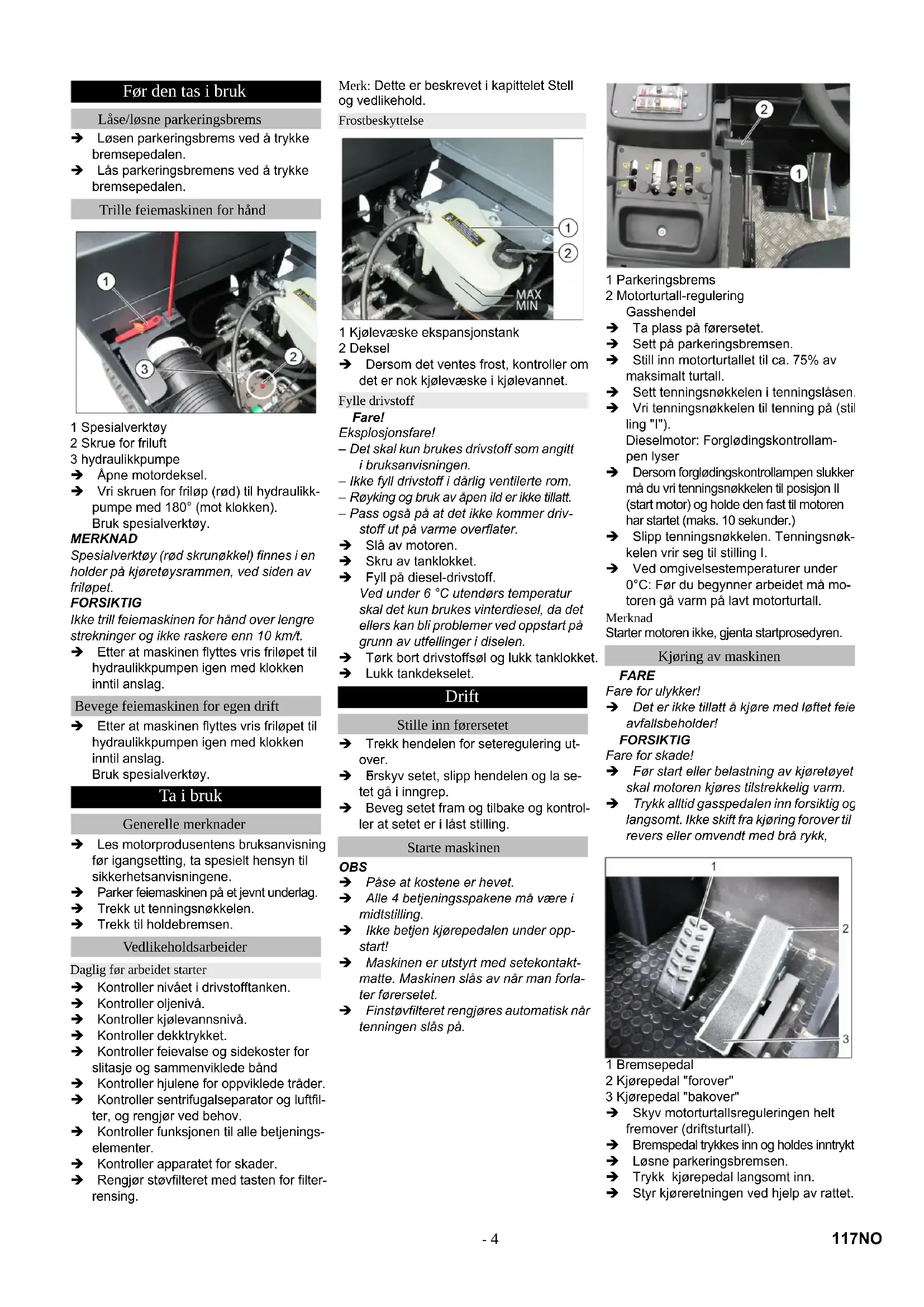 orskyv setet, slipp hendelen og la se- tet gå i inngrep. Beveg setet fram og tilbake og kontrol- ler at setet er i låst stilling. OBS Påse at kostene er hevet. Alle 4 betjeningsspakene må være i midtstilling. Ikke betjen kjørepedalen under opp- start! Maskinen er utstyrt med setekontakt- matte. Maskinen slås av når man forla- ter førersetet. Finstøvfilteret rengjøres automatisk når tenningen slås på. 1 Parkeringsbrems 2 Motorturtall-regulering Gasshendel Ta plass på førersetet. Sett på parkeringsbremsen. Still inn motorturtallet til ca. 75% av maksimalt turtall. Sett tenningsnøkkelen i tenningslåsen. Vri tenningsnøkkelen til tenning på (stil- ling "I"). Dieselmotor: Forglødingskontrollam- pen lyser Dersom forglødingskontrollampen slukker, må du vri tenningsnøkkelen til posisjon II (start motor) og holde den fast til motoren har startet (maks. 10 sekunder.) Slipp tenningsnøkkelen. Tenningsnøk- kelen vrir seg til stilling I. Ved omgivelsestemperaturer under 0°C: Før du begynner arbeidet må mo- toren gå varm på lavt motorturtall. Merknad Starter motoren ikke, gjenta startprosedyren. FARE Fare for ulykker! Det er ikke tillatt å kjøre med løftet feie- avfallsbeholder! 몇 FORSIKTIG Fare for skade! Før start eller belastning av kjøretøyet skal motoren kjøres tilstrekkelig varm. Trykk alltid gasspedalen inn forsiktig og langsomt. Ikke skift fra kjøring forover til revers eller omvendt med brå rykk, 1 Bremsepedal 2 Kjørepedal "forover" 3 Kjørepedal "bakover" Skyv motorturtallsreguleringen helt fremover (driftsturtall). Bremspedal trykkes inn og holdes inntrykt. Løsne parkeringsbremsen. Trykk kjørepedal langsomt inn. Styr kjøreretningen ved hjelp av rattet. Før den tas i bruk Låse/løsne parkeringsbrems Trille feiemaskinen for hånd Bevege feiemaskinen for egen drift Ta i bruk Generelle merknader Vedlikeholdsarbeider Daglig før arbeidet starter Frostbeskyttelse Fylle drivstoff Drift Stille inn førersetet Starte maskinen Kjøring av maskinen 117NO- 5 Trykk kjørepedal "forover" langsomt inn. FARE Fare for skade! Ved rygging skal det ikke være fare for tredjeperson, eventuelt må noen gi deg anvisninger Trykk kjørepedal "bakover" langsomt inn. Kjørehastigheten kan reguleres trinn- løst med kjørepedalen. Unngå rykkvis betjening av pedalen, da dette kan skade hydraulikkanlegget. Ved synkende effekt i stigninger må kjørepedalen tas litt tilbake. Slipp gasspedalen, maskinen bremser automatisk og blir stående. For sterkere bremseeffekt eller i nødstil- felle må bremsepedalen betjenes. OBS Gjenstander eller løse hindringer skal ikke overkjøres eller skyves. Faste hindringer over 70 mm høyde: Faste hindringer må kun kjøres over med en egnet rampe. Kjøre over faste hindringer opp til 70 mm høyde: Kjør langsomt og forsiktig over hinderet. FORSIKTIG Fei ikke pakktape, tråder eller noe lignende da dette kan føre til skader på feiemekanis- men. Merk: For å oppnå optimal rengjøring, bør kjørehastigheten tilpasses de aktuelle for- holdene. Merk: Finstøvfilteret rengjøres automatisk hvert 10. minutt. Merknad: Ved langvarig arbeid i områder med finstøv må filteret rengjøres oftere. I slike tilfeller må du rengjøre finstøvfilteret for hånd innimellom. Rengjør finstøvfilteret ved å trykke på knappen for filterrengjøring. 1 Slå på og senke feievalse (forover) / slå av og heve feievalse (bakover) 2 Senke feieavfallsbeholder (forover) / løfte feieavfallsbeholder (bakover) 3 Senke sidekost (forover) / heve side- kost (bakover) 4 Åpne beholderklaff (forover) / lukke be- holderklaff (bakover) Slå på viften. Betjeningsspak beholderklaff (4) frem- over: Beholderklaffen åpner seg. Merknad: Den grønne indikatorlampen må lyse. Ved flaterengjøring: Betjeningsspak feievals (1) forover: Feievals slås på og senkes. Ved rengjøring av sidekanter: Betjeningsspak sidebørster (3) frem- over: Sidebørste senkes. Slå av vifte. Betjeningsspak beholderklaff (4) frem- over: Beholderklaffen åpner seg. Merknad: Den grønne indikatorlampen må lyse. Ved flaterengjøring: Betjeningsspak feievals (1) forover: Feievals slås på og senkes. Ved rengjøring av sidekanter: Betjeningsspak sidebørster (3) frem- over: Sidebørste senkes. FARE
