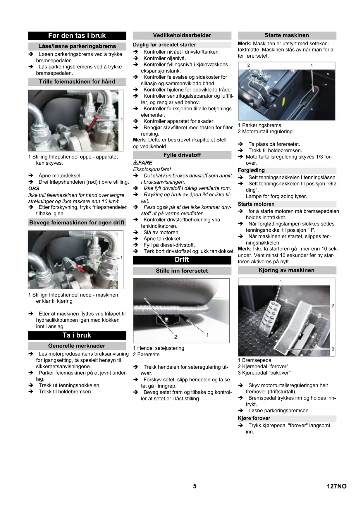 Stilling bak: Vifte på Stilling foran: Filterrengjøring på 7 Bryter for horn 8 Sikringer 9 Tenningslås Glødesymbol : Forgløding Stilling 0: Slå av motor Stilling 1: Tenning på Stilling 2: Starte motoren 10 Motorturtall-regulering Gasshendel 11 Parkeringsbrems Figur 1 Bremsepedal 2 Gasspedal forover/bakover Figur 1 Driftstimeteller 2 Varsellampe lading 3 Varsellampe oljetrykk 4 Varsellampe kjølevannstemperatur 5 Motor innsugingsluft 6 Varsellampe drivstoffreserve 7 Kontrollampe forgløding 8 Kontrollampe (ikke tilkoblet) 9 Kontrollampe parkeringslys/nærlys (ek- strautstyr) 10 Tankindikator 11 Uten funksjon, lyser kun ved start av motoren (selvtest) 12 Uten funksjon 13 Uten funksjon 14 Uten funksjon Betjenings- og funksjonelementer Illustrasjon feiemaskin Valgfritt utstyr Vernetak for fører 2.851-691.0 Arbeidslys 2.851-279.0 Sidebørster, venstre 2.851-272.0 Betjeningspanel Pedaler Kontrollamper og display 126 NO- 5 Løsen parkeringsbrems ved å trykke bremsepedalen. Lås parkeringsbremens ved å trykke bremsepedalen. 1 Stilling friløpshendel oppe - apparatet kan skyves. Åpne motordeksel. Drei friløpshendelen (rød) i øvre stilling. OBS Ikke trill feiemaskinen for hånd over lengre strekninger og ikke raskere enn 10 km/t. Etter forskyvning, trykk friløpshendelen tilbake igjen. 1 Stillign friløpshendel nede - maskinen er klar til kjøring Etter at maskinen flyttes vris friløpet til hydraulikkpumpen igen med klokken inntil anslag. Les motorprodusentens bruksanvisning før igangsetting, ta spesielt hensyn til sikkerhetsanvisningene. Parker feiemaskinen på et jevnt under- lag. Trekk ut tenningsnøkkelen. Trekk til holdebremsen. Kontroller nivået i drivstofftanken. Kontroller oljenivå. Kontroller fyllingsnivå i kjølevæskens ekspansjonstank. Kontroller feievalse og sidekoster for slitasje og sammenviklede bånd Kontroller hjulene for oppviklede tråder. Kontroller sentrifugalseparator og luftfil- ter, og rengjør ved behov. Kontroller funksjonen til alle betjenings- elementer. Kontroller apparatet for skader. Rengjør støvfilteret med tasten for filter- rensing. Merk: Dette er beskrevet i kapittelet Stell og vedlikehold. FARE Eksplosjonsfare! Det skal kun brukes drivstoff som angitt i bruksanvisningen. Ikke fyll drivstoff i dårlig ventilerte rom. Røyking og bruk av åpen ild er ikke til- latt. Pass også på at det ikke kommer driv- stoff ut på varme overflater. Kontroller drivstoffbeholdning vha. tankindikatoren. Slå av motoren. Åpne tanklokket. Fyll på diesel-drivstoff. Tørk bort drivstoffsøl og lukk tanklokket. 1 Hendel setejustering 2 Førersete Trekk hendelen for seteregulering ut- over. Forskyv setet, slipp hendelen og la se- tet gå i inngrep. Beveg setet fram og tilbake og kontrol- ler at setet er i låst stilling. Merk: Maskinen er utstyrt med setekon- taktmatte. Maskinen slås av når man forla- ter førersetet. 1 Parkeringsbrems 2 Motorturtall-regulering Ta plass på førersetet. Trekk til holdebremsen.