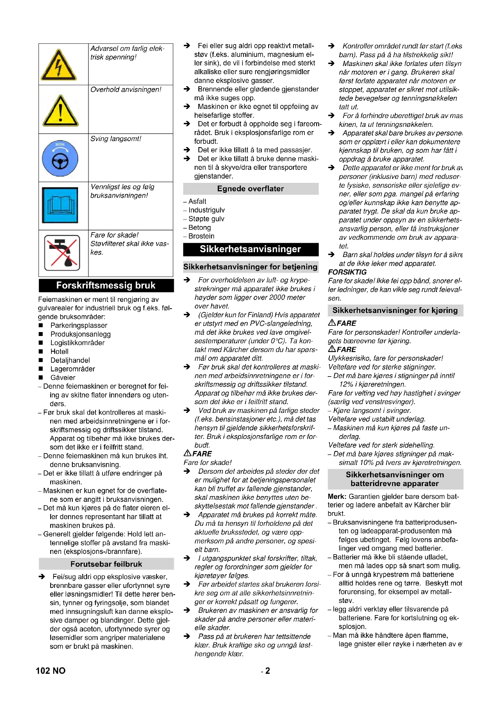 Generelle merknader Miljøvern Materialet i emballasjen kan re- sirkuleres. Ikke kast emballasjen i husholdningsavfallet, men lever den inn til resirkulering. Gamlle apparater inneholder ver- difulle materialer som kan gjen- brukes og som bør sendest til gjenbruk. Gamle maskiner skal derfor avhendes i egnede inn- samlingssystemer. Batterier, olje, drivstoff og lignende stoffer må ikke komme ut i miljøet. Slike stoffer skal avhendes via egnede gjenbrukssta- sjoner. Garanti Tilbehør og reservedeler Symboler i bruksanvisningen Symboler på maskinen Fare for brannskader fra varme overflater! Før ar- beid på maskinen, la dam- panlegget få avkjøle seg tilstrekkelig. Arbeid ved maskinen skal alltid utføres med egnede hansker. Fare for klemskader ved innklemming mellom be- vegelige kjøretøydeler. Fare for personskader fra bevegelige deler. Ikke stikk inn hånden. Brannfare. Brennene eller glødende gjenstander må ikke suges opp. Kjettingfaste / kranpunkt Løftepukt for jekk Maksimal vinkling mot bakken ved kjøring med løftet feieavfallsbeholder. Det må bare kjøres i stig- ninger på inntil 12% i kjø- reretningen. OBS Roterende børster (pass på rotasjonsretnin- gen). 101NO- 2 Feiemaskinen er ment til rengjøring av gulvarealer for industriell bruk og f.eks. føl- gende bruksområder: Parkeringsplasser Produksjonsanlegg Logistikkområder Hotell Detaljhandel Lagerområder Gåveier – Denne feiemaskinen er beregnet for fei- ing av skitne flater innendørs og uten- dørs. – Før bruk skal det kontrolleres at maski- nen med arbeidsinnretningene er i for- skriftsmessig og driftssikker tilstand. Apparat og tilbehør må ikke brukes der- som det ikke er i feilfritt stand. – Denne feiemaskinen må kun brukes iht. denne bruksanvisning. – Det er ikke tillatt å utføre endringer på maskinen. – Maskinen er kun egnet for de overflate- ne som er angitt i bruksanvisningen. – Det må kun kjøres på de flater eieren el- ler dennes representant har tillatt at maskinen brukes på. – Generelt gjelder følgende: Hold lett an- tennelige stoffer på avstand fra maski- nen (eksplosjons-/brannfare). Fei/sug aldri opp eksplosive væsker, brennbare gasser eller ufortynnet syre eller løsningsmidler! Til dette hører ben- sin, tynner og fyringsolje, som blandet med innsugningsluft kan danne eksplo- sive damper og blandinger. Dette gjel- der også aceton, ufortynnede syrer og løsemidler som angriper materialene som er brukt på maskinen. Fei eller sug aldri opp reaktivt metall- støv (f.eks. aluminium, magnesium el- ler sink), de vil i forbindelse med sterkt alkaliske eller sure rengjøringsmidler danne eksplosive gasser. Brennende eller glødende gjenstander må ikke suges opp. Maskinen er ikke egnet til oppfeiing av helsefarlige stoffer. Det er forbudt å oppholde seg i fareom- rådet. Bruk i eksplosjonsfarlige rom er forbudt. Det er ikke tillatt å ta med passasjer. Det er ikke tillatt å bruke denne maski- nen til å skyve/dra eller transportere gjenstander. – Asfalt – Industrigulv – Støpte gulv – Betong – Brostein For overholdelsen av luft- og krype- strekninger må apparatet ikke brukes i høyder som ligger over 2000 meter over havet. (Gjelder kun for Finland) Hvis apparatet er utstyrt med en PVC-slangeledning, må det ikke brukes ved lave omgivel- sestemperaturer (under 0°C). Ta kon- takt med Kärcher dersom du har spørs- mål om apparatet ditt. Før bruk skal det kontrolleres at maski- nen med arbeidsinnretningene er i for- skriftsmessig og driftssikker tilstand. Apparat og tilbehør må ikke brukes der- som det ikke er i feilfritt stand. Ved bruk av maskinen på farlige steder (f.eks. bensinstasjoner etc.), må det tas hensyn til gjeldende sikkerhetsforskrif- ter. Bruk i eksplosjonsfarlige rom er for- budt. FARE Fare for skade! Dersom det arbeides på steder der det er mulighet for at betjeningspersonalet kan bli truffet av fallende gjenstander, skal maskinen ikke benyttes uten be- skyttelsestak mot fallende gjenstander . Apparatet må brukes på korrekt måte. Du må ta hensyn til forholdene på det aktuelle bruksstedet, og være opp- merksom på andre personer, og spesi- elt barn. I utgangspunktet skal forskrifter, tiltak, regler og forordninger som gjelder for kjøretøyer følges. Før arbeidet startes skal brukeren forsi- kre seg om at alle sikkerhetsinnretnin- ger er korrekt påsatt og fungerer. Brukeren av maskinen er ansvarlig for skader på andre personer eller materi- elle skader. Pass på at brukeren har tettsittende klær. Bruk kraftige sko og unngå løst- hengende klær. Kontroller området rundt før start (f.eks. barn). Pass på å ha tilstrekkelig sikt! Maskinen skal ikke forlates uten tilsyn når motoren er i gang. Brukeren skal først forlate apparatet når motoren er stoppet, apparatet er sikret mot utilsik- tede bevegelser og tenningsnøkkelen tatt ut. For å forhindre uberettiget bruk av mas- kinen, ta ut tenningsnøkkelen. Apparatet skal bare brukes av personer som er opplært i eller kan dokumentere kjennskap til bruken, og som har fått i oppdrag å bruke apparatet. Dette apparatet er ikke ment for bruk av personer (inklusive barn) med reduser- te fysiske, sensoriske eller sjelelige ev- ner, eller som pga. mangel på erfaring og/eller kunnskap ikke kan benytte ap- paratet trygt. De skal da kun bruke ap- paratet under oppsyn av en sikkerhets- ansvarlig person, eller få instruksjoner av vedkommende om bruk av appara- tet. Barn skal holdes under tilsyn for å sikre at de ikke leker med apparatet. FORSIKTIG Fare for skade! Ikke fei opp bånd, snorer el- ler ledninger, de kan vikle seg rundt feieval- sen. FARE Fare for personskader! Kontroller underla- gets bæreevne før kjøring. FARE Ulykkesrisiko, fare for personskader! Veltefare ved for sterke stigninger. – Det må bare kjøres i stigninger på inntil 12% i kjøreretningen. Fare for velting ved høy hastighet i svinger (særlig ved venstresvinger). – Kjøre langsomt i svinger. Veltefare ve