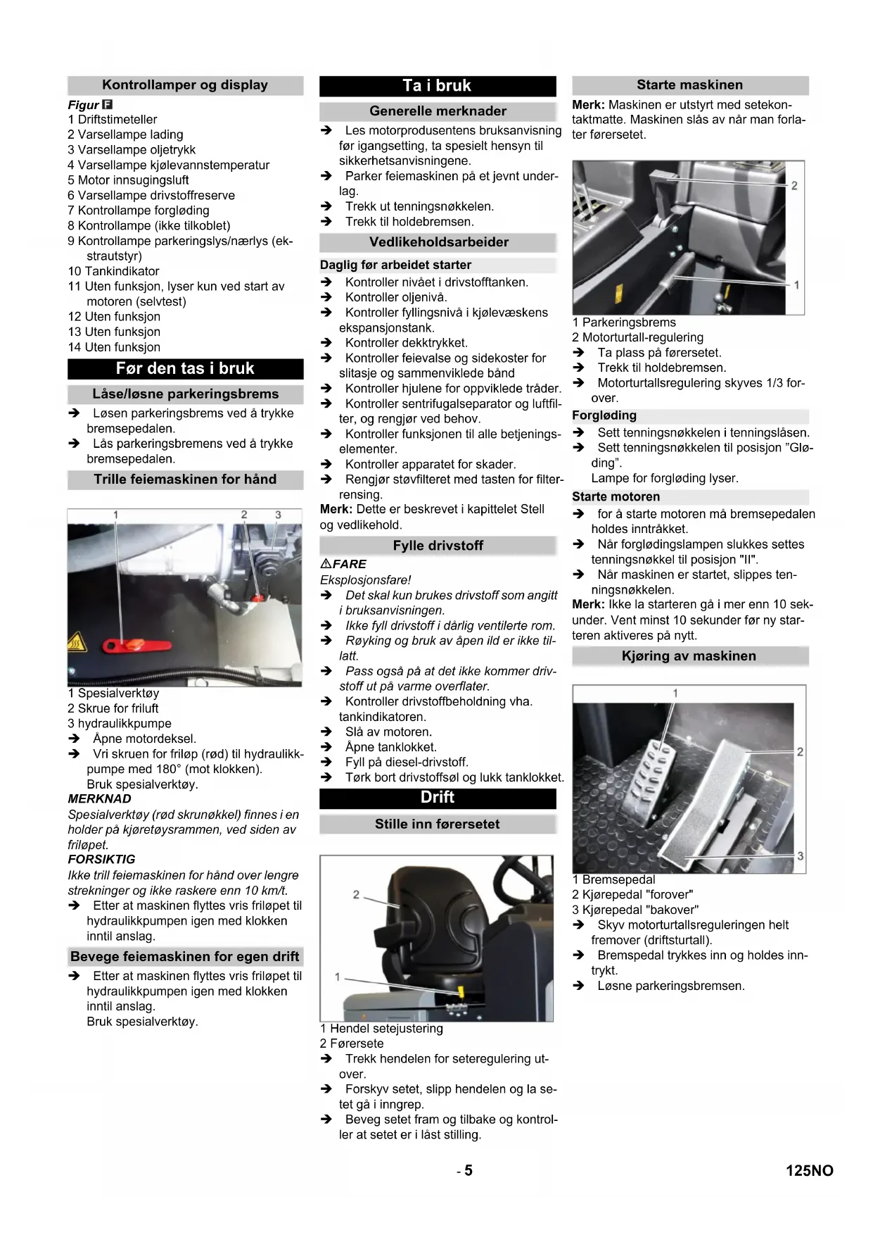 - Dersom det er montert ekstrautstyr er vekten enda høyere. 123NO- 4 Figur 1 Tanklokk 2 Sete (med kontaktmatte) 3 Ratt 4 Låsing apparatdeksel 5 Maskinhette 6 Arbeidslys foran (Valgmulighet) 7 Sidebørster, høyre 8 Fronthjul 9 Feievalse 10 Festepunkt for surring (4x) 11 Typeskilt 12 Sentrifugalseparator 13 Roterende varsellys 14 Høyre maskindeksel 15 Deksel, høyre 16 Bakbekledning 17 Arbeidslys bak (Valgmulighet) 18 Bakhjul 19 Deksel, venstre 20 Deksel venstre side (motordeksel) Figur 1 Holder 2 Betjeningsspak 3 Sikringer 4 Kontrollamper og display 5 Tenningslås 6 Funksjonstaster 7 Motorturtall-regulering Gasshendel 8 Parkeringsbrems 9 Viftehendel Figur 1 Bremsepedal 2 Gasspedal forover/bakover Figur 1 Tenningsnøkkel Glødesymbol : Forgløding Stilling 0: Slå av motor Stilling 1: Tenning på Stilling 2: Starte motoren 2 Rensing av filter 3 Horn Figur 1 Betjeningsspak feievalse 2 Betjeningsspak feieavfallsbeholder 3 Betjeningsspak sidebørster 4 Betjeningsspak beholderklaff Betjenings- og funksjonelementer Illustrasjon feiemaskin Valgfritt utstyr Vernetak for fører 2.851-686.0 Arbeidslys 2.852-082.0 Sidebørster, venstre 2.851-274.0 Betjeningspanel Pedaler Tenningslås/funksjonstaster Betjeningsspak 124 NO- 5 Figur 1 Driftstimeteller 2 Varsellampe lading 3 Varsellampe oljetrykk 4 Varsellampe kjølevannstemperatur 5 Motor innsugingsluft 6 Varsellampe drivstoffreserve 7 Kontrollampe forgløding 8 Kontrollampe (ikke tilkoblet) 9 Kontrollampe parkeringslys/nærlys (ek- strautstyr) 10 Tankindikator 11 Uten funksjon, lyser kun ved start av motoren (selvtest) 12 Uten funksjon 13 Uten funksjon 14 Uten funksjon Løsen parkeringsbrems ved å trykke bremsepedalen. Lås parkeringsbremens ved å trykke bremsepedalen. 1 Spesialverktøy 2 Skrue for friluft 3 hydraulikkpumpe Åpne motordeksel. Vri skruen for friløp (rød) til hydraulikk- pumpe med 180° (mot klokken). Bruk spesialverktøy. MERKNAD Spesialverktøy (rød skrunøkkel) finnes i en holder på kjøretøysrammen, ved siden av friløpet. FORSIKTIG Ikke trill feiemaskinen for hånd over lengre strekninger og ikke raskere enn 10 km/t. Etter at maskinen flyttes vris friløpet til hydraulikkpumpen igen med klokken inntil anslag. Etter at maskinen flyttes vris friløpet til hydraulikkpumpen igen med klokken inntil anslag. Bruk spesialverktøy. Les motorprodusentens bruksanvisning før igangsetting, ta spesielt hensyn til sikkerhetsanvisningene. Parker feiemaskinen på et jevnt under- lag. Trekk ut tenningsnøkkelen. Trekk til holdebremsen. Kontroller nivået i drivstofftanken. Kontroller oljenivå. Kontroller fyllingsnivå i kjølevæskens ekspansjonstank. Kontroller dekktrykket. Kontroller feievalse og sidekoster for slitasje og sammenviklede bånd Kontroller hjulene for oppviklede tråder. Kontroller sentrifugalseparator og luftfil- ter, og rengjør ved behov. Kontroller funksjonen til alle betjenings- elementer. Kontroller apparatet for skader. Rengjør støvfilteret med tasten for filter- rensing. Merk: Dette er beskrevet i kapittelet Stell og vedlikehold. FARE Eksplosjonsfare! Det skal kun brukes drivstoff som angitt i bruksanvisningen. Ikke fyll drivstoff i dårlig ventilerte rom. Røyking og bruk av åpen ild er ikke til- latt. Pass også på at det ikke kommer driv- stoff ut på varme overflater. Kontroller drivstoffbeholdning vha. tankindikatoren. Slå av motoren. Åpne tanklokket. Fyll på diesel-drivstoff. Tørk bort drivstoffsøl og lukk tanklokket. 1 Hendel setejustering 2 Førersete Trekk hendelen for seteregulering ut- over. Forskyv setet, slipp hendelen og la se- tet gå i inngrep. Beveg setet fram og tilbake og kontrol- ler at setet er i låst stilling. Merk: Maskinen er utstyrt med setekon- taktmatte. Maskinen slås av når man forla- ter førersetet. 1 Parkeringsbrems 2 Motorturtall-regulering Ta plass på førersetet. Trekk til holdebremsen. Motorturtallsregulering skyves 1/3 for- over. Sett tenningsnøkkelen i tenningslåsen. Sett tenningsnøkkelen til posisjon ”Glø- ding”. Lampe for forgløding lyser. for å starte motoren må bremsepedalen holdes inntråkket. Når forglødingslampen slukkes settes tenningsnøkkel til posisjon "II". Når maskinen er startet, slippes ten- ningsnøkkelen. Merk: Ikke la starteren gå i mer enn 10 sek- under. Vent minst 10 sekunder før ny star- teren aktiveres på nytt. 1 Bremsepedal 2 Kjørepedal "forover" 3 Kjørepedal "bakover" Skyv motorturtallsreguleringen helt fremover (driftsturtall). Bremspedal trykkes inn og holdes inn- trykt. Løsne parkeringsbremsen. Kontrollamper og display Før den tas i bruk Låse/løsne parkeringsbrems Trille feiemaskinen for hånd Bevege feiemaskinen for egen drift Ta i bruk Generelle merknader Vedlikeholdsarbeider Daglig før arbeidet starter Fylle drivstoff Drift Stille inn førersetet Starte maskinen Forgløding Starte motoren Kjøring av maskinen 125NO- 6 Trykk kjørepedal "forover" langsomt inn. FARE Fare for skade! Ved rygging skal det ikke være fare for tredjeperson, eventuelt må noen gi deg anvisninger Trykk kjørepedal "bakover" langsomt inn. Kjørehastigheten kan reguleres trinn- løst med kjørepedalen. Unngå rykkvis betjening av pedalen, da dette kan skade hydraulikkanlegget. Ved synkende effekt i stigninger må kjørepedalen tas litt tilbake. Slipp kjørepedalen, maskinen bremser automatisk og blir stående. Merk: Bremsevirkningen kan forsterkes ved å trykke på bremsepedalen. Kjøre over faste hindringer opp til 70 mm høyde: Kjør langsomt og forsiktig over hinderet. Faste hindringer over 70 mm høyde: Hindre må bare kjøres over med en eg- net rampe. FORSIKTIG Fei ikke pakktape, tråder eller noe lignende da dette kan føre til skader på feiemekanis- men. Merk: For å oppnå optimal rengjøring, bør kjørehastigheten tilpasses de aktuelle for- holdene. Merk: Støvfilteret bør tømmes med jevne mellomrom under drift. Merknad: Ved hyppige arbeider i finstøv- området må filteret rengjøres oftere. 1 Betjeningsspak feievalse 2 Be
