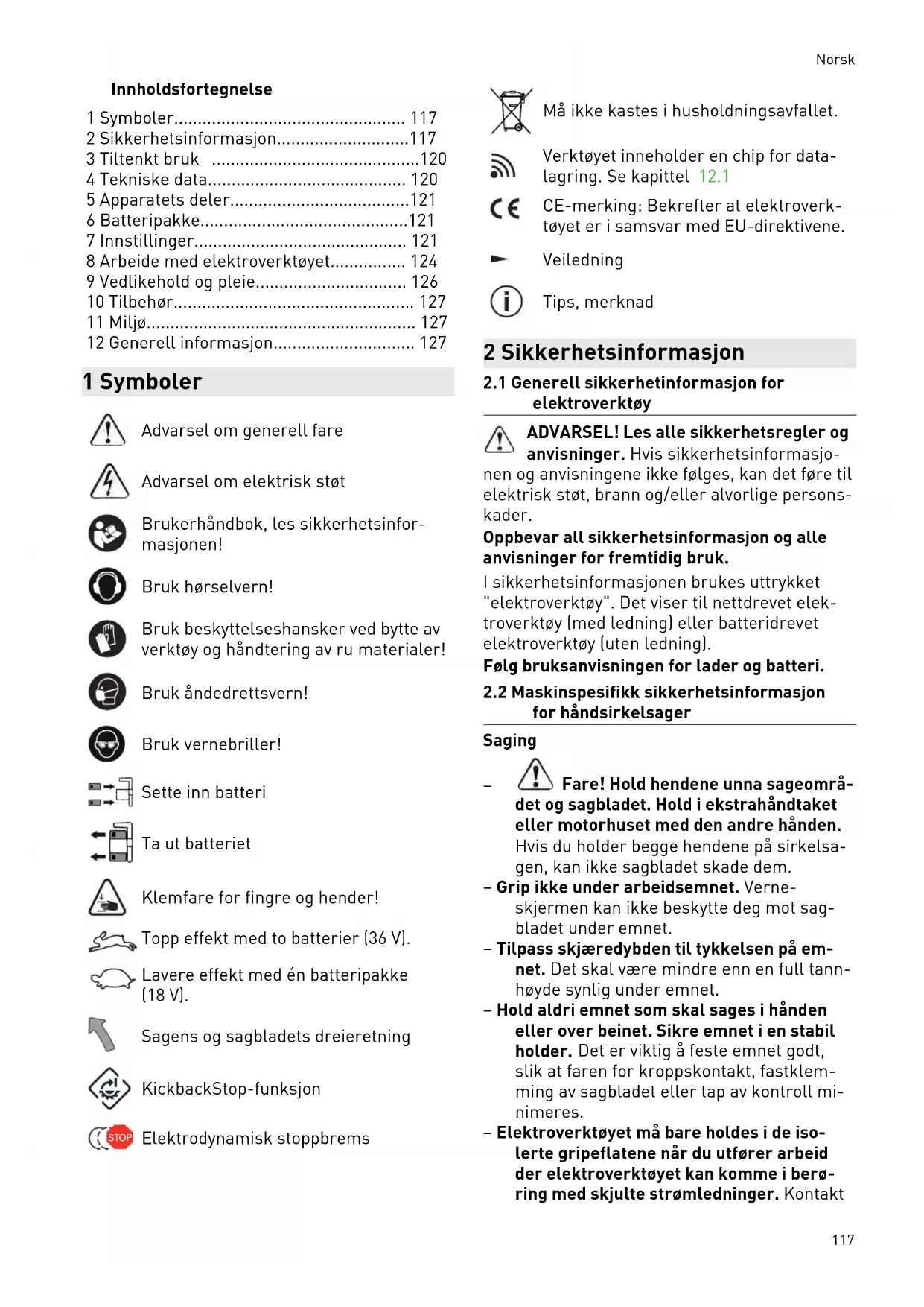 Fare! Hold hendene unna sageområ det og sagbladet. Hold i ekstrahåndtaket eller motorhuset med den andre hånden. Hvis du holder begge hendene på sirkelsa gen, kan ikke sagbladet skade dem. – Grip ikke under arbeidsemnet. Verne skjermen kan ikke beskytte deg mot sag bladet under emnet. – Tilpass skjæredybden til tykkelsen på em net. Det skal være mindre enn en full tann høyde synlig under emnet. – Hold aldri emnet som skal sages i hånden eller over beinet. Sikre emnet i en stabil holder. Det er viktig å feste emnet godt, slik at faren for kroppskontakt, fastklem ming av sagbladet eller tap av kontroll mi nimeres. – Elektroverktøyet må bare holdes i de iso lerte gripeflatene når du utfører arbeid der elektroverktøyet kan komme i berø ring med skjulte strømledninger. Kontakt Norsk 117med en spenningsførende ledning setter også metalldelene på elektroverktøyet un der spenning og gir elektrisk støt. – Bruk alltid et anslag eller en rett kantfø ring ved skjæring på langs. Dette forbed rer skjærenøyaktigheten og reduserer mu ligheten for at sagbladet kommer i klem. – Bruk alltid sagblad i riktig størrelse og med passende festeåpning (f.eks. stjerne formet eller rund). Sagblader som ikke passer til monteringsdelene på sagene, vil rotere ujevnt og føre til tap av kontroll. – Bruk aldri skadde eller feil sagbladspenn flenser eller -skruer. Sagbladspennflen sene og -skruene er konstruert spesielt til din sag for å gi optimal ytelse og driftssik kerhet. Rekyl - årsak, og sikkerhetsanvisninger i til knytning til dette – En rekyl er en plutselig reaksjon fra et sag blad som har huket eller klemt seg fast el ler er i feilstilling. Rekyl fører til at sagen løfter seg ukontrollert fra arbeidsemnet og mot brukeren; – hvis sagbladet setter seg fast i en sages palte som opphører, blokkeres det og mo torkraften slår apparatet mot brukeren; – hvis sagbladet blir fordreid i kuttet eller kommer i feil stilling, kan tennene i det bakre området av sagbladet sette seg fast i arbeidsemnet, noe som fører til at sagbla det fyker ut av sagespalten og mot bruke ren. Rekyl skyldes feil bruk av sagen. Det kan unn gås ved at man følger egnede sikkerhetstiltak som de nedenfor. – Hold sagen med begge hender og hold ar mene i en stilling som kan motvirke rekyl kreftene. Hold alltid sagbladet litt til siden for deg, aldri på linje med kroppen din. Ved rekyl kan sirkelsagen sprette bakover, men brukeren kan gjennom egnede tiltak takle rekylkreftene. – Hvis sagbladet kommer i klem eller du må avbryte arbeidet, må du slippe på/av-bry teren og holde sagen stødig i arbeidsem net til sagbladet står helt stille. Prøv aldri å ta sagen ut av arbeidsemnet eller trekke den bakover så lenge sagbladet er i beve gelse, ellers kan det oppstå rekyl. Finn og utbedre årsaken til at sagbladet kom i klem. – Hvis du vil starte en sag som står i ar beidsemnet, må du sentrere sagbladet i sagesporet og kontrollere at sagtennene ikke står fast i arbeidsemnet. Hvis sagbla det er i klem, kan det bevege seg ut av verktøyet eller forårsake rekyl når sagen startes på nytt. – Støtt opp store plater for å unngå fare for tilbakeslag på grunn av et sagblad som kommer i klem. Store plater kan bøye seg under sin egen vekt. Støtt derfor opp plate ne på begge sider, både i nærheten av sag esporet og langs kanten. – Ikke bruk sløve eller skadde sagblader. Sagblader med sløve eller feiljusterte ten ner forårsaker økt friksjon, at sagbladet kommer i klem og rekyl på grunn av for smalt sagespor. – Før sagingen må du stramme til skjære dybde- og skjærevinkelinnstillingene. Dersom innstillingene endrer seg under sagingen, kan sagbladet sette seg fast og forårsake rekyl. – Vær spesielt forsiktig ved "dykkutt" i eksi sterende vegger eller andre områder du ikke kan se. Sagblader som dykker ned i arbeidsemnet, kan blokkeres av skjulte ob jekter i områder du ikke kan se, og forårsa ke rekyl. Verneskjermens funksjon – Hver gang før bruk må du kontrollere at verneskjermen lukkes som den skal. Ikke bruk sagen hvis verneskjermen ikke beve ges fritt og ikke lukkes umiddelbart. Du må aldri klemme fast eller binde fast ver neskjermen. I så fall vil sagbladet være ubeskyttet. Hvis du uforvarende mister sagen i gulvet, kan verneskjermen bli bøyd. Påse at verneskjermen beveges fritt og ik ke kommer i berøring med sagbladet eller andre deler i noen som helst skjærevinkler og -dybder. – Kontroller tilstanden og funksjonen til fjæren i verneskjermen. Gjennomfør ved likehold på apparatet før bruk dersom verneskjerm og fjær ikke fungerer som de skal. Skadde deler, klistrende avleiringer eller oppsamling av spon fører til at verne skjermen reagerer tregt. – Ved "dykkutt" som ikke utføres i rett vin kel, må du sikre grunnplaten mot å for skyves. Forskyvning til siden føre til at sag bladet klemmes fast og det kan oppstå re kyl. – Ikke legg sagen på arbeidsbenken eller gulvet uten at verneskjermen dekker sag bladet. Et ubeskyttet sagblad som ikke har stanset helt, beveger sagen mot sageret Norsk 118ningen og sager det som står i veien for den. Ta hensyn til sagens etterløpstid. Funksjonsdyktig kile [1-21] (KickbackStop- funksjon) – Hver du skifter sagblad, må du rengjøre følerenheten [5-4] med blåsing eller pen sel. Dersom følerenheten blir tilsmusset, kan dette ha negativ innvirkning på Kick backStop-funksjonen og hindre bremsing av sagbladet. – Ikke bruk sagen dersom kilen er bøyd. Selv en liten skade kan sinke bremsingen av sagbladet.