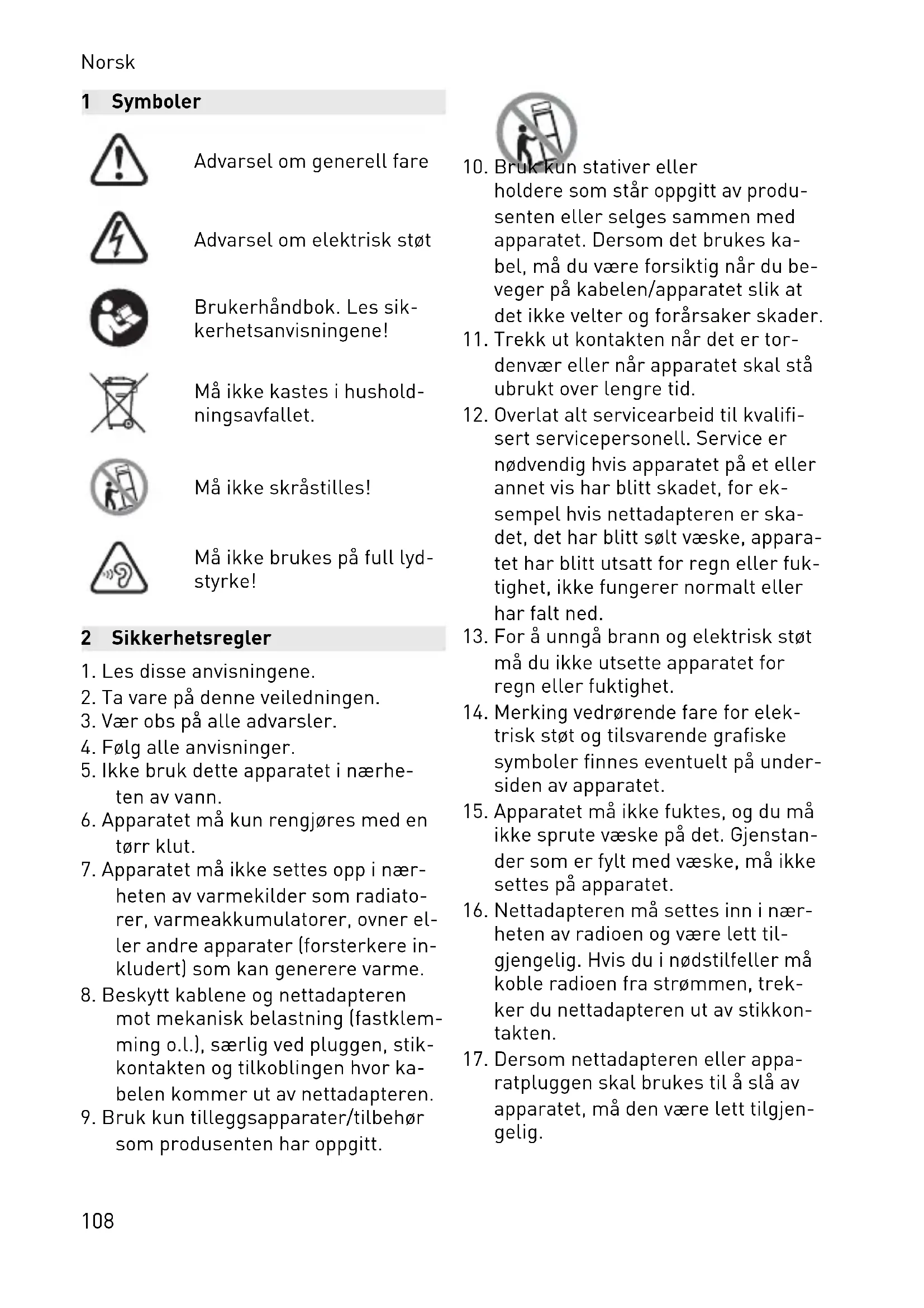 sert servicepersonell. Service er nødvendig hvis apparatet på et eller annet vis har blitt skadet, for ek sempel hvis nettadapteren er ska det, det har blitt sølt væske, appara tet har blitt utsatt for regn eller fuk tighet, ikke fungerer normalt eller har falt ned.