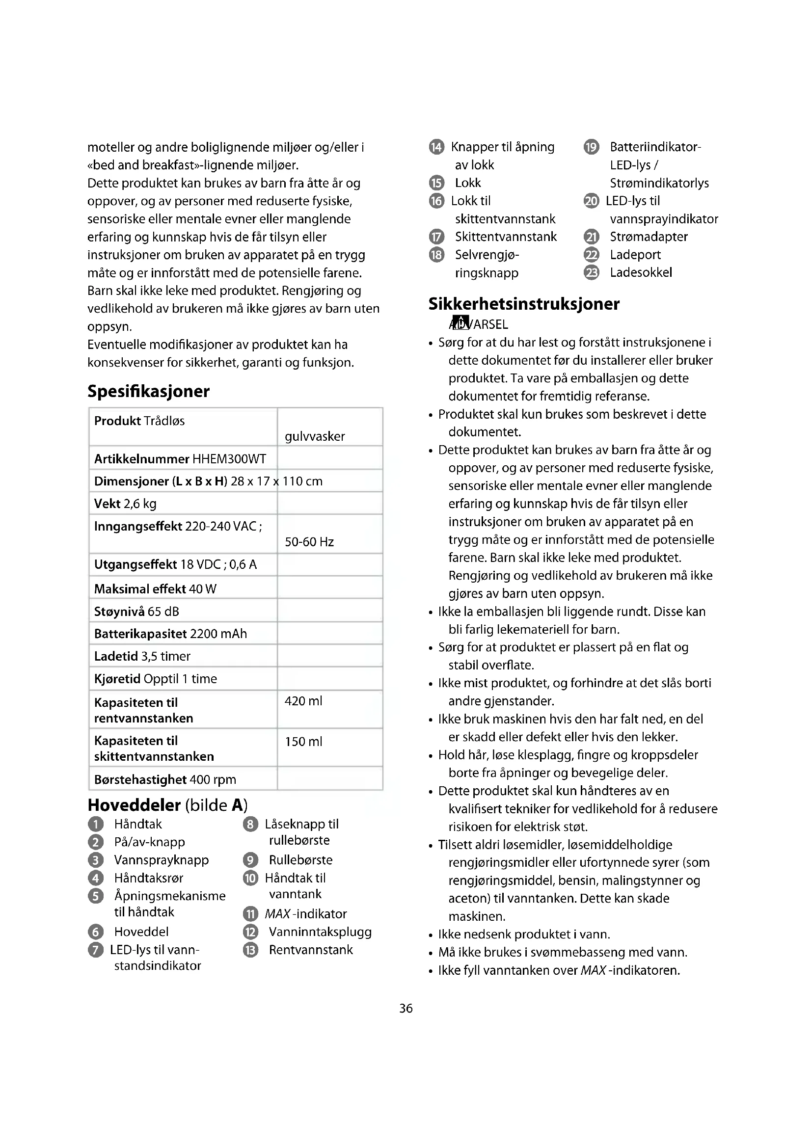 - Ikke fyll vanntanken over MAX -indikatoren. moteller og andre boliglignende miljøer og/eller i «bed and breakfast»-lignende miljøer. Dette produktet kan brukes av barn fra åtte år og oppover, og av personer med reduserte fysiske, sensoriske eller mentale evner eller manglende erfaring og kunnskap hvis de får tilsyn eller instruksjoner om bruken av apparatet på en trygg måte og er innforstått med de potensielle farene. Barn skal ikke leke med produktet. Rengjøring og vedlikehold av brukeren må ikke gjøres av barn uten oppsyn. Eventuelle modikasjoner av produktet kan ha konsekvenser for sikkerhet, garanti og funksjon. Spesikasjoner Produkt Trådløs gulvvasker Artikkelnummer HHEM300WT Dimensjoner (L x B x H) 28 x 17 x 110 cm Vekt 2,6 kg Inngangseekt 220-240 VAC ; 50-60 Hz Utgangseekt 18 VDC ; 0,6 A Maksimal eekt 40 W Støynivå 65 dB Batterikapasitet 2200 mAh Ladetid 3,5 timer Kjøretid Opptil 1 time Kapasiteten til rentvannstanken 420 ml Kapasiteten til skittentvannstanken 150 ml Børstehastighet 400 rpm Hoveddeler (bilde A) 1 Håndtak 2 På/av-knapp 3 Vannsprayknapp 4 Håndtaksrør 5 Åpningsmekanisme til håndtak 6 Hoveddel 7 LED-lys til vann- standsindikator 8 Låseknapp til rullebørste 9 Rullebørste q Håndtak til vanntank w MAX -indikator e Vanninntaksplugg r Rentvannstank37