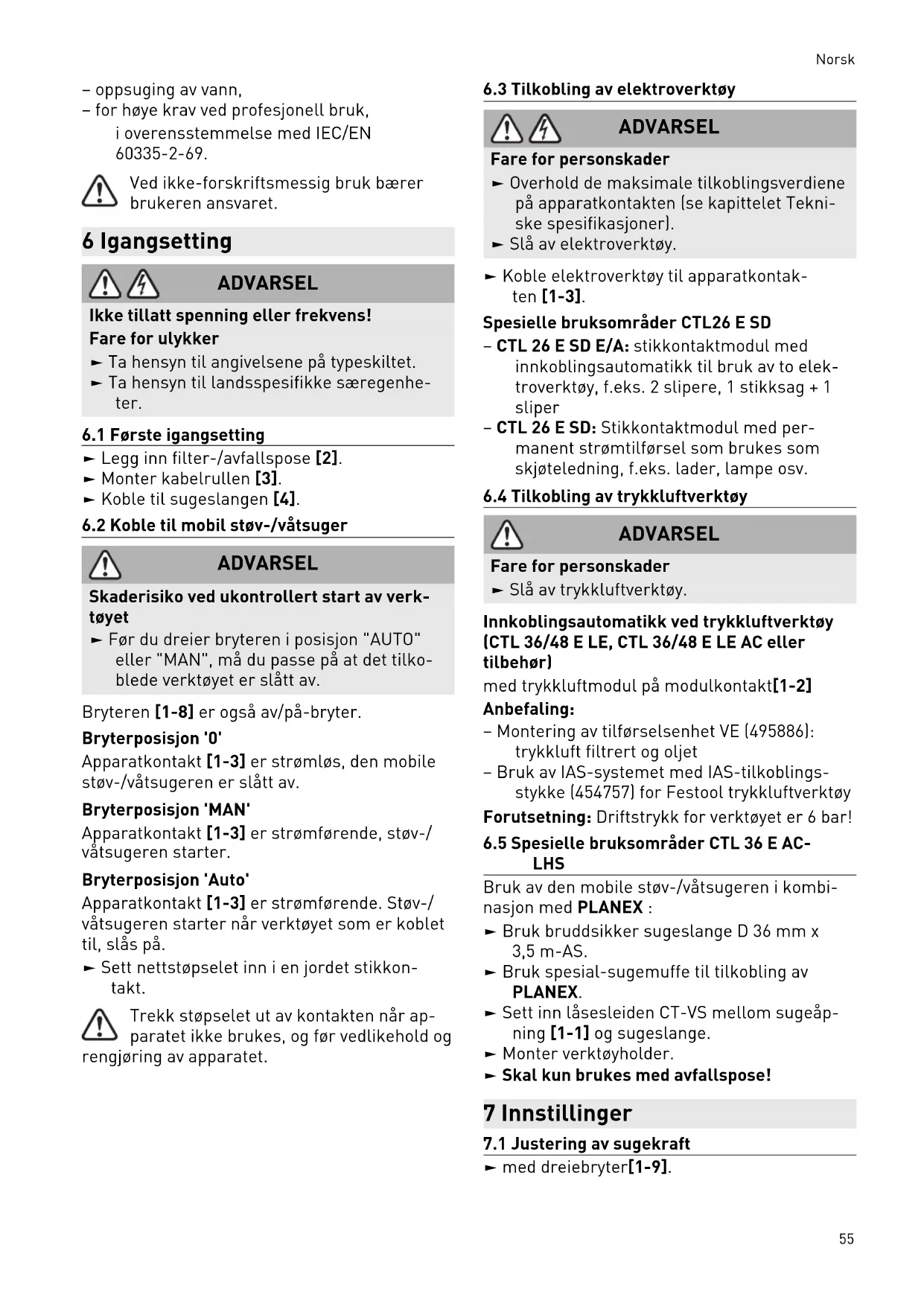 LHS Bruk av den mobile støv-/våtsugeren i kombi nasjon med PLANEX : ► Bruk bruddsikker sugeslange D 36 mm x 3,5 m-AS. ► Bruk spesial-sugemuffe til tilkobling av PLANEX. ► Sett inn låsesleiden CT-VS mellom sugeåp ning [1-1] og sugeslange. ► Monter verktøyholder. ► Skal kun brukes med avfallspose! 7 Innstillinger