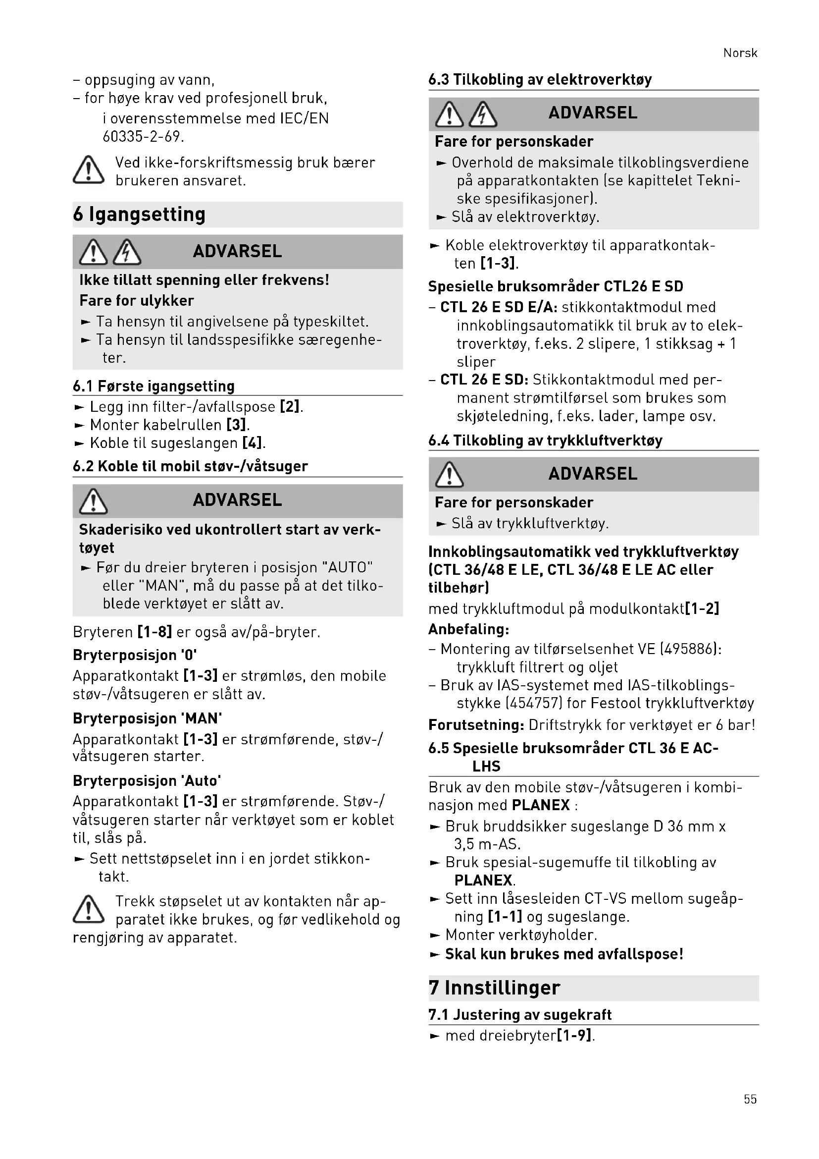CH, DK GB 230 V / 110 V 2400 W 1100 W 1800 W / 500 W Volumstrøm (luft) maks., suger/turbin 130 m³/h / 234 m³/h Undertrykk, maks., turbin 24000 Pa Filteroverflate 6318 cm² Sugeslange D 27/32 mm x 3,5 m-AS Lengde på strømkabelen 7,5 m Lydtrykknivå iht. EN 60704-2-1/ Usikkerhet K 71 dB (A) / 3 dB Beskyttelsesgrad IP X4 Beholdervolum CTL 26 E, CTL 26 E AC, CTL 26 E SD 26 l CTL 36 E, CTL 36 E LE, CTL 36 E AC, CTL 36 E LE AC, CTL 36 E AC-LHS 36 l CTL 48 E, CTL 48 E LE, CTL 48 E AC, CTL 48 E LE AC 48 l Mål L x B x H CTL 26 E, CTL 26 E AC, CTL 26 E SD 630 x 365 x 540 mm CTL 36 E, CTL 36 E LE, CTL 36 E AC, CTL 36 E LE AC, CTL 36 E AC-LHS 630 x 365 x 596 mm CTL 48 E, CTL 48 E LE, CTL 48 E AC, CTL 48 E LE AC 740 x 406 x 1005 mm Vekt CTL 26 E, CTL 26 E SD 13,9 kg CTL 36 E, CTL 36 E LE 14,4 kg CTL 48 E, CTL 48 E LE 18,8 kg CTL 26 E AC 14,7 kg CTL 36 E AC, CTL 36 E LE AC, CTL 36 E AC-LHS 15,2 kg CTL 48 E AC, CTL 48 E LE AC 19,6 kg 5 Riktig bruk Mobil støv-/våtsuger egnet til – opp- og avsuging av støv opptil 1 mg/m³ i henhold til støvklasse ’L’, Norsk 54– oppsuging av vann, – for høye krav ved profesjonell bruk, i overensstemmelse med IEC/EN 60335-2-69. Ved ikke-forskriftsmessig bruk bærer brukeren ansvaret. 6 Igangsetting ADVARSEL Ikke tillatt spenning eller frekvens! Fare for ulykker ► Ta hensyn til angivelsene på typeskiltet. ► Ta hensyn til landsspesifikke særegenhe ter.