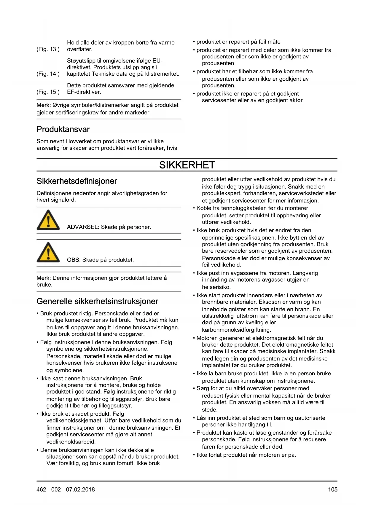 Symboler på produktet (Fig. 2 ) ADVARSEL! Dette produktet er farlig. Brukeren eller personer i nærheten kan rammes av personskade eller død dersom produktet ikke brukes forsiktig og korrekt. Les og følg alle sikkerhetsinstruksjonene i brukerhåndboken for å forhindre personskade på brukeren eller personer i nærheten. (Fig. 3 ) Les nøye gjennom bruksanvisningen og sørg for at du har forstått instruksjonene før bruk. (Fig. 4 ) Bruk vernehjelm på steder der gjenstander kan falle ned på deg. Bruk godkjent hørselsvern. Bruk godkjent øyevern. (Fig. 5 ) Bruk godkjente vernehansker. (Fig. 6 ) Bruk kraftige, sklisikre støvler. (Fig. 7 ) Produktet kan kaste ut objekter, noe som kan føre til skader. (Fig. 8 ) Maksimal hastighet for den utgående akselen. (Fig. 9 ) Hold produktet minst 15 m unna personer og dyr når du bruker det. (Fig. 10 ) Det er en fare for klingekast dersom skjæreutstyret berører et objekt som ikke umiddelbart lar seg klippe. Produktet kan skjære av kroppsdeler. Hold produktet minst 15 m unna personer og dyr når du bruker det. (Fig. 11 ) Pumpe (blære). (Fig. 12 ) Choke: Still chokehendelen i choke-stilling. 104 462 - 002 - 07.02.2018(Fig. 13 ) Hold alle deler av kroppen borte fra varme overflater. (Fig. 14 ) Støyutslipp til omgivelsene ifølge EU- direktivet. Produktets utslipp angis i kapittelet Tekniske data og på klistremerket. (Fig. 15 ) Dette produktet samsvarer med gjeldende EF-direktiver. Merk: Øvrige symboler/klistremerker angitt på produktet gjelder sertifiseringskrav for andre markeder. Produktansvar Som nevnt i lovverket om produktansvar er vi ikke ansvarlig for skader som produktet vårt forårsaker, hvis