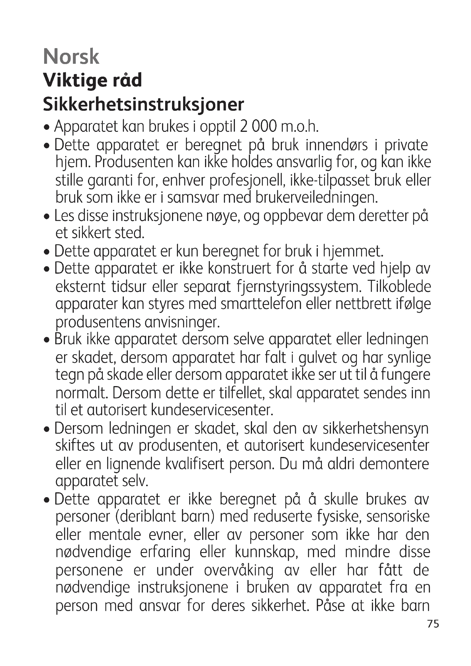 - Dette apparatet kan brukes av barn som er 8 år eller eldre, av personer som mangler erfaring eller kjennskap til det, eller av personer med reduserte fysiske, sensoriske eller mentale evner hvis de har fått opplæring og er kjent med bruken av apparatet på en trygg måte. Barn skal ikke leke med apparatet. Rengjøring og alminnelig vedlikehold utført av brukeren skal ikke utføres av barn med mindre de er 8 år eller eldre og under oppsyn. Apparatet og strømledningen må holdes utenfor rekkevidde for barn som er yngre enn 8 år.