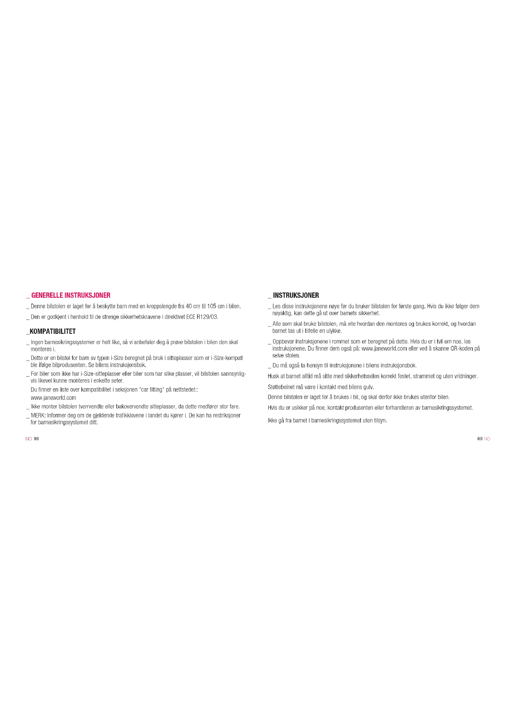 _ GENERELLE INSTRUKSJONER _ Denne bilstolen er laget for å beskytte barn med en kroppslengde fra 40 cm til 105 cm i bilen. _ Den er godkjent i henhold til de strenge sikkerhetskravene i direktivet ECE R129/03. _KOMPATIBILITET _ Ingen barnesikringssystemer er helt like, så vi anbefaler deg å prøve bilstolen i bilen den skal monteres i. _ Dette er en bilstol for barn av typen i-Size beregnet på bruk i sitteplasser som er i-Size-kompati ble ifølge bilprodusenten. Se bilens instruksjonsbok. _ For biler som ikke har i-Size-sitteplasser eller biler som har slike plasser, vil bilstolen sannsynlig- vis likevel kunne monteres i enkelte seter. Du finner en liste over kompatibilitet i seksjonen ”car fitting” på nettstedet:: www.janeworld.com _ Ikke monter bilstolen tverrvendte eller bakovervendte sitteplasser, da dette medfører stor fare. _ MERK: Informer deg om de gjeldende trafikklovene i landet du kjører i. De kan ha restriksjoner for barnesikringssystemet ditt. _ INSTRUKSJONER _ Les disse instruksjonene nøye før du bruker bilstolen for første gang. Hvis du ikke følger dem nøyaktig, kan dette gå ut over barnets sikkerhet. _ Alle som skal bruke bilstolen, må vite hvordan den monteres og brukes korrekt, og hvordan barnet tas ut i tilfelle en ulykke. _ Oppbevar instruksjonene i rommet som er beregnet på dette. Hvis du er i tvil om noe, les instruksjonene. Du finner dem også på: www.janeworld.com eller ved å skanne QR-koden på selve stolen. _ Du må også ta hensyn til instruksjonene i bilens instruksjonsbok. Husk at barnet alltid må sitte med sikkerhetsselen korrekt festet, strammet og uten vridninger. Støttebeinet må være i kontakt med bilens gulv. Denne bilstolen er laget for å brukes i bil, og skal derfor ikke brukes utenfor bilen. Hvis du er usikker på noe, kontakt produsenten eller forhandleren av barnesikringssystemet. Ikke gå fra barnet i barnesikringssystemet uten tilsyn.91