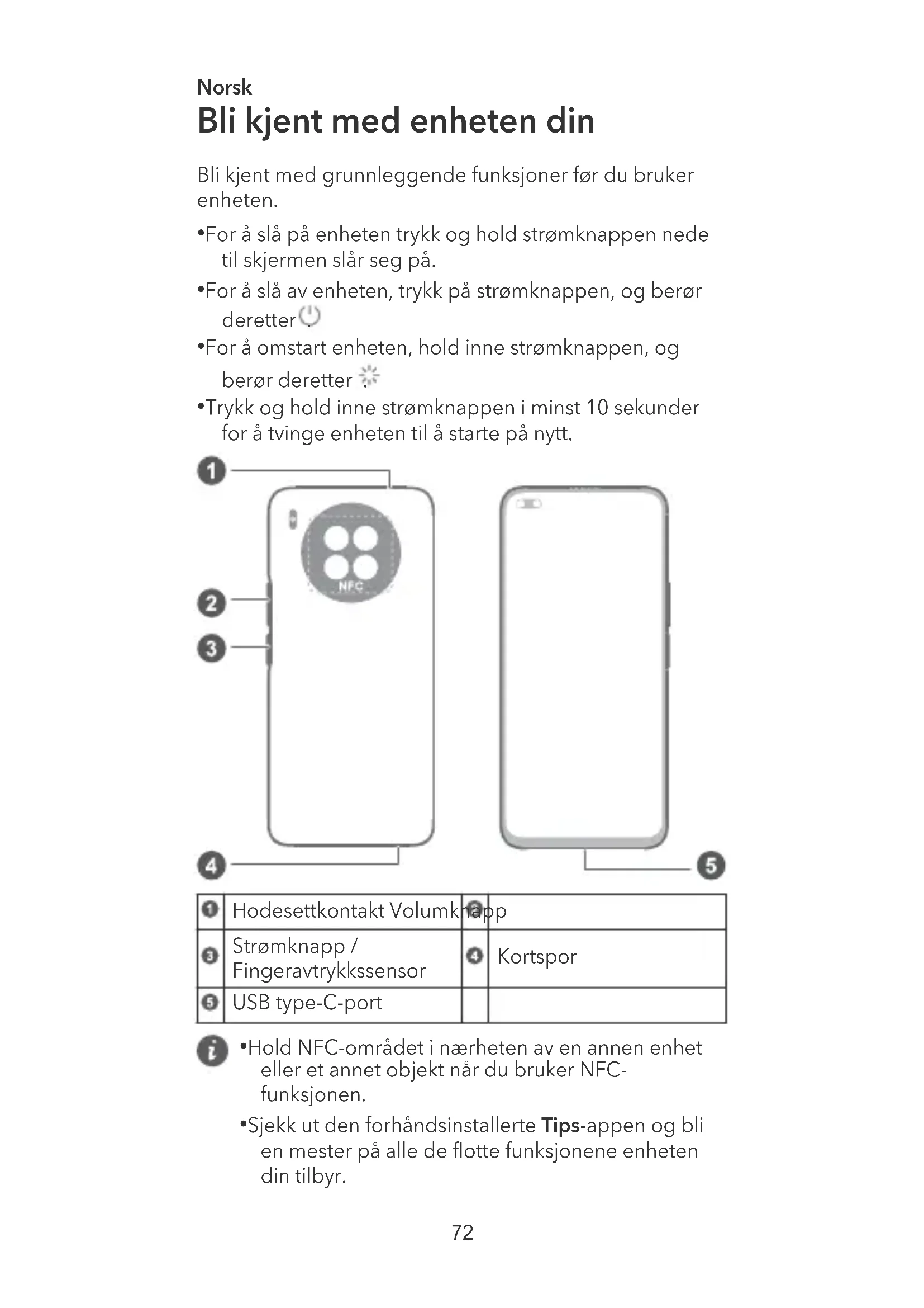 - Sjekk ut den forhåndsinstallerte Tips-appen og bli en mester på alle de otte funksjonene enheten din tilbyr. 72Komme i gang