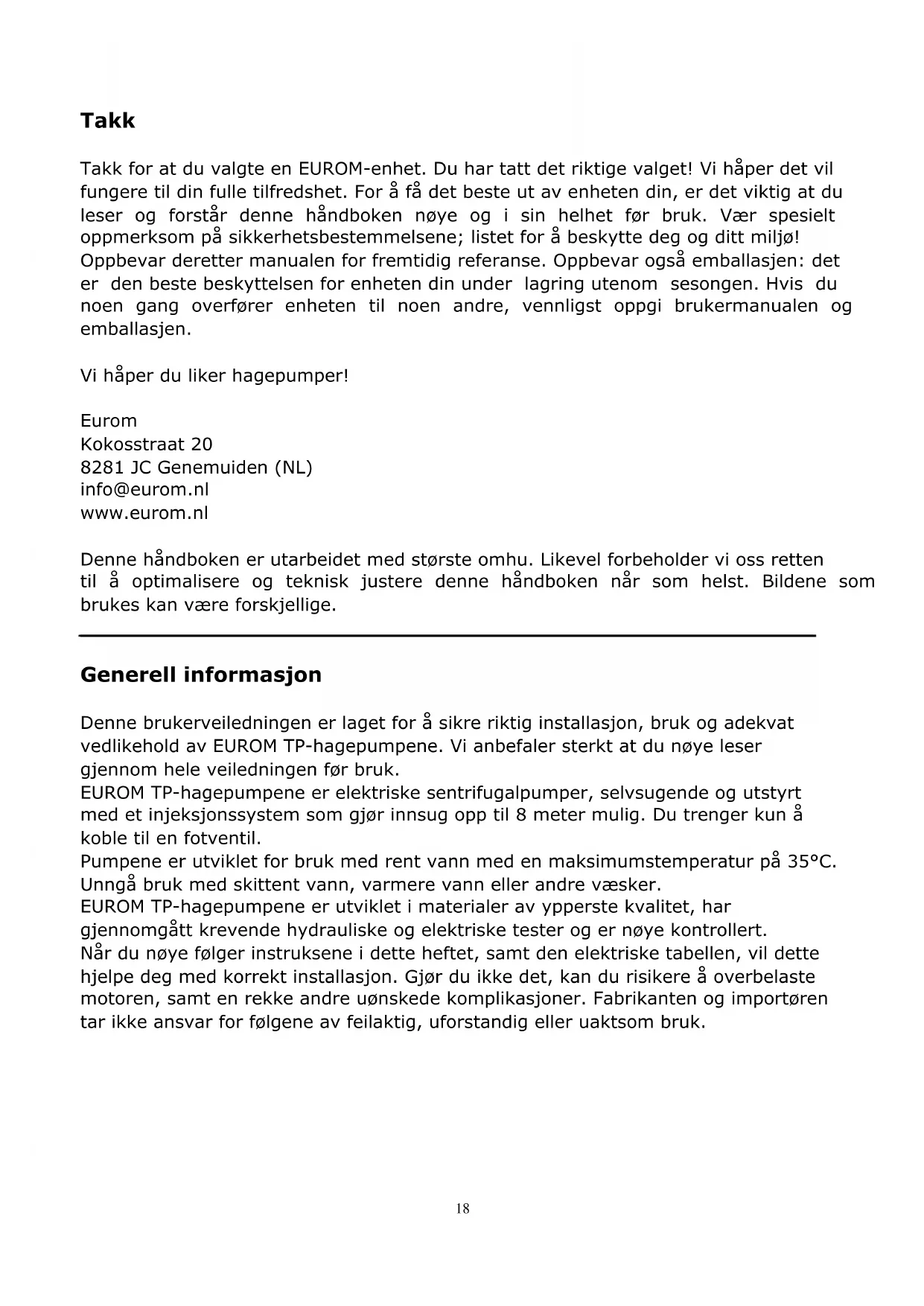 Generell informasjon Denne brukerveiledningen er laget for å sikre riktig installasjon, bruk og adekvat vedlikehold av EUROM TP-hagepumpene. Vi anbefaler sterkt at du nøye leser gjennom hele veiledningen før bruk. EUROM TP-hagepumpene er elektriske sentrifugalpumper, selvsugende og utstyrt med et injeksjonssystem som gjør innsug opp til 8 meter mulig. Du trenger kun å koble til en fotventil. Pumpene er utviklet for bruk med rent vann med en maksimumstemperatur på 35°C. Unngå bruk med skittent vann, varmere vann eller andre væsker. EUROM TP-hagepumpene er utviklet i materialer av ypperste kvalitet, har gjennomgått krevende hydrauliske og elektriske tester og er nøye kontrollert. Når du nøye følger instruksene i dette heftet, samt den elektriske tabellen, vil dette hjelpe deg med korrekt installasjon. Gjør du ikke det, kan du risikere å overbelaste motoren, samt en rekke andre uønskede komplikasjoner. Fabrikanten og importøren tar ikke ansvar for følgene av feilaktig, uforstandig eller uaktsom bruk.19 Tekniske opplysninger Type TP800P TP800R TP1200R Kraft 800W 800W 1200W Maks. kapasitet 53 l/m 53 l/m 63 l/m Maks. leveringshøyde 40m 40m 48m Maks. innsugingshøyde