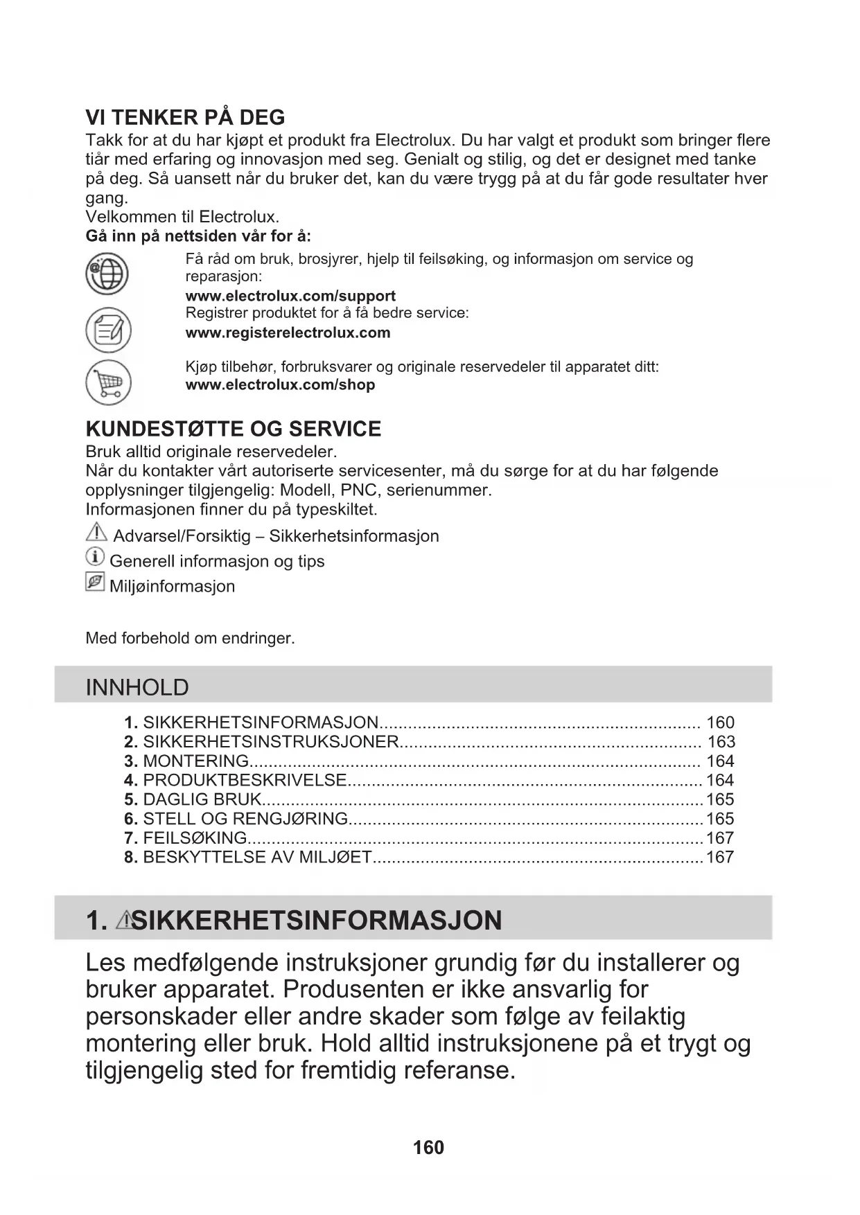 Takk for at du har kjøpt et produkt fra Electrolux. Du har valgt et produkt som bringer fleretiår med erfaring og innovasjon med seg. Genialt og stilig, og det er designet med tankepå deg. Så uansett når du bruker det, kan du være trygg på at du får gode resultater hvergang.Velkommen til Electrolux.Gå inn på nettsiden vår for å:Få råd om bruk, brosjyrer, hjelp til feilsøking, og informasjon om service ogreparasjon:www.electrolux.com/supportRegistrer produktet for å få bedre service:www.registerelectrolux.comKjøp tilbehør, forbruksvarer og originale reservedeler til apparatet ditt:www.electrolux.com/shop