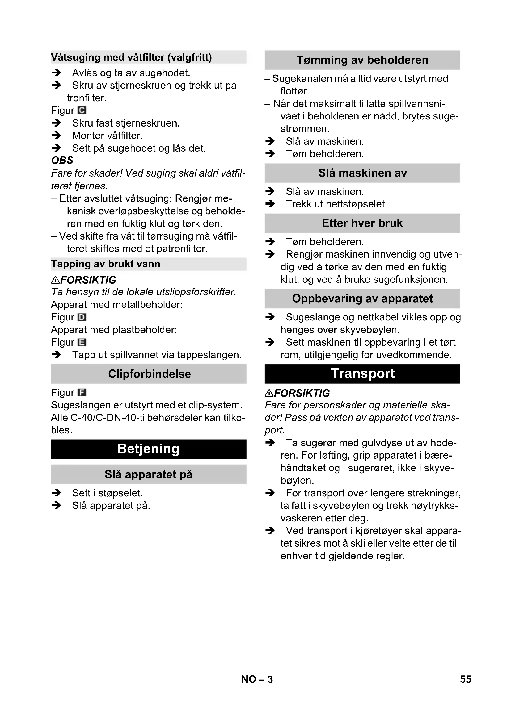 Partnr. Kabellængde EU 6.647-069.0 10 m GB 6.649-803.0 10 m 52 DA– 1 Før første gangs bruk av appa- ratet, les denne originale bruks- anvisningen, følg den og oppbevar den for senere bruk eller for overlevering til neste eier. – Det er tvingende nødvendig å lese sik- kerhetsinstruksene nr. 5.956-249 før maskinen settes i drift! – Hvis bruksanvisningen og sikkerhets- anvisningene ikke følges, kan dette medføre skader på apparatet og fare for brukeren og andre personer. – Informer straks forhandleren ved trans- portskader. Anvisninger om innhold (REACH) Aktuell informasjon om stoffene i innholdet finner du under: www.kaercher.com/REACH FARE Anvisning om en umiddelbar truende fare som kan føre til store personskader eller til død. 몇 ADVARSEL Anvisning om en mulig farlig situasjon som kan føre til store personskader eller til død. 몇 FORSIKTIG Anvisning om en mulig farlig situasjon som kan føre til mindre personskader. OBS Anvisning om en mulig farlig situasjon som kan føre til materielle skader. 몇 ADVARSEL Maskinen er ikke egnet til oppsuging av helsefarlig støv. – Denne maskinen er beregnet for våt- og tørr-rengjøring av gulv- og veggflater. – Dette apparatet er egnet for kommersi- ell og industriell bruk, f.eks. i verkste- der, industribedrifter, skoler og hoteller. – Romtemperaturen må ikke overskrive 40 °C. – Apparatet skal veie maksimalt 100 kg med last. Innholdsfortegnelse Miljøvern . . . . . . . . . . . . . . . . . NO 1 Risikotrinn . . . . . . . . . . . . . . . . NO 1 Forskriftsmessig bruk . . . . . . . NO 1 Maskinorganer . . . . . . . . . . . . NO 2 Ta i bruk . . . . . . . . . . . . . . . . . NO 2 Betjening . . . . . . . . . . . . . . . . . NO 3 Transport. . . . . . . . . . . . . . . . . NO 3 Lagring . . . . . . . . . . . . . . . . . . NO 4 Pleie og vedlikehold . . . . . . . . NO 4 Feilretting . . . . . . . . . . . . . . . . NO 4 Garanti . . . . . . . . . . . . . . . . . . NO 4 Tilbehør og reservedeler. . . . . NO 5 EU-samsvarserklæring . . . . . . NO 5 Tekniske data . . . . . . . . . . . . . NO 6 Miljøvern Materialet i emballasjen kan re- sirkuleres. Ikke kast emballasjen i husholdningsavfallet, men le- ver den inn til resirkulering. Gamle apparater inneholder ver- difulle materialer som kan resir- kuleres. Disse bør leveres inn til gjenvinning. Batterier, olje og lig- nende stoffer må ikke komme ut i miljøet. Gamle maskiner skal derfor avhendes i egnede inn- samlingssystemer. Risikotrinn Forskriftsmessig bruk 53NO– 2 1 Stjerneskrue 2 Patronfilter 3 Mekanisk overløpsbeskyttelse 4 Sugehode 5 Sugeslange 6 Skyvebøyle 7 Kabelkroker 8 Låsing av sugehode 9 Smussbeholder 10 Sugestusser 11 Styrerulle 12 Understell 13 Understellshåndtak 14 Gulvmunnstykke 15 Sugerør 16 Bærehåndtak 17 Bøyd rørstykke 18 Apparatbryter sugeturbin 2 19 Apparatbryter sugeturbin 1 20 Apparatbryter sugeturbin 3 21 Holder for gulvdyse 22 Avtappingsslange 23 Holder for sugerør 24 Holder for fugedyse 25 Nettledning 26 Typeskilt OBS Maksimalt tillatt nettimpedans på det elek- triske tilkoblingspunktet (se tekniske data) skal ikke overskrides. Dersom det er uklar- heter om nettimpedansen på tilkoblings- punktet ditt, vennligst kontakt strømleve- randøren for informasjon. OBS Fare for skader! Ved suging skal patronfil- teret aldri fjernes. – Ved suging av fint støv kan man i tillegg bruke en papirfilterpose eller et mem- branfilter (ekstratilbehør). Figur Avlås og ta av sugehodet. Papirfilterpose eller membranfilter (ek- stratilbehør) settes på. Sett på sugehodet og lås det. Figur Demontere børstestriper. Monter gummilepper. Merk: Den strukturert siden av gummilep- pene skal peke utover. – Ved suging av våt smuss må papirfilter- posen eller membranfilteret (ekstratil- behør) alltid tas av. – Det anbefales å bruke en spesialfilter- pose (våt) (se Filtersystemer). OBS Fare for skader! Ved suging skal patronfil- teret aldri fjernes. – Etter avsluttet våtsuging: Rengjør me- kanisk overløpsbeskyttelse og beholde- ren med en fuktig klut og tørk den. – Ved umiddelbar skifte fra våt til tørrsu- ging må det våte patronfilteret skiftes med et tørt. Maskinorganer Ta i bruk Strømtilkobling Støvsuging Montering papirfilterpose (ekstrautstyr) Våtsuging Montering av gummiliepper Ta av papirfilterposen Våtsuging med patronfilter 54 NO– 3 Avlås og ta av sugehodet. Skru av stjerneskruen og trekk ut pa- tronfilter. Figur Skru fast stjerneskruen. Monter våtfilter. Sett på sugehodet og lås det. OBS Fare for skader! Ved suging skal aldri våtfil- teret fjernes. – Etter avsluttet våtsuging: Rengjør me- kanisk overløpsbeskyttelse og beholde- ren med en fuktig klut og tørk den. – Ved skifte fra våt til tørrsuging må våtfil- teret skiftes med et patronfilter. 몇 FORSIKTIG Ta hensyn til de lokale utslippsforskrifter. Apparat med metallbeholder: Figur Apparat med plastbeholder: Figur Tapp ut spillvannet via tappeslangen. Figur Sugeslangen er utstyrt med et clip-system. Alle C-40/C-DN-40-tilbehørsdeler kan tilko- bles. Sett i støpselet. Slå apparatet på. – Sugekanalen må alltid være utstyrt med flottør. – Når det maksimalt tillatte spillvannsni- vået i beholderen er nådd, brytes suge- strømmen. Slå av maskinen. Tøm beholderen. Slå av maskinen. Trekk ut nettstøpselet. Tøm beholderen. Rengjør maskinen innvendig og utven- dig ved å tørke av den med en fuktig klut, og ved å bruke sugefunksjonen. Sugeslange og nettkabel vikles opp og henges over skyvebøylen. Sett maskinen til oppbevaring i et tørt rom, utilgjengelig for uvedkommende. 몇 FORSIKTIG Fare for personskader og materielle ska- der! Pass på vekten av apparatet ved trans- port. Ta sugerør med gulvdyse ut av hode- ren. For løfting, grip apparatet i bære- håndtaket og i sugerøret, ikke i skyve- bøylen. For transport over lengere strekninger, ta fatt i skyvebøylen og trekk høytrykks- vaskeren etter deg. Ved transport i kjøretøyer skal appara- t