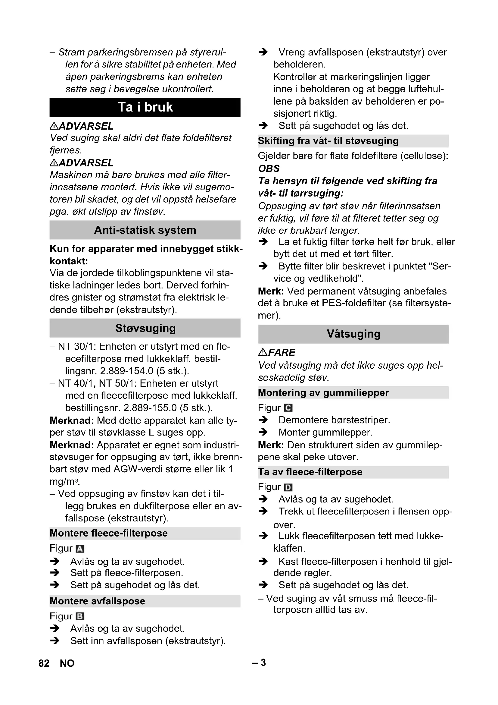 – Bruk av apparatet, oppsuging av de substanser som det er egnet for, og sik- ker behandling ved deponering av opp- sugd materiale, skal kun gjøres av opp- lært personale. – Maskinen inneholder helseskadelig støv. Tømming og vedlikehold, deri- blant fjerning av støvoppsamlingsbe- holdere, må bare foretas av fagperso- ner som bærer egnet verneutstyr. – Maskinen må ikke brukes uten komplett filtreringssystem. – De relevante sikkerhetsreglene som gjelder for stoffene som behandles må følges. Maskinorganer Symboler på maskinen ADVARSEL: Maskinen inneholder helse- skadelig støv. Tømming og vedlikehold, in- kludert fjerning av støvpose, skal kun utfø- res av sakkyndig personale som bruker eg- net personlig verneutstyr. Ikke slå på før hele filtersystemet er installert. Flatt foldefilter (cellulose) Bestillingsnr. 6.904-367.0 Foldefilter (PES) Bestillingsnr. 6.907-662.0 Foldefilter (PTFE) Bestillingsnr. 6.907-455.0 Sikkerhetsanvisninger 81NO– 3 – Stram parkeringsbremsen på styrerul- len for å sikre stabilitet på enheten. Med åpen parkeringsbrems kan enheten sette seg i bevegelse ukontrollert. 몇 ADVARSEL Ved suging skal aldri det flate foldefilteret fjernes. 몇 ADVARSEL Maskinen må bare brukes med alle filter- innsatsene montert. Hvis ikke vil sugemo- toren bli skadet, og det vil oppstå helsefare pga. økt utslipp av finstøv. Kun for apparater med innebygget stikk- kontakt: Via de jordede tilkoblingspunktene vil sta- tiske ladninger ledes bort. Derved forhin- dres gnister og strømstøt fra elektrisk le- dende tilbehør (ekstrautstyr). – NT 30/1: Enheten er utstyrt med en fle- ecefilterpose med lukkeklaff, bestil- lingsnr. 2.889-154.0 (5 stk.). – NT 40/1, NT 50/1: Enheten er utstyrt med en fleecefilterpose med lukkeklaff, bestillingsnr. 2.889-155.0 (5 stk.). Merknad: Med dette apparatet kan alle ty- per støv til støvklasse L suges opp. Merknad: Apparatet er egnet som industri- støvsuger for oppsuging av tørt, ikke brenn- bart støv med AGW-verdi større eller lik 1 mg/m