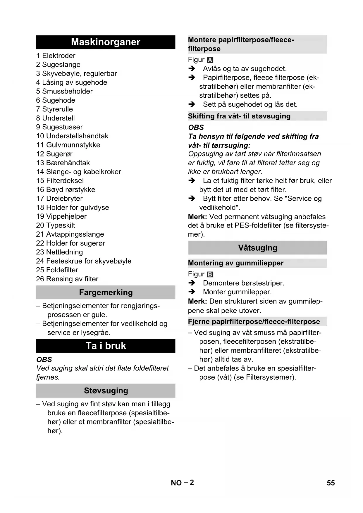 EU 6.649-915.0 10 m GB 6.650-151.0 10 m CH 6.650-292.0 10 m AU 6.650-166.0 10 m 53DA– 1 Før første gangs bruk av appa- ratet, les denne originale bruks- anvisningen, følg den og oppbevar den for senere bruk eller for overlevering til neste eier. – Det er tvingende nødvendig å lese sik- kerhetsinstruksene nr. 5.956-249.0 før maskinen settes i drift! – Hvis bruksanvisningen og sikkerhets- anvisningene ikke følges, kan dette medføre skader på apparatet og fare for brukeren og andre personer. – Informer straks forhandleren ved trans- portskader. Anvisninger om innhold (REACH) Aktuell informasjon om stoffene i innholdet finner du under: www.kaercher.com/REACH FARE Anvisning om en umiddelbar truende fare som kan føre til store personskader eller til død. 몇 ADVARSEL Anvisning om en mulig farlig situasjon som kan føre til store personskader eller til død. 몇 FORSIKTIG Anvisning om en mulig farlig situasjon som kan føre til mindre personskader. OBS Anvisning om en mulig farlig situasjon som kan føre til materielle skader. 몇 ADVARSEL Maskinen er ikke egnet til oppsuging av helsefarlig støv. – Denne maskinen er beregnet for våt- og tørr-rengjøring av gulv- og veggflater. – Denne maskinen egner seg til industri- elt bruk, f.eks. i hoteller, skoler, syke- hus, fabrikker, butikker, kontorer og ut- leiefirmaer. Innholdsfortegnelse Miljøvern . . . . . . . . . . . . . . . . . NO 1 Risikotrinn . . . . . . . . . . . . . . . . NO 1 Forskriftsmessig bruk . . . . . . . NO 1 Maskinorganer . . . . . . . . . . . . NO 2 Ta i bruk . . . . . . . . . . . . . . . . . NO 2 Betjening. . . . . . . . . . . . . . . . . NO 3 Transport. . . . . . . . . . . . . . . . . NO 4 Lagring . . . . . . . . . . . . . . . . . . NO 4 Pleie og vedlikehold . . . . . . . . NO 4 Feilretting . . . . . . . . . . . . . . . . NO 4 Garanti . . . . . . . . . . . . . . . . . . NO 5 Tilbehør og reservedeler. . . . . NO 5 EU-samsvarserklæring . . . . . . NO 5 Tekniske data . . . . . . . . . . . . . NO 6 Miljøvern Materialet i emballasjen kan re- sirkuleres. Ikke kast emballasjen i husholdningsavfallet, men le- ver den inn til resirkulering. Gamle apparater inneholder ver- difulle materialer som kan resir- kuleres. Disse bør leveres inn til gjenvinning. Batterier, olje og lig- nende stoffer må ikke komme ut i miljøet. Gamle maskiner skal derfor avhendes i egnede inn- samlingssystemer. Risikotrinn Forskriftsmessig bruk 54 NO– 2 1 Elektroder 2 Sugeslange 3 Skyvebøyle, regulerbar 4 Låsing av sugehode 5 Smussbeholder 6 Sugehode 7 Styrerulle 8 Understell 9 Sugestusser 10 Understellshåndtak 11 Gulvmunnstykke 12 Sugerør 13 Bærehåndtak 14 Slange- og kabelkroker 15 Filterdeksel 16 Bøyd rørstykke 17 Dreiebryter 18 Holder for gulvdyse 19 Vippehjelper 20 Typeskilt 21 Avtappingsslange 22 Holder for sugerør 23 Nettledning 24 Festeskrue for skyvebøyle 25 Foldefilter 26 Rensing av filter – Betjeningselementer for rengjørings- prosessen er gule. – Betjeningselementer for vedlikehold og service er lysegråe. OBS Ved suging skal aldri det flate foldefilteret fjernes. – Ved suging av fint støv kan man i tillegg bruke en fleecefilterpose (spesialtilbe- hør) eller et membranfilter (spesialtilbe- hør). Figur Avlås og ta av sugehodet. Papirfilterpose, fleece filterpose (ek- stratilbehør) eller membranfilter (ek- stratilbehør) settes på. Sett på sugehodet og lås det. OBS Ta hensyn til følgende ved skifting fra våt- til tørrsuging: Oppsuging av tørt støv når filterinnsatsen er fuktig, vil føre til at filteret tetter seg og ikke er brukbart lenger. La et fuktig filter tørke helt før bruk, eller bytt det ut med et tørt filter. Bytt filter etter behov. Se "Service og vedlikehold". Merk: Ved permanent våtsuging anbefales det å bruke et PES-foldefilter (se filtersyste- mer). Figur Demontere børstestriper. Monter gummilepper. Merk: Den strukturert siden av gummilep- pene skal peke utover. – Ved suging av våt smuss må papirfilter- posen, fleecefilterposen (ekstratilbe- hør) eller membranfilteret (ekstratilbe- hør) alltid tas av. – Det anbefales å bruke en spesialfilter- pose (våt) (se Filtersystemer). Maskinorganer Fargemerking Ta i bruk Støvsuging Montere papirfilterpose/fleece- filterpose Skifting fra våt- til støvsuging Våtsuging Montering av gummiliepper Fjerne papirfilterpose/fleece-filterpose 55NO– 3 몇 FORSIKTIG Ta hensyn til de lokale utslippsforskrifter. Apparat med metallbeholder: Figur Apparat med plastbeholder: Figur Tapp ut spillvannet via tappeslangen. – Ved oppsuging av våt smuss med mø- bel- eller fugemunnstykket, eller hvis det overveiende suges opp vann fra en beholder, anbefales det at funksjonen "automatisk filterrengjøring" slås av av. – Ved oppnådd maks. væskenivå slår ap- paratet seg automatisk av. – Ved ikke ledende væsker (for eksem- pel bore-emulsjoner, olje eller fett) vil apparatet ikke slå seg av ved full beholder. Fyllingsgraden må stadig kontrolleres og beholderen må tøm- mes i rett tid. – Etter avsluttet våtsuging: Rengjør folde- filteret med filterrensingen. Rengjør elektrodene med en børste. Rengjør beholderen med en fuktig klut og tørk den. Figur Sugeslangen er utstyrt med et clip-system. Alle C-40/C-DN-40-tilbehørsdeler kan tilko- bles. Sett i støpselet. Slå på apparatet med dreiebryteren. Apparatet har en ny type dobbel filterren- gjøring som er spesielt virksomt for fint støv. Derved renses det flate foldefilteret automatisk hvert 7,5. sekund ved hjelp av luftstøt (pulsenrende støy). Slå av apparatet med dreiebryteren. Trekk ut nettstøpselet. Tøm beholderen. Rengjør maskinen innvendig og utven- dig ved å tørke av den med en fuktig klut, og ved å bruke sugefunksjonen. Løsne festeskruene for skyvebøylen og reguler skyvebøylen. Figur Oppbevar sugeslange og strømkabel i henhold til figuren. Sett maskinen til oppbevaring i et tørt rom, utilgjengelig for uvedkommende. Tapping av brukt vann Generelt Clipfor