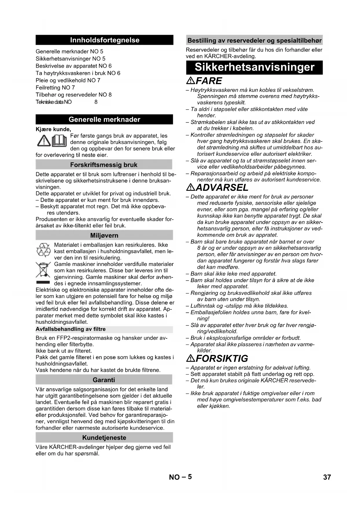 dB(A) dB(A) dB(A) 36 DA– 5 Kjære kunde, Før første gangs bruk av apparatet, les denne originale bruksanvisningen, følg den og oppbevar den for senere bruk eller for overlevering til neste eier. Dette apparatet er til bruk som luftrenser i henhold til be- skrivelsene og sikkerhetsinstruksene i denne bruksan- visningen. Dette apparatet er utviklet for privat og industriell bruk. – Dette apparatet er kun ment for bruk innendørs. – Beskytt apparatet mot regn. Det må ikke oppbeva- res utendørs. Produsenten er ikke ansvarlig for eventuelle skader for- årsaket av ikke-tiltenkt eller feil bruk. Materialet i emballasjen kan resirkuleres. Ikke kast emballasjen i husholdningsavfallet, men le- ver den inn til resirkulering. Gamle maskiner inneholder verdifulle materialer som kan resirkuleres. Disse bør leveres inn til gjenvinning. Gamle maskiner skal derfor avhen- des i egnede innsamlingssystemer. Elektriske og elektroniske apparater inneholder ofte de- ler som kan utgjøre en potensiell fare for helse og miljø ved feil bruk eller feil avfallsbehandling. Disse delene er imidlertid nødvendige for korrekt drift av apparatet. Ap- parater merket med dette symbolet skal ikke kastes i husholdningsavfallet. Bruk en FFP2-respiratormaske og hansker under av- hending eller filterbytte. Ikke bank ut av filteret. Pakk det gamle filteret i en pose som lukkes og kastes i husholdningsavfallet. Vask hendene når du har kastet de brukte filtrene. Vår ansvarlige salgsorganisasjon for det enkelte land har utgitt garantibetingelsene som gjelder i det aktuelle landet. Eventuelle feil på maskinen blir reparert gratis i garantitiden dersom disse kan føres tilbake til material- eller produksjonsfeil. Ved behov for garantireparasjo- ner, vennligst henvend deg med kjøpskvitteringen til din forhandler eller nærmeste autoriserte kundeservice. Våre KÄRCHER-avdelinger hjelper deg gjerne ved feil eller om du har spørsmål. Reservedeler og tilbehør får du hos din forhandler eller ved en KÄRCHER-avdeling. FARE – Høytrykksvaskeren må kun kobles til vekselstrøm. Spenningen må stemme overens med høytrykks- vaskerens typeskilt. – Ta aldri i støpselet eller stikkontakten med våte hender. – Strømkabelen skal ikke tas ut av stikkontakten ved at du trekker i kabelen. – Kontroller strømledningen og støpselet for skader hver gang høytrykksvaskeren skal brukes. En ska- det strømledning må skiftes ut umiddelbart hos au- torisert kundeservice eller autorisert elektriker. – Slå av apparatet og ta ut strømstøpselet innen ser- vice eller vedlikeholdsarbeider påbegynnes. – Reparasjonsarbeid og arbeid på elektriske kompo- nenter må kun utføres av autorisert kundeservice. ADVARSEL – Dette apparatet er ikke ment for bruk av personer med reduserte fysiske, sensoriske eller sjelelige evner, eller som pga. mangel på erfaring og/eller kunnskap ikke kan benytte apparatet trygt. De skal da kun bruke apparatet under oppsyn av en sikker- hetsansvarlig person, eller få instruksjoner av ved- kommende om bruk av appratet. – Barn skal bare bruke apparatet når barnet er over 8 år og er under oppsyn av en sikkerhetsansvarlig person, eller får anvisninger av en person om hvor- dan apparatet fungerer og forstår hva slags farer det kan medføre. – Barn skal ikke leke med apparatet. – Barn skal holdes under tilsyn for å sikre at de ikke leker med apparatet. – Rengjøring og bruksvedlikehold skal ikke utføres av barn uten under tilsyn. – Luftinntak og -utslipp må ikke tildekkes. – Emballasjefolien holdes unna barn, fare for kvel- ning! – Slå av apparatet etter hver bruk og før hver rengjø- ring/vedlikehold. – Bruk i eksplosjonsfarlige områder er forbudt. – Apparatet skal ikke plasseres i nærheten av varme- kilder. FORSIKTIG – Apparatet er ingen erstatning for adekvat lufting. – Sett apparatet stabilt på flatt underlag og rett opp. – Det må kun brukes originale KÄRCHER reservede- ler. – Ikke bruk apparatet i fuktige omgivelser eller i rom med høye omgivelsestemperaturer som f.eks. bad eller kjøkken. Innholdsfortegnelse Generelle merknader NO 5 Sikkerhetsanvisninger NO 5 Beskrivelse av apparatet NO 6 Ta høytrykksvaskeren i bruk NO 6 Pleie og vedlikehold NO 7 Feilretting NO 7 Tilbehør og reservedeler NO 8 Tekniske data NO 8 Generelle merknader Forskriftsmessig bruk Miljøvern Avfallsbehandling av filtre Garanti Kundetjeneste Bestilling av reservedeler og spesialtilbehør Sikkerhetsanvisninger 37NO– 6 FARE Anvisning om en umiddelbar truende fare som kan føre til store personskader eller til død. 몇 ADVARSEL Anvisning om en mulig farlig situasjon som kan føre til store personskader eller til død. 몇 FORSIKTIG Anvisning om en mulig farlig situasjon som kan føre til mindre personskader. OBS Anvisning om en mulig farlig situasjon som kan føre til materielle skader. Kontroller ved utpakkingen at innholdet i pakken er komplett og uskadd. Kontakt din forhandler ved eventu- elle transportskader. Illustrasjoner se utfoldingssidene! 1 Filterdeksel foran 2 Forfilter 3 Hovedfilter 4 Filterdeksel bak 5Luftavløp 6 Digitalt display 7 Betjeningspanel 8 Luftkvalitetsdisplay 9 Håndtak filterdeksler 10 Deksel luftkvalitetssensor 11 Nettilkobling 12 Betjeningstast på/av 13 Betjeningstast manuell modus 14 Betjeningstast automatisk modus 15 Betjeningstast nattmodus 16 Filterskifteindikator OBS Apparatet skal alltid brukes med innsatt for- og finfilter. Figur Før første idriftsetting må finfiltrene som allerede befinner seg i apparatet pakkes ut. Sett inn strømledningen i apparatet Stikk støpselet i stikkontakten. Alle betjeningstaster på betjeningspanelet og luft- kvalitetsdisplayet lyser kort opp og slukkes igjen. Trykk på på/av-betjeningstasten for å slå på appa- ratet. Merknad – Når apparatet slås på, måler den integrerte luftkva- litetssensoren automatisk luftkvaliteten i rommet. – Ønsket modus stilles inn ved å trykke på den tilsva- rende betjenings