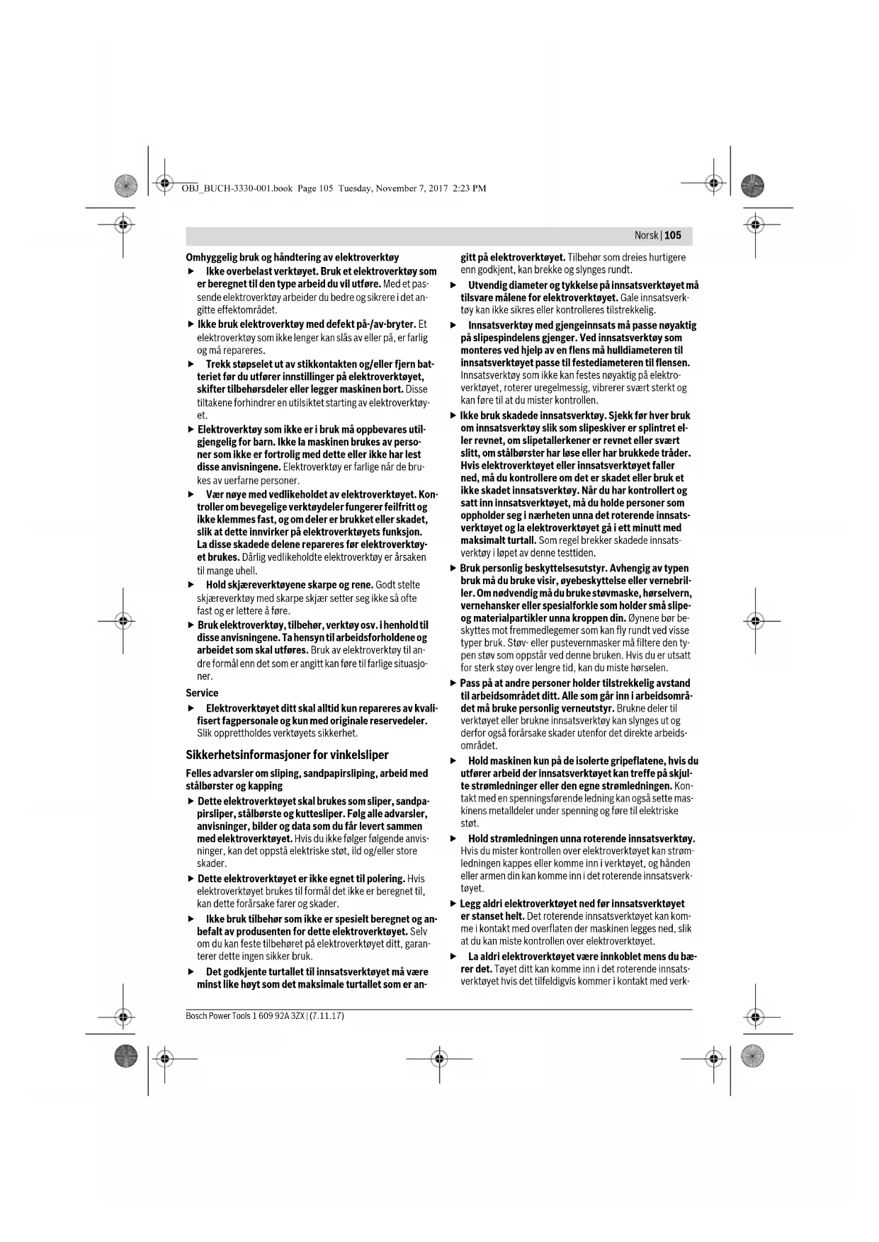 2,5 2,3 2,5 2,3 2,5 2,4 2,5 2,4 Beskyttelsesklasse /II /II /II /II Informasjonene gjelder for nominell spenning [U] på 230 V. Ved avvikende spenning og på visse nasjonale modeller kan disse informasjonene variere noe. OBJ_BUCH-3330-001.book Page 108 Tuesday, November 7, 2017 2:23 PMNorsk | 109 Bosch Power Tools 1 609 92A 3ZX | (7.11.17) Støy-/vibrasjonsinformasjon Vibrasjonsnivået som er angitt i disse anvisningene, er målt iht. en målemetode som er standardisert i EN 60745 og kan brukes til sammenligning av elektroverktøy med hverandre. Det egner seg også til en foreløpig vurdering av vibrasjonsbe- lastningen. Det angitte vibrasjonsnivået representerer de hovedsakelige anvendelsene til elektroverktøyet. Men hvis elektroverktøyet brukes til andre anvendelser, med forskjellig tilbehør eller utilstrekkelig vedlikehold, kan vibrasjonsnivået avvike. Dette kan føre til en tydelig øking av vibrasjonsbelastningen over he- le arbeidstidsrommet. Til en nøyaktig vurdering av vibrasjonsbelastningen skal det også tas hensyn til de tidene maskinen er slått av eller går, men ikke virkelig brukes. Dette kan tydelig redusere vibra- sjonsbelastningen over hele arbeidstidsrommet. Bestem ekstra sikkerhetstiltak til beskyttelse av brukeren mot vibrasjonenes virkning, som for eksempel: Vedlikehold av elektroverktøy og innsatsverktøy, holde hendene varme, or- ganisere arbeidsforløpene. Montering Montering av beskyttelsesinnretninger Før alle arbeider på elektroverktøyet utføres må støp- selet trekkes ut av stikkontakten. Merk: Etter brudd på slipeskiven i løpet av driften eler skader på festeinnretningene på vernedekselet/på elektroverktøyet må elektroverktøyet straks sendes inn til kundeservice, adresser se avsnittet «Kundeservice og rådgivning ved bruk». GWS ... 18-125 L 18-125 PL 18-125 SL 18-125 SPL 3 601 ... GA3 0.. GA3 1.. GA3 2.. GA3 3.. Støyutslippsverdier målt i henhold til EN 60745-2-3. Det typiske A-bedømte støynivået for maskinen