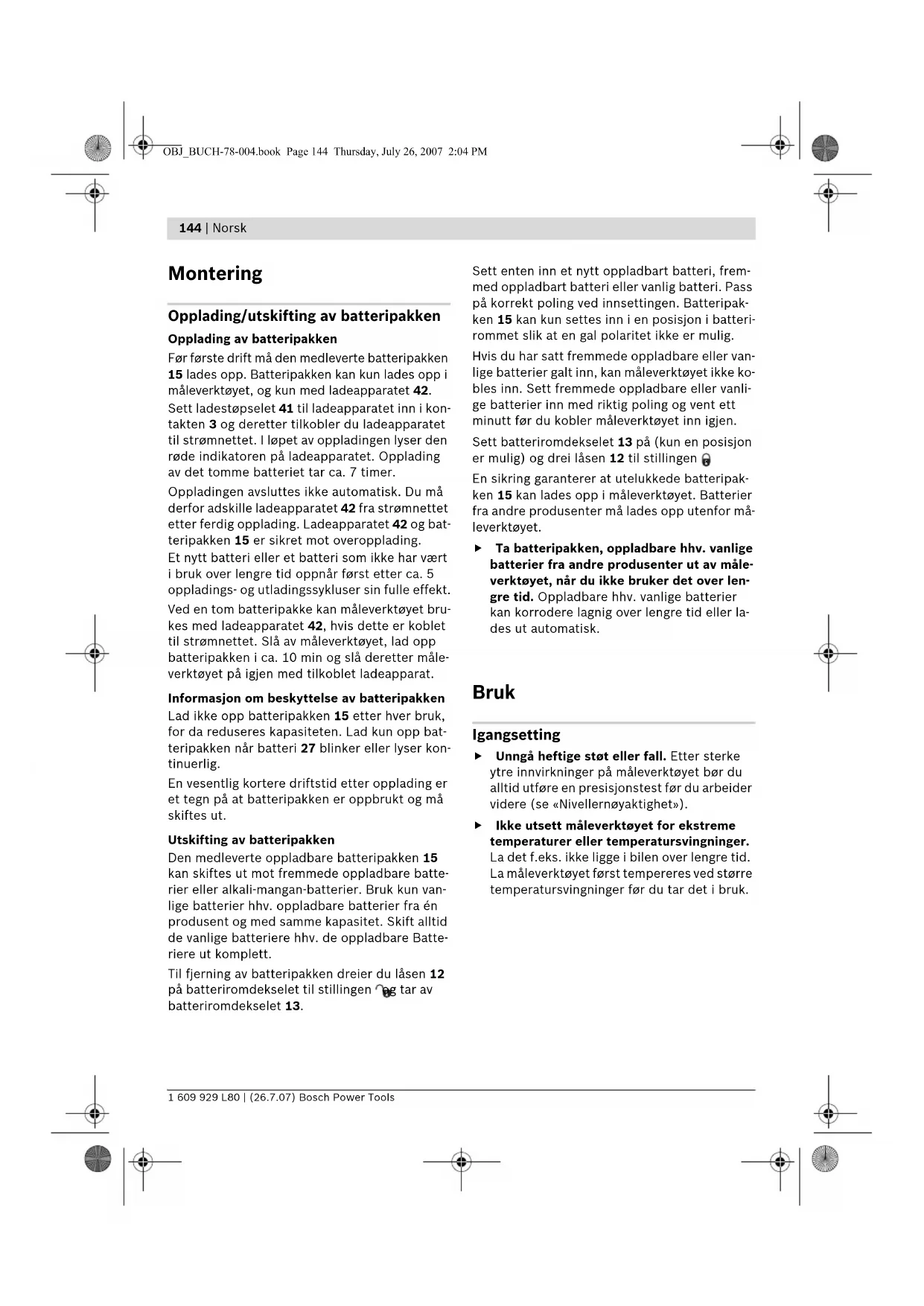 Legg merke til produktnummeret på typeskiltet til måleverktøyet ditt, handelsbetegnelsene til de enkelte måle- verktøyene kan variere. Serienummeret 18 på typeskiltet er til en entydig identifisering av måleverktøyet. OBJ_BUCH-78-004.book Page 143 Thursday, July 26, 2007 2:04 PM144 | Norsk 1 609 929 L80 | (26.7.07) Bosch Power Tools Montering Opplading/utskifting av batteripakken Opplading av batteripakken Før første drift må den medleverte batteripakken 15 lades opp. Batteripakken kan kun lades opp i måleverktøyet, og kun med ladeapparatet 42. Sett ladestøpselet 41 til ladeapparatet inn i kon- takten 3 og deretter tilkobler du ladeapparatet til strømnettet. I løpet av oppladingen lyser den røde indikatoren på ladeapparatet. Opplading av det tomme batteriet tar ca. 7 timer. Oppladingen avsluttes ikke automatisk. Du må derfor adskille ladeapparatet 42 fra strømnettet etter ferdig opplading. Ladeapparatet 42 og bat- teripakken 15 er sikret mot overopplading. Et nytt batteri eller et batteri som ikke har vært i bruk over lengre tid oppnår først etter ca. 5 oppladings- og utladingssykluser sin fulle effekt. Ved en tom batteripakke kan måleverktøyet bru- kes med ladeapparatet 42, hvis dette er koblet til strømnettet. Slå av måleverktøyet, lad opp batteripakken i ca. 10 min og slå deretter måle- verktøyet på igjen med tilkoblet ladeapparat. Informasjon om beskyttelse av batteripakken Lad ikke opp batteripakken 15 etter hver bruk, for da reduseres kapasiteten. Lad kun opp bat- teripakken når batteri 27 blinker eller lyser kon- tinuerlig. En vesentlig kortere driftstid etter opplading er et tegn på at batteripakken er oppbrukt og må skiftes ut. Utskifting av batteripakken Den medleverte oppladbare batteripakken 15 kan skiftes ut mot fremmede oppladbare batte- rier eller alkali-mangan-batterier. Bruk kun van- lige batterier hhv. oppladbare batterier fra én produsent og med samme kapasitet. Skift alltid de vanlige batteriere hhv. de oppladbare Batte- riere ut komplett. Til fjerning av batteripakken dreier du låsen 12 på batteriromdekselet til stillingen og tar av batteriromdekselet 13. Sett enten inn et nytt oppladbart batteri, frem- med oppladbart batteri eller vanlig batteri. Pass på korrekt poling ved innsettingen. Batteripak- ken 15 kan kun settes inn i en posisjon i batteri- rommet slik at en gal polaritet ikke er mulig. Hvis du har satt fremmede oppladbare eller van- lige batterier galt inn, kan måleverktøyet ikke ko- bles inn. Sett fremmede oppladbare eller vanli- ge batterier inn med riktig poling og vent ett minutt før du kobler måleverktøyet inn igjen. Sett batteriromdekselet 13 på (kun en posisjon er mulig) og drei låsen 12 til stillingen . En sikring garanterer at utelukkede batteripak- ken 15 kan lades opp i måleverktøyet. Batterier fra andre produsenter må lades opp utenfor må- leverktøyet. f Ta batteripakken, oppladbare hhv. vanlige batterier fra andre produsenter ut av måle- verktøyet, når du ikke bruker det over len- gre tid. Oppladbare hhv. vanlige batterier kan korrodere lagnig over lengre tid eller la- des ut automatisk. Bruk Igangsetting f Unngå heftige støt eller fall. Etter sterke ytre innvirkninger på måleverktøyet bør du alltid utføre en presisjonstest før du arbeider videre (se «Nivellernøyaktighet»). f Ikke utsett måleverktøyet for ekstreme temperaturer eller temperatursvingninger. La det f.eks. ikke ligge i bilen over lengre tid. La måleverktøyet først tempereres ved større temperatursvingninger før du tar det i bruk. OBJ_BUCH-78-004.book Page 144 Thursday, July 26, 2007 2:04 PMNorsk | 145 Bosch Power Tools 1 609 929 L80 | (26.7.07) Oppstilling av måleverktøyet Sett måleverktøyet på et stabilt underlag i hori- sontal eller vertikal posisjon, monter det på et stativ 40 eller på veggholderen 32 med oppret- tingsenhet. På grunn av den høye nivelleringsnøyaktigheten reagerer måleverktøyet svært ømfindtlig på vibra- sjoner og posisjonsendring. Pass derfor på at må- leverktøyet har en stabil posisjon, slik at driften ikke må avbrytes på grunn av nye nivelleringer. Inn-/utkobling f Rett aldri laserstrålen mot personer eller dyr (spesielt ikke i øyehøyde) og se ikke selv inn i laserstrålen (heller ikke fra en stor avstand). Rett etter innkoblingen sender må- leverktøyet ut en loddrett loddestråle 8 og den variable laserstrålen 9 som roterer rundt loddestrålen. Vær spesielt forsiktig med den variable laserstrålen i punktdrift. Til innkobling trykker du på på-/av-tasten 29. La- seren starter straks i rotasjonsdrift, samtidig be- gynner den automatiske nivelleringen (se «Arbeid med den automatiske nivelleringen»). Indikatore- ne 25, 26 og 27 lyser i 3 sekunder. I løpet av den ytterligere nivelleringen blinker indikatoren for automatisk nivellering «auto» 26 to ganger i se- kundet. Hvis nivelleringen varer lenger enn 5 se- kunder, avbrytes rotasjonsdriften og laseren blin- ker to ganger pr. sekund til nivelleringen er ferdig. Med driftstype-tastene 19 og 22 pluss retnings- tastene 20, 21, 23 og 24 kan du allerede i løpet av selvnivelleringen bestemme driftstypen (se «Driftstyper»). I dette tilfellet går måleverktøyet i løpet av nivelleringen til bekreftelse av innstillin- gen i 5 sekunder i valgt driftstype. Etter avslut- ning av nivelleringen fortsettes funksjonen i den- ne driftstypen. Måleverktøyet er nivellert når laserstrålen og in- dikatoren «auto» 26 lyser konstant. Til utkobling trykker du igjen på på-/av-tasten 29. Under følgende vilkår kobles måleverktøyet automatisk ut: – Hvis måleverktøyet ved automatisk nivelle- ring befinner seg lenger enn 10 minutter utenfor selvnivelleringsområdet, kobles det ut slik at Batteriere beskyttes. Sett måleverk- tøyet på på nytt og slå det på igjen.