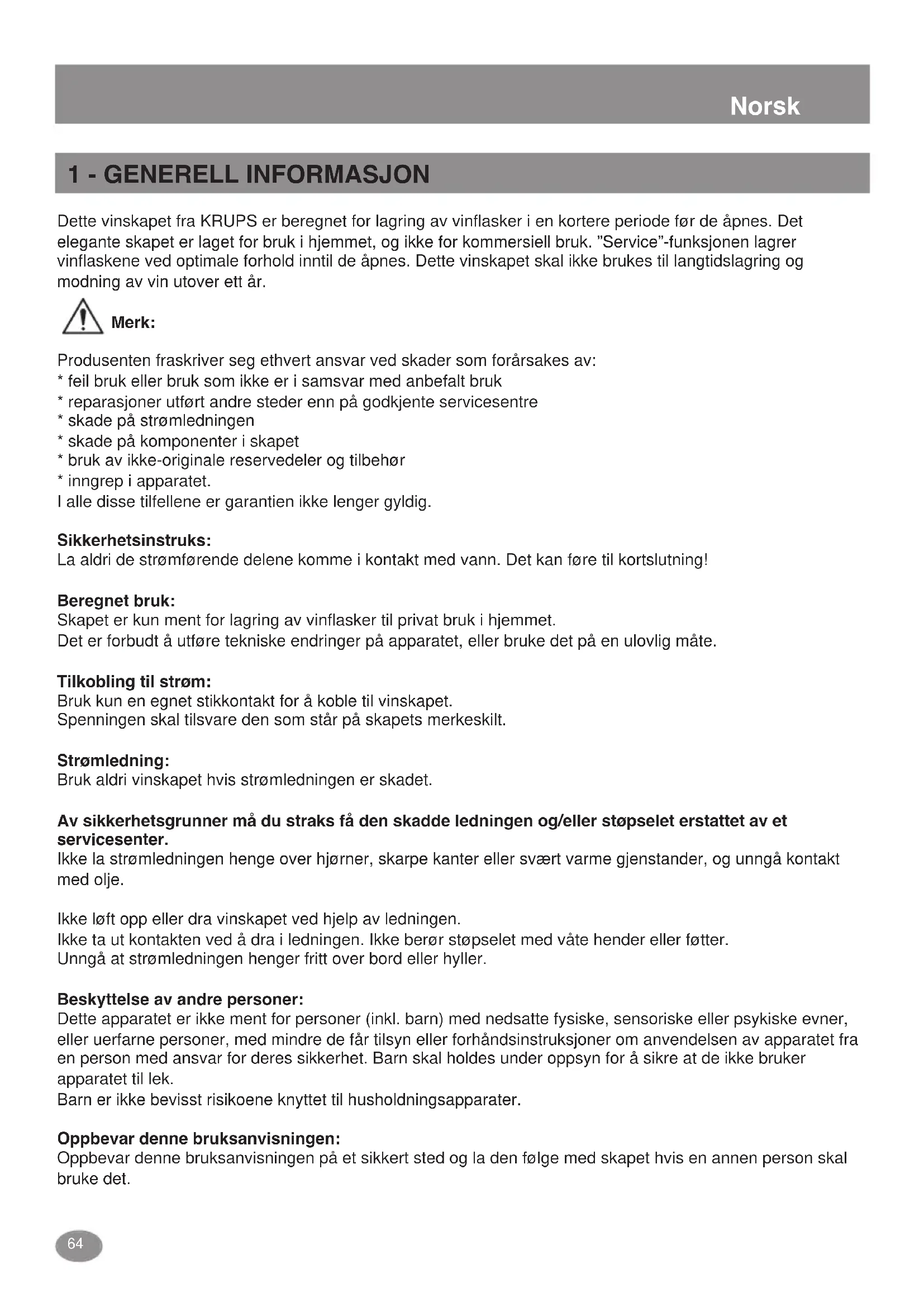 - Forudse en fri afstand på mindst 15 cm på begge sider af apparatet. Cavea?vins.qxd:KM8005franc$ais-copie.qxd20/02/0915:44Page63Norsk Dette vinskapet fra KRUPS er beregnet for lagring av vinflasker i en kortere periode før de åpnes. Det elegante skapet er laget for bruk i hjemmet, og ikke for kommersiell bruk. ”Service”-funksjonen lagrer vinflaskene ved optimale forhold inntil de åpnes. Dette vinskapet skal ikke brukes til langtidslagring og modning av vin utover ett år. Merk: Produsenten fraskriver seg ethvert ansvar ved skader som forårsakes av: