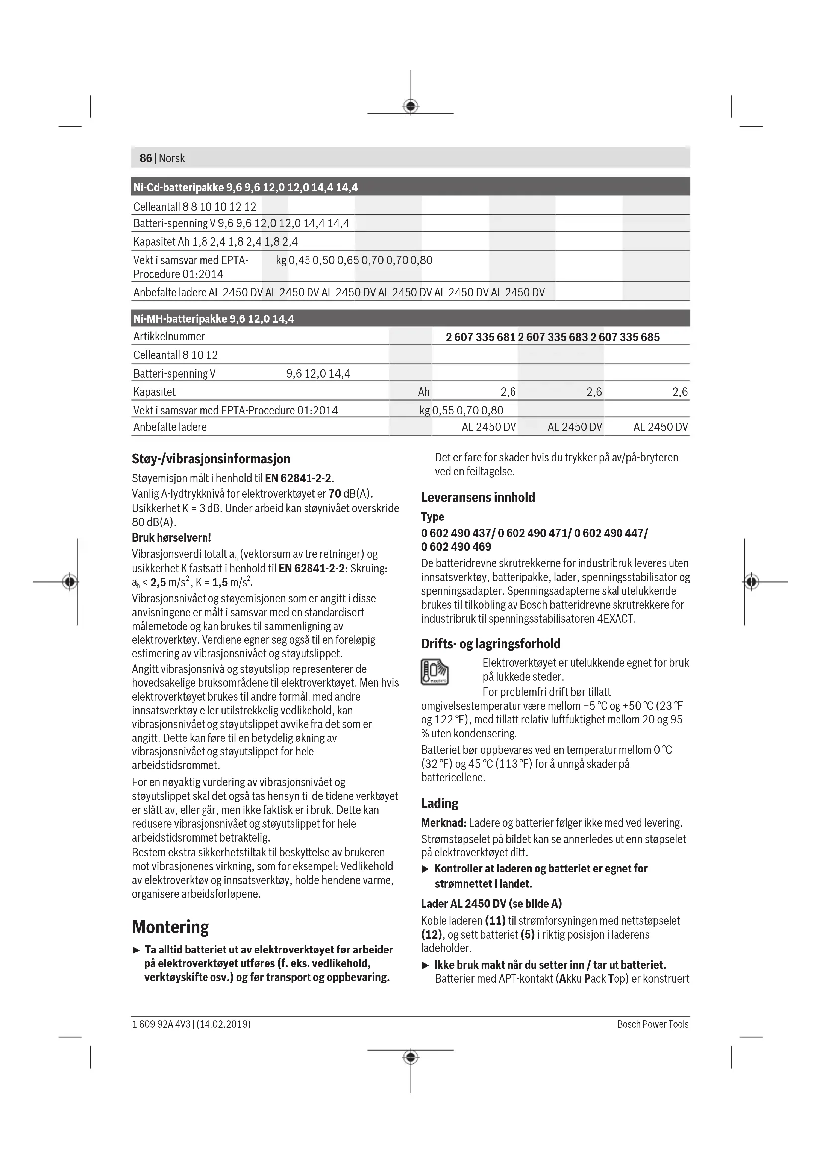 Vibrasjonsnivået og støyemisjonen som er angitt i disse anvisningene er målt i samsvar med en standardisert målemetode og kan brukes til sammenligning av elektroverktøy. Verdiene egner seg også til en foreløpig estimering av vibrasjonsnivået og støyutslippet. Angitt vibrasjonsnivå og støyutslipp representerer de hovedsakelige bruksområdene til elektroverktøyet. Men hvis elektroverktøyet brukes til andre formål, med andre innsatsverktøy eller utilstrekkelig vedlikehold, kan vibrasjonsnivået og støyutslippet avvike fra det som er angitt. Dette kan føre til en betydelig økning av vibrasjonsnivået og støyutslippet for hele arbeidstidsrommet. For en nøyaktig vurdering av vibrasjonsnivået og støyutslippet skal det også tas hensyn til de tidene verktøyet er slått av, eller går, men ikke faktisk er i bruk. Dette kan redusere vibrasjonsnivået og støyutslippet for hele arbeidstidsrommet betraktelig. Bestem ekstra sikkerhetstiltak til beskyttelse av brukeren mot vibrasjonenes virkning, som for eksempel: Vedlikehold av elektroverktøy og innsatsverktøy, holde hendene varme, organisere arbeidsforløpene. Montering u Ta alltid batteriet ut av elektroverktøyet før arbeider på elektroverktøyet utføres (f.eks. vedlikehold, verktøyskifte osv.) og før transport og oppbevaring. Det er fare for skader hvis du trykker på av/på-bryteren ved en feiltagelse. Leveransens innhold Type 0 602 490 437/ 0 602 490 471/ 0 602 490 447/