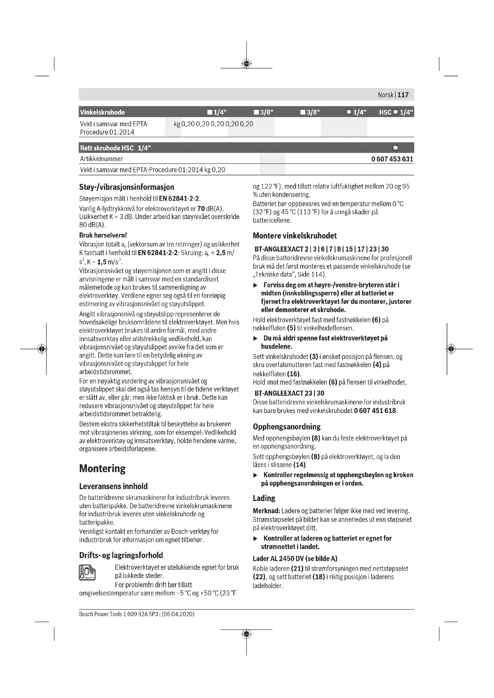 -navnet og -logoene er registrerte varemerker som tilhører Bluetooth SIG, Inc. Enhver bruk av navnet/ logoen av Robert Bosch Power Tools GmbH skjer på lisens. Produktbeskrivelse og ytelsesspesifikasjoner Les sikkerhetsanvisningene og instruksene. Hvis ikke sikkerhetsanvisningene og instruksene tas til følge, kan det oppstå elektrisk støt, brann og/eller alvorlige personskader. Se illustrasjonene i begynnelsen av bruksanvisningen. Forskriftsmessig bruk Skrusystemet BT-EXACT/BT-ANGLEEXACT og EXAConnecT er beregnet for skruing og løsing av skruer og for tiltrekking og løsing av muttere i det angitte dimensjons- og effektområdet. Det er ikke beregnet for dokumentering av tiltrekkingsmoment eller -vinkel på en skruforbindelse. Skrusystemet gir mulighet til trådløs overføring av skrusignaler ved bruk av Bluetooth® wireless technology. Ikke OK- og OK-signaler (skruforbindelse i orden / ikke i orden) fra de batteridrevne skrumaskinene for industribruk BT-EXACT og BT-ANGLEEXACT sendes til basisstasjonen EXAConnecT. Uten basisstasjonen EXAConnecT er det ikke mulig å starte skrumaskinene i serien BT-EXACT og BT- ANGLEEXACT. Skrumaskinene er sperret ved levering, og kan bare aktiveres av basisstasjonen EXAConnecT. Følg brukanvisningen for basisstasjonen EXAConnecT. Ta først basisstasjonen EXAConnecT i drift. Illustrerte komponenter Nummereringen av de illustrerte komponentene gjelder for bildet av elektroverktøyet på illustrasjonssiden. (1) Innsatsverktøy (f.eks.pipe) (2) Verktøyholder (3) Vinkelskruhode (4) Fastnøkkel nøkkelvidde 27mm (5) Nøkkelflate på vinkelhodeflensen (6) Fastnøkkel nøkkelvidde 22 mm Bosch Power Tools 1 609 92A 5P3 | (06.04.2020)114 | Norsk (7) Glidebryter for turtallsinnstilling (8) Opphengsbøyle (9) LED-indikator for skrukoblinger (10) LED-indikator Bluetooth® (11) LED-indikator batteriladenivå (12) Av/på-bryter (13) Dreieretningsvelger (14) Festeslisse for opphengsbøyle (15) LED-holder (16) Nøkkelflate på overfalsmutter (17) Utløserknapp for batteri (18) Batteri med APT-stikkontakt (19) Markeringsring (20) Arbeidslys (21) Lader (22) Nettstøpsel (23) Grønn LED-indikator på laderen (24) Rød LED-indikator på laderen (25) Hurtigskiftechuck (26) Innstillingsverktøy (27) Unbrakonøkkel (28) Innstillingsskive (29) Låseskive (30) Hulrom i huset (31) Håndtak (isolert grepsflate) Illustrert eller beskrevet tilbehør inngår ikke i standard- leveransen. Det komplette tilbehøret finner du i vårt tilbehørsprogram. Tekniske data Batteridrevet skrumaskin for industribruk BT-EXACT