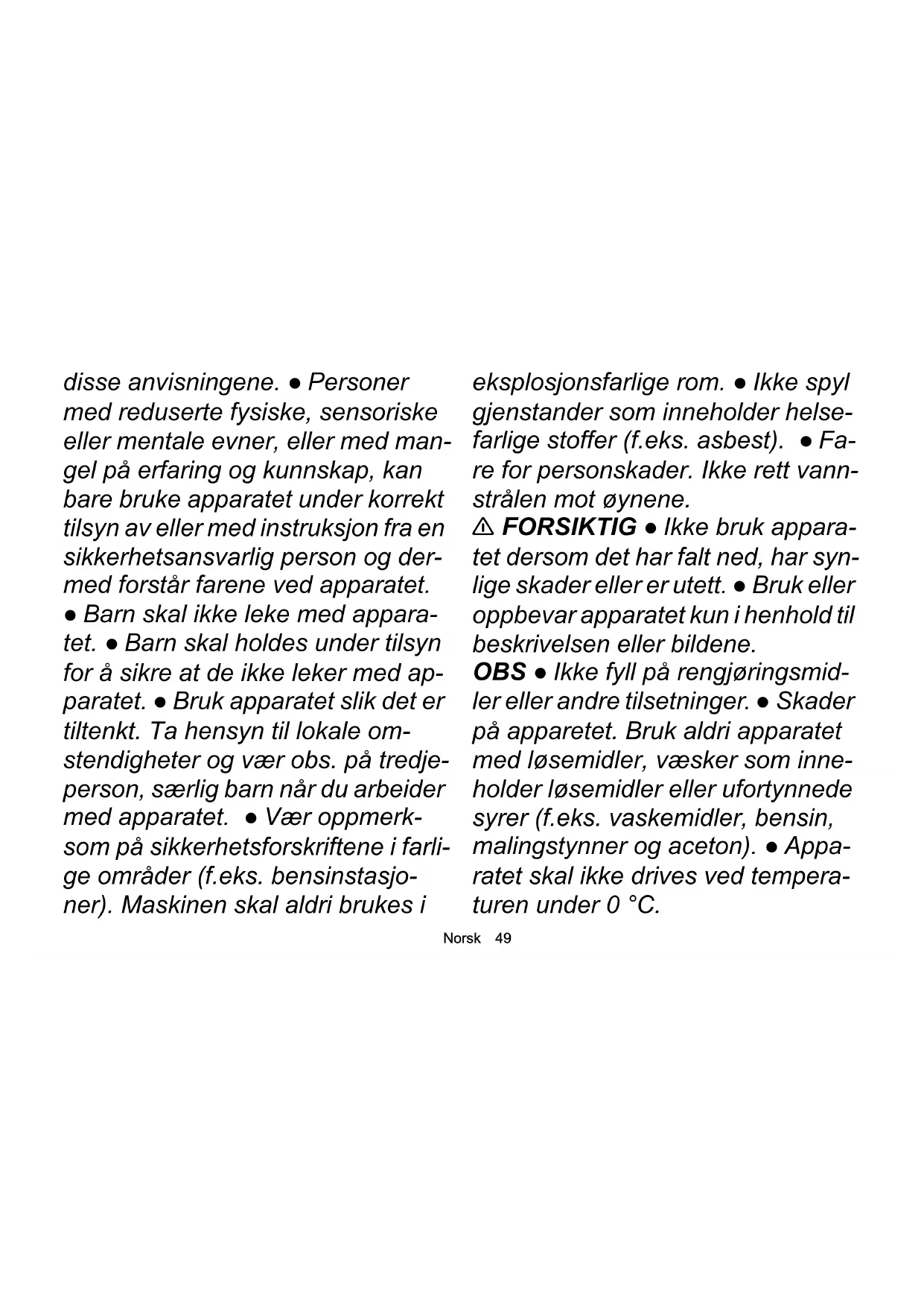 Bruk 몇 FORSIKTIG Spraystråle Skader på øyne og ører Ikke rett spraystrålen mot øyne eller øyrer.