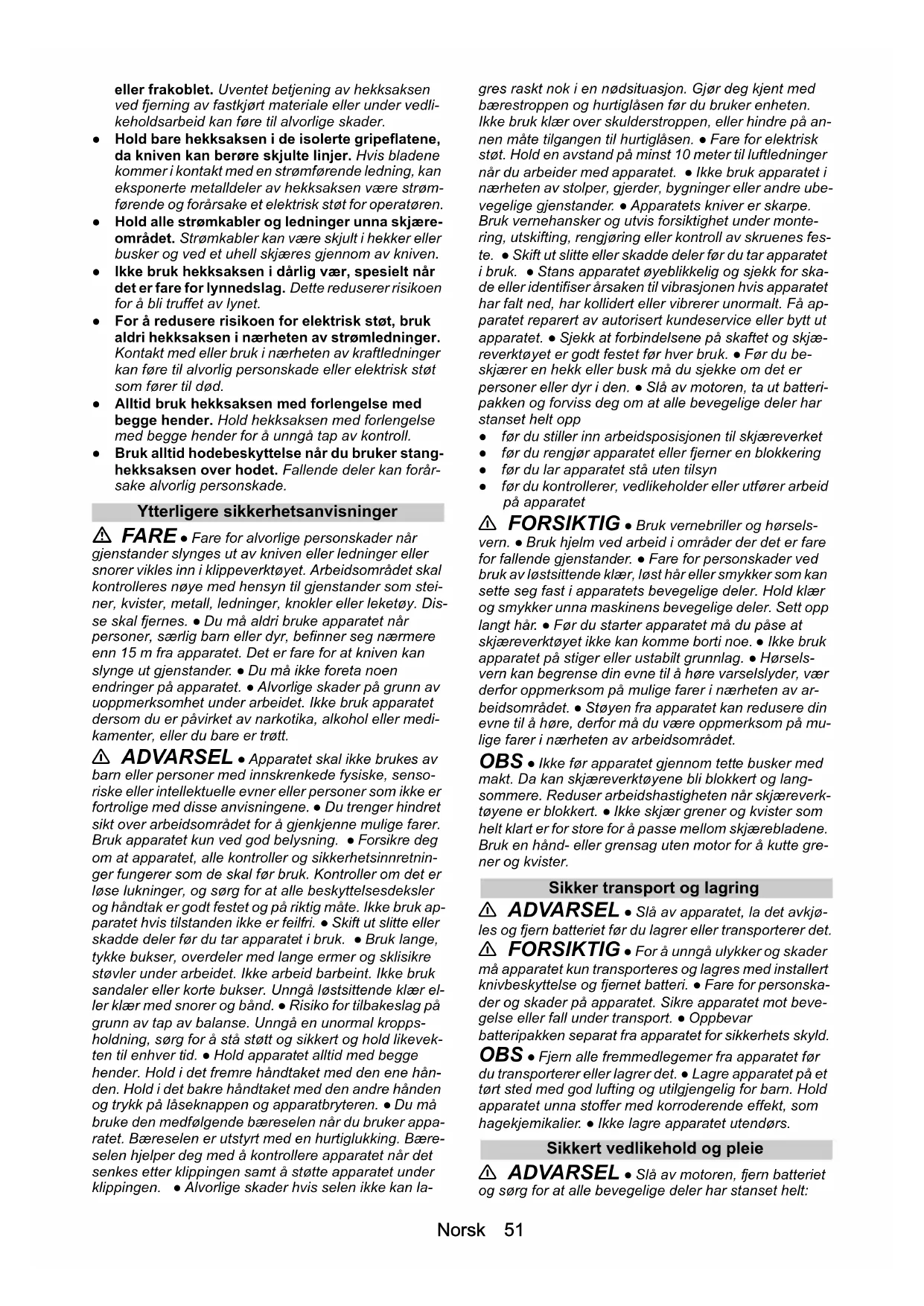 - EU-samsvarserklæring Norsk 51 eller frakoblet. Uventet betjening av hekksaksen ved fjerning av fastkjørt materiale eller under vedli- keholdsarbeid kan føre til alvorlige skader. ● Hold bare hekksaksen i de isolerte gripeflatene, da kniven kan berøre skjulte linjer. Hvis bladene kommer i kontakt med en strømførende ledning, kan eksponerte metalldeler av hekksaksen være strøm- førende og forårsake et elektrisk støt for operatøren. ● Hold alle strømkabler og ledninger unna skjære- området. Strømkabler kan være skjult i hekker eller busker og ved et uhell skjæres gjennom av kniven. ● Ikke bruk hekksaksen i dårlig vær, spesielt når det er fare for lynnedslag. Dette reduserer risikoen for å bli truffet av lynet. ● For å redusere risikoen for elektrisk støt, bruk aldri hekksaksen i nærheten av strømledninger. Kontakt med eller bruk i nærheten av kraftledninger kan føre til alvorlig personskade eller elektrisk støt som fører til død. ● Alltid bruk hekksaksen med forlengelse med begge hender. Hold hekksaksen med forlengelse med begge hender for å unngå tap av kontroll. ● Bruk alltid hodebeskyttelse når du bruker stang- hekksaksen over hodet. Fallende deler kan forår- sake alvorlig personskade. Ytterligere sikkerhetsanvisninger FARE ● Fare for alvorlige personskader når gjenstander slynges ut av kniven eller ledninger eller snorer vikles inn i klippeverktøyet. Arbeidsområdet skal kontrolleres nøye med hensyn til gjenstander som stei- ner, kvister, metall, ledninger, knokler eller leketøy. Dis- se skal fjernes. ● Du må aldri bruke apparatet når personer, særlig barn eller dyr, befinner seg nærmere enn 15 m fra apparatet. Det er fare for at kniven kan slynge ut gjenstander. ● Du må ikke foreta noen endringer på apparatet. ● Alvorlige skader på grunn av uoppmerksomhet under arbeidet. Ikke bruk apparatet dersom du er påvirket av narkotika, alkohol eller medi- kamenter, eller du bare er trøtt. 몇 ADVARSEL ● Apparatet skal ikke brukes av barn eller personer med innskrenkede fysiske, senso- riske eller intellektuelle evner eller personer som ikke er fortrolige med disse anvisningene. ● Du trenger hindret sikt over arbeidsområdet for å gjenkjenne mulige farer. Bruk apparatet kun ved god belysning. ● Forsikre deg om at apparatet, alle kontroller og sikkerhetsinnretnin- ger fungerer som de skal før bruk. Kontroller om det er løse lukninger, og sørg for at alle beskyttelsesdeksler og håndtak er godt festet og på riktig måte. Ikke bruk ap- paratet hvis tilstanden ikke er feilfri. ● Skift ut slitte eller skadde deler før du tar apparatet i bruk. ● Bruk lange, tykke bukser, overdeler med lange ermer og sklisikre støvler under arbeidet. Ikke arbeid barbeint. Ikke bruk sandaler eller korte bukser. Unngå løstsittende klær el- ler klær med snorer og bånd. ● Risiko for tilbakeslag på grunn av tap av balanse. Unngå en unormal kropps- holdning, sørg for å stå støtt og sikkert og hold likevek- ten til enhver tid. ● Hold apparatet alltid med begge hender. Hold i det fremre håndtaket med den ene hån- den. Hold i det bakre håndtaket med den andre hånden og trykk på låseknappen og apparatbryteren. ● Du må bruke den medfølgende bæreselen når du bruker appa- ratet. Bæreselen er utstyrt med en hurtiglukking. Bære- selen hjelper deg med å kontrollere apparatet når det senkes etter klippingen samt å støtte apparatet under klippingen. ● Alvorlige skader hvis selen ikke kan la- gres raskt nok i en nødsituasjon. Gjør deg kjent med bærestroppen og hurtiglåsen før du bruker enheten. Ikke bruk klær over skulderstroppen, eller hindre på an- nen måte tilgangen til hurtiglåsen. ● Fare for elektrisk støt. Hold en avstand på minst 10 meter til luftledninger når du arbeider med apparatet. ● Ikke bruk apparatet i nærheten av stolper, gjerder, bygninger eller andre ube- vegelige gjenstander. ● Apparatets kniver er skarpe. Bruk vernehansker og utvis forsiktighet under monte- ring, utskifting, rengjøring eller kontroll av skruenes fes- te. ● Skift ut slitte eller skadde deler før du tar apparatet i bruk. ● Stans apparatet øyeblikkelig og sjekk for ska- de eller identifiser årsaken til vibrasjonen hvis apparatet har falt ned, har kollidert eller vibrerer unormalt. Få ap- paratet reparert av autorisert kundeservice eller bytt ut apparatet. ● Sjekk at forbindelsene på skaftet og skjæ- reverktøyet er godt festet før hver bruk. ● Før du be- skjærer en hekk eller busk må du sjekke om det er personer eller dyr i den. ● Slå av motoren, ta ut batteri- pakken og forviss deg om at alle bevegelige deler har stanset helt opp ● før du stiller inn arbeidsposisjonen til skjæreverket ● før du rengjør apparatet eller fjerner en blokkering ● før du lar apparatet stå uten tilsyn ● før du kontrollerer, vedlikeholder eller utfører arbeid på apparatet 몇 FORSIKTIG ● Bruk vernebriller og hørsels- vern. ● Bruk hjelm ved arbeid i områder der det er fare for fallende gjenstander. ● Fare for personskader ved bruk av løstsittende klær, løst hår eller smykker som kan sette seg fast i apparatets bevegelige deler. Hold klær og smykker unna maskinens bevegelige deler. Sett opp langt hår. ● Før du starter apparatet må du påse at skjæreverktøyet ikke kan komme borti noe. ● Ikke bruk apparatet på stiger eller ustabilt grunnlag. ● Hørsels- vern kan begrense din evne til å høre varselslyder, vær derfor oppmerksom på mulige farer i nærheten av ar- beidsområdet. ● Støyen fra apparatet kan redusere din evne til å høre, derfor må du være oppmerksom på mu- lige farer i nærheten av arbeidsområdet. OBS ● Ikke før apparatet gjennom tette busker med makt. Da kan skjæreverktøyene bli blokkert og lang- sommere. Reduser arbeidshastigheten når skjæreverk- tøyene er blokkert. ● Ikke skjær grener og kvister som helt klart er for store for å passe mellom skj