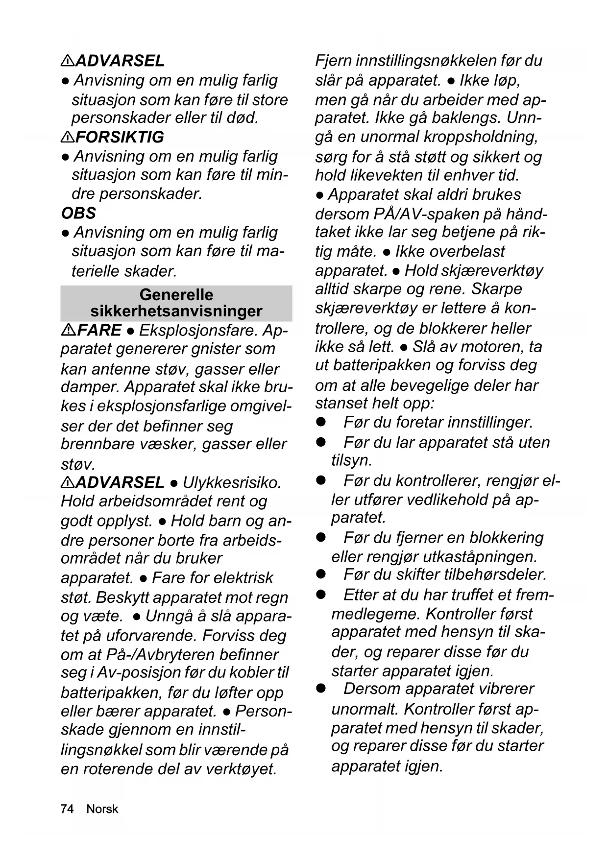 - EU-samsvarserklæring Norsk 몇 ADVARSEL ● Anvisning om en mulig farlig situasjon som kan føre til store personskader eller til død. 몇 FORSIKTIG ● Anvisning om en mulig farlig situasjon som kan føre til min- dre personskader. OBS ● Anvisning om en mulig farlig situasjon som kan føre til ma- terielle skader. Generelle sikkerhetsanvisninger FARE ● Eksplosjonsfare. Ap- paratet genererer gnister som kan antenne støv, gasser eller damper. Apparatet skal ikke bru- kes i eksplosjonsfarlige omgivel- ser der det befinner seg brennbare væsker, gasser eller støv. 몇 ADVARSEL ● Ulykkesrisiko. Hold arbeidsområdet rent og godt opplyst. ● Hold barn og an- dre personer borte fra arbeids- området når du bruker apparatet. ● Fare for elektrisk støt. Beskytt apparatet mot regn og væte. ● Unngå å slå appara- tet på uforvarende. Forviss deg om at På-/Avbryteren befinner seg i Av-posisjon før du kobler til batteripakken, før du løfter opp eller bærer apparatet. ● Person- skade gjennom en innstil- lingsnøkkel som blir værende på en roterende del av verktøyet. Fjern innstillingsnøkkelen før du slår på apparatet. ● Ikke løp, men gå når du arbeider med ap- paratet. Ikke gå baklengs. Unn- gå en unormal kroppsholdning, sørg for å stå støtt og sikkert og hold likevekten til enhver tid. ● Apparatet skal aldri brukes dersom PÅ/AV-spaken på hånd- taket ikke lar seg betjene på rik- tig måte. ● Ikke overbelast apparatet. ● Hold skjæreverktøy alltid skarpe og rene. Skarpe skjæreverktøy er lettere å kon- trollere, og de blokkerer heller ikke så lett. ● Slå av motoren, ta ut batteripakken og forviss deg om at alle bevegelige deler har stanset helt opp: Før du foretar innstillinger. Før du lar apparatet stå uten tilsyn. Før du kontrollerer, rengjør el- ler utfører vedlikehold på ap- paratet. Før du fjerner en blokkering eller rengjør utkaståpningen. Før du skifter tilbehørsdeler. Etter at du har truffet et frem- medlegeme. Kontroller først apparatet med hensyn til ska- der, og reparer disse før du starter apparatet igjen. Dersom apparatet vibrerer unormalt. Kontroller først ap- paratet med hensyn til skader, og reparer disse før du starter apparatet igjen.Norsk 75 몇 FORSIKTIG ● Apparatet må ikke drives av personer som er påvirket av medikamenter eller narkotika som innskrenker reak- sjonsevnen. Bruk kun apparatet når du er uthvilt og frisk. ● Bruk egnede verneklær når du arbei- der med apparatet. Verneutstyr som eksempelvis støvmasker, sklisikre sko, vernehjelm eller hørselsvern reduserer faren for personskade. ● Bruk vernebril- ler og hørselsvern. ● Hørsels- vern kan begrense din evne til å høre varselslyder, vær derfor oppmerksom på mulige farer i nærheten av arbeidsområdet. ● Bruk hjelm ved arbeid i områ- der der det er fare for fallende gjenstander.ADVARSEL ● Bruk lange, tykke bukser, overdeler med lange ermer og sklisikre støvler under arbeidet. Ikke ar- beid barbeint. Ikke bruk sanda- ler eller korte bukser. Unngå løstsittende klær eller klær med snorer og bånd.FORSIKTIG ● Fare for personskader ved bruk av løstsittende klær, løst hår eller smykker som kan sette seg fast i apparatets bevegelige deler. Hold klær og smykker un- na maskinens bevegelige deler. Sett opp langt hår. ● Bruk bare apparatet og tilbehøret slik det forklares i disse anvisningene, ta arbeidsbetingelsene og arbei- det som skal utføres i betrakt- ning for å unngå farlige situasjoner. Sikker drift FARE ● Fare for alvorlige personskader når gjenstander slynges ut av kniven eller lednin- ger eller snorer vikles inn i klip- peverktøyet. Arbeidsområdet skal kontrolleres nøye med hen- syn til gjenstander som steiner, kvister, metall, ledninger, kno- kler eller leketøy. Disse skal fjer- nes. 몇 ADVARSEL ● Apparatet skal ikke brukes av barn eller perso- ner med innskrenkede fysiske, sensoriske eller intellektuelle evner eller personer som ikke er fortrolige med disse anvisninge- ne. ● Bruk apparatet bare i dagslys eller ved god kunstig belysning. ● Ikke bruk apparatet i vått gress eller når det regner. ● Hold en minsteavstand på 15 m til personer og dyr. Stopp apparatet dersom noen begir seg innenfor dette området. ● Hold den påmonterte skjærea- nordningen nedenfor hoftehøy- de. ● Bruk apparatet aldri med skadde eller uten påmonterte verneinnretninger. ● Bruk aldri skjæretråd av metall. ● Bruk ap- paratet kun i områder utendørs. ● Hold hender og føtter borte fra skjærearbeidsflaten, fremfor alt når du slår på motoren. ● Fare for personskader. Knivene på76 Norsk vernedekselet til forkorting av skjæretråden er svært skarp, så unngå enhver berøring, spesielt ved rengjøring. ● Sørg for at alle ventilasjonsåpninger er frie for avleiringer. ● Kontroller appara- tet for skader hver gang før bruk og etter hvert slag. Skadde de- ler, f.eks. En bryter, må repare- res av vår autoriserte kundeservice eller skiftes ut. ● Forviss deg om at det påmon- terte drivhodet er montert og festet på fagmessig måte. ● Sørg for at alle verneinnretnin- ger, guardrails og håndtak er godt og riktig festet. ● Kontroller at trådkutteren er riktig posisjo- nert og sikret før du begynner bruken av apparatet. ● Bruk kun den originale reserveskjæretrå- den fra produsenten. Ikke bruk noen annen skjæreanordning. ● Fare for personskader. Ikke foreta noen endringer på appa- ratet. Merknad ● I noen regioner kan forskrifter bety innskrenkninger på bruken av dette apparatet. Innhent råd fra dine ansvarlige offentlige myndigheter. Sikkert vedlikehold og pleie 몇 ADVARSEL ● Etter at du har skjøvet ut en ny tråd, må du først stille apparatet i normal driftsstil- ling, før du slår på apparatet. ● Sørg for at apparatet er i sikker stand ved å regelmessig sjekke at bolter, muttere og skruer sitter godt fast. ● Kontroller at beve- gelige deler fungerer uten pro