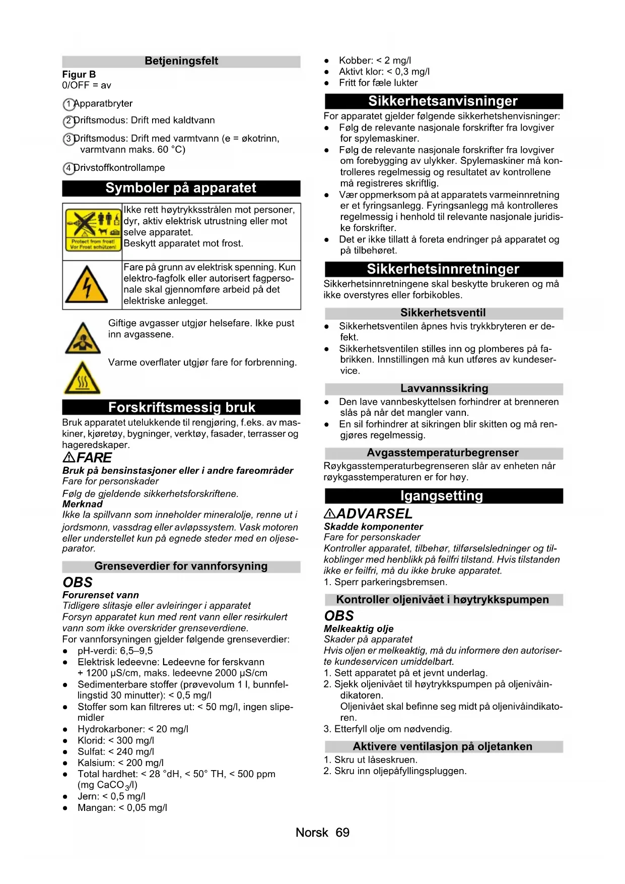 /l) ● Jern: < 0,5 mg/l ● Mangan: < 0,05 mg/l ● Kobber: < 2 mg/l ● Aktivt klor: < 0,3 mg/l ● Fritt for fæle lukter Sikkerhetsanvisninger For apparatet gjelder følgende sikkerhetshenvisninger: ● Følg de relevante nasjonale forskrifter fra lovgiver for spylemaskiner. ● Følg de relevante nasjonale forskrifter fra lovgiver om forebygging av ulykker. Spylemaskiner må kon- trolleres regelmessig og resultatet av kontrollene må registreres skriftlig. ● Vær oppmerksom på at apparatets varmeinnretning er et fyringsanlegg. Fyringsanlegg må kontrolleres regelmessig i henhold til relevante nasjonale juridis- ke forskrifter. ● Det er ikke tillatt å foreta endringer på apparatet og på tilbehøret. Sikkerhetsinnretninger Sikkerhetsinnretningene skal beskytte brukeren og må ikke overstyres eller forbikobles. Sikkerhetsventil ● Sikkerhetsventilen åpnes hvis trykkbryteren er de- fekt. ● Sikkerhetsventilen stilles inn og plomberes på fa- brikken. Innstillingen må kun utføres av kundeser- vice. Lavvannssikring ● Den lave vannbeskyttelsen forhindrer at brenneren slås på når det mangler vann. ● En sil forhindrer at sikringen blir skitten og må ren- gjøres regelmessig. Avgasstemperaturbegrenser Røykgasstemperaturbegrenseren slår av enheten når røykgasstemperaturen er for høy. Igangsetting 몇 ADVARSEL Skadde komponenter Fare for personskader Kontroller apparatet, tilbehør, tilførselsledninger og til- koblinger med henblikk på feilfri tilstand. Hvis tilstanden ikke er feilfri, må du ikke bruke apparatet.