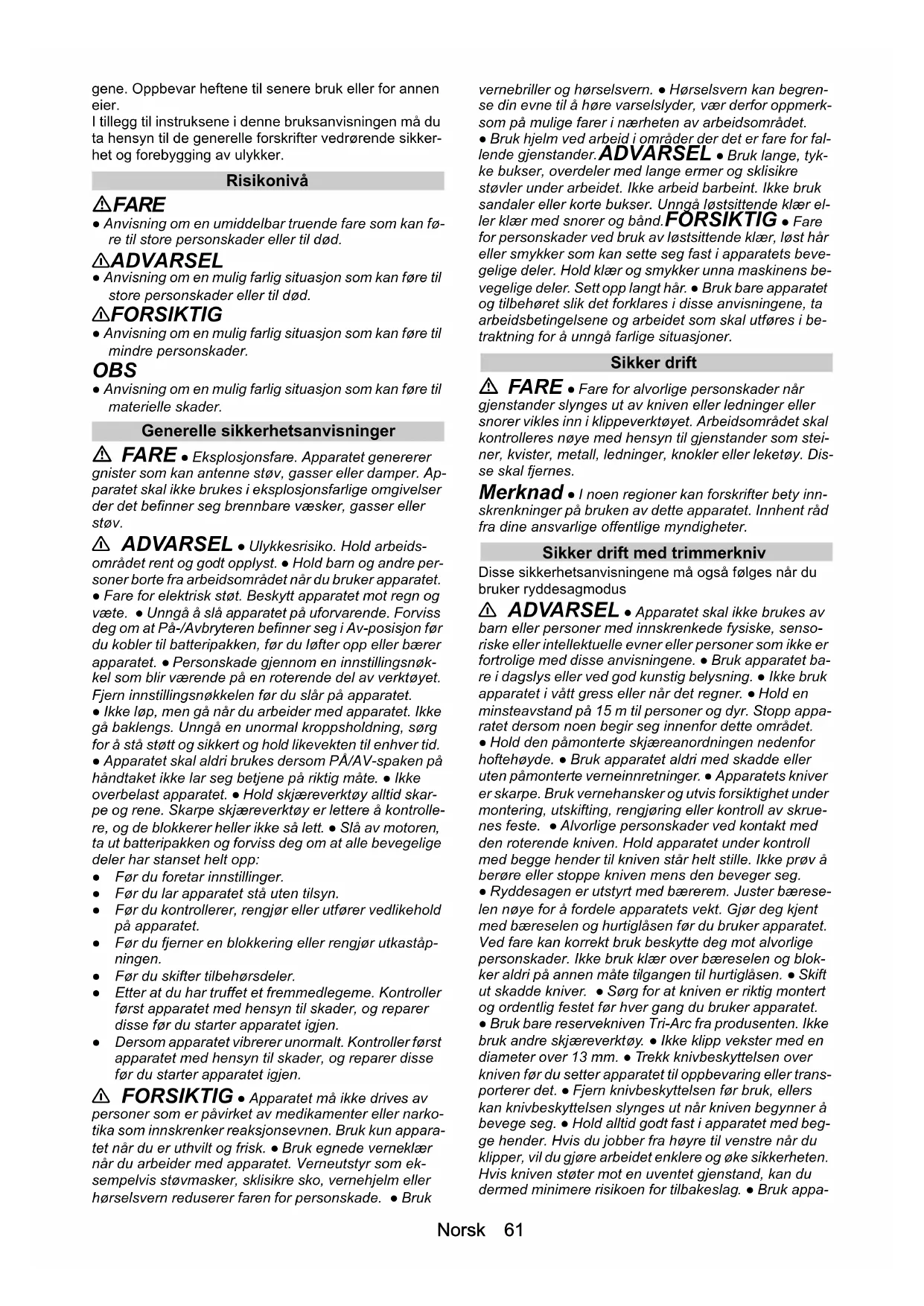 - EU-samsvarserklæring Chairman of the Board of ManagementDirector Regulatory Affairs & Certification H. Jenner S. ReiserNorsk 61 gene. Oppbevar heftene til senere bruk eller for annen eier. I tillegg til instruksene i denne bruksanvisningen må du ta hensyn til de generelle forskrifter vedrørende sikker- het og forebygging av ulykker. Risikonivå FARE ● Anvisning om en umiddelbar truende fare som kan fø- re til store personskader eller til død. 몇 ADVARSEL ● Anvisning om en mulig farlig situasjon som kan føre til store personskader eller til død. 몇 FORSIKTIG ● Anvisning om en mulig farlig situasjon som kan føre til mindre personskader. OBS ● Anvisning om en mulig farlig situasjon som kan føre til materielle skader. Generelle sikkerhetsanvisninger FARE ● Eksplosjonsfare. Apparatet genererer gnister som kan antenne støv, gasser eller damper. Ap- paratet skal ikke brukes i eksplosjonsfarlige omgivelser der det befinner seg brennbare væsker, gasser eller støv. 몇 ADVARSEL ● Ulykkesrisiko. Hold arbeids- området rent og godt opplyst. ● Hold barn og andre per- soner borte fra arbeidsområdet når du bruker apparatet. ● Fare for elektrisk støt. Beskytt apparatet mot regn og væte. ● Unngå å slå apparatet på uforvarende. Forviss deg om at På-/Avbryteren befinner seg i Av-posisjon før du kobler til batteripakken, før du løfter opp eller bærer apparatet. ● Personskade gjennom en innstillingsnøk- kel som blir værende på en roterende del av verktøyet. Fjern innstillingsnøkkelen før du slår på apparatet. ● Ikke løp, men gå når du arbeider med apparatet. Ikke gå baklengs. Unngå en unormal kroppsholdning, sørg for å stå støtt og sikkert og hold likevekten til enhver tid. ● Apparatet skal aldri brukes dersom PÅ/AV-spaken på håndtaket ikke lar seg betjene på riktig måte. ● Ikke overbelast apparatet. ● Hold skjæreverktøy alltid skar- pe og rene. Skarpe skjæreverktøy er lettere å kontrolle- re, og de blokkerer heller ikke så lett. ● Slå av motoren, ta ut batteripakken og forviss deg om at alle bevegelige deler har stanset helt opp: ● Før du foretar innstillinger. ● Før du lar apparatet stå uten tilsyn. ● Før du kontrollerer, rengjør eller utfører vedlikehold på apparatet. ● Før du fjerner en blokkering eller rengjør utkaståp- ningen. ● Før du skifter tilbehørsdeler. ● Etter at du har truffet et fremmedlegeme. Kontroller først apparatet med hensyn til skader, og reparer disse før du starter apparatet igjen. ● Dersom apparatet vibrerer unormalt. Kontroller først apparatet med hensyn til skader, og reparer disse før du starter apparatet igjen. 몇 FORSIKTIG ● Apparatet må ikke drives av personer som er påvirket av medikamenter eller narko- tika som innskrenker reaksjonsevnen. Bruk kun appara- tet når du er uthvilt og frisk. ● Bruk egnede verneklær når du arbeider med apparatet. Verneutstyr som ek- sempelvis støvmasker, sklisikre sko, vernehjelm eller hørselsvern reduserer faren for personskade. ● Bruk vernebriller og hørselsvern. ● Hørselsvern kan begren- se din evne til å høre varselslyder, vær derfor oppmerk- som på mulige farer i nærheten av arbeidsområdet. ● Bruk hjelm ved arbeid i områder der det er fare for fal- lende gjenstander. ADVARSEL ● Bruk lange, tyk- ke bukser, overdeler med lange ermer og sklisikre støvler under arbeidet. Ikke arbeid barbeint. Ikke bruk sandaler eller korte bukser. Unngå løstsittende klær el- ler klær med snorer og bånd. FORSIKTIG ● Fare for personskader ved bruk av løstsittende klær, løst hår eller smykker som kan sette seg fast i apparatets beve- gelige deler. Hold klær og smykker unna maskinens be- vegelige deler. Sett opp langt hår. ● Bruk bare apparatet og tilbehøret slik det forklares i disse anvisningene, ta arbeidsbetingelsene og arbeidet som skal utføres i be- traktning for å unngå farlige situasjoner. Sikker drift FARE ● Fare for alvorlige personskader når gjenstander slynges ut av kniven eller ledninger eller snorer vikles inn i klippeverktøyet. Arbeidsområdet skal kontrolleres nøye med hensyn til gjenstander som stei- ner, kvister, metall, ledninger, knokler eller leketøy. Dis- se skal fjernes. Merknad ● I noen regioner kan forskrifter bety inn- skrenkninger på bruken av dette apparatet. Innhent råd fra dine ansvarlige offentlige myndigheter. Sikker drift med trimmerkniv Disse sikkerhetsanvisningene må også følges når du bruker ryddesagmodus 몇 ADVARSEL ● Apparatet skal ikke brukes av barn eller personer med innskrenkede fysiske, senso- riske eller intellektuelle evner eller personer som ikke er fortrolige med disse anvisningene. ● Bruk apparatet ba- re i dagslys eller ved god kunstig belysning. ● Ikke bruk apparatet i vått gress eller når det regner. ● Hold en minsteavstand på 15 m til personer og dyr. Stopp appa- ratet dersom noen begir seg innenfor dette området. ● Hold den påmonterte skjæreanordningen nedenfor hoftehøyde. ● Bruk apparatet aldri med skadde eller uten påmonterte verneinnretninger. ● Apparatets kniver er skarpe. Bruk vernehansker og utvis forsiktighet under montering, utskifting, rengjøring eller kontroll av skrue- nes feste. ● Alvorlige personskader ved kontakt med den roterende kniven. Hold apparatet under kontroll med begge hender til kniven står helt stille. Ikke prøv å berøre eller stoppe kniven mens den beveger seg. ● Ryddesagen er utstyrt med bærerem. Juster bærese- len nøye for å fordele apparatets vekt. Gjør deg kjent med bæreselen og hurtiglåsen før du bruker apparatet. Ved fare kan korrekt bruk beskytte deg mot alvorlige personskader. Ikke bruk klær over bæreselen og blok- ker aldri på annen måte tilgangen til hurtiglåsen. ● Skift ut skadde kniver. ● Sørg for at kniven er riktig montert og ordentlig festet før hver gang du bruker apparatet. ● Bruk bare reservekniven Tri-Arc fra produsenten. Ikke bruk andre skj