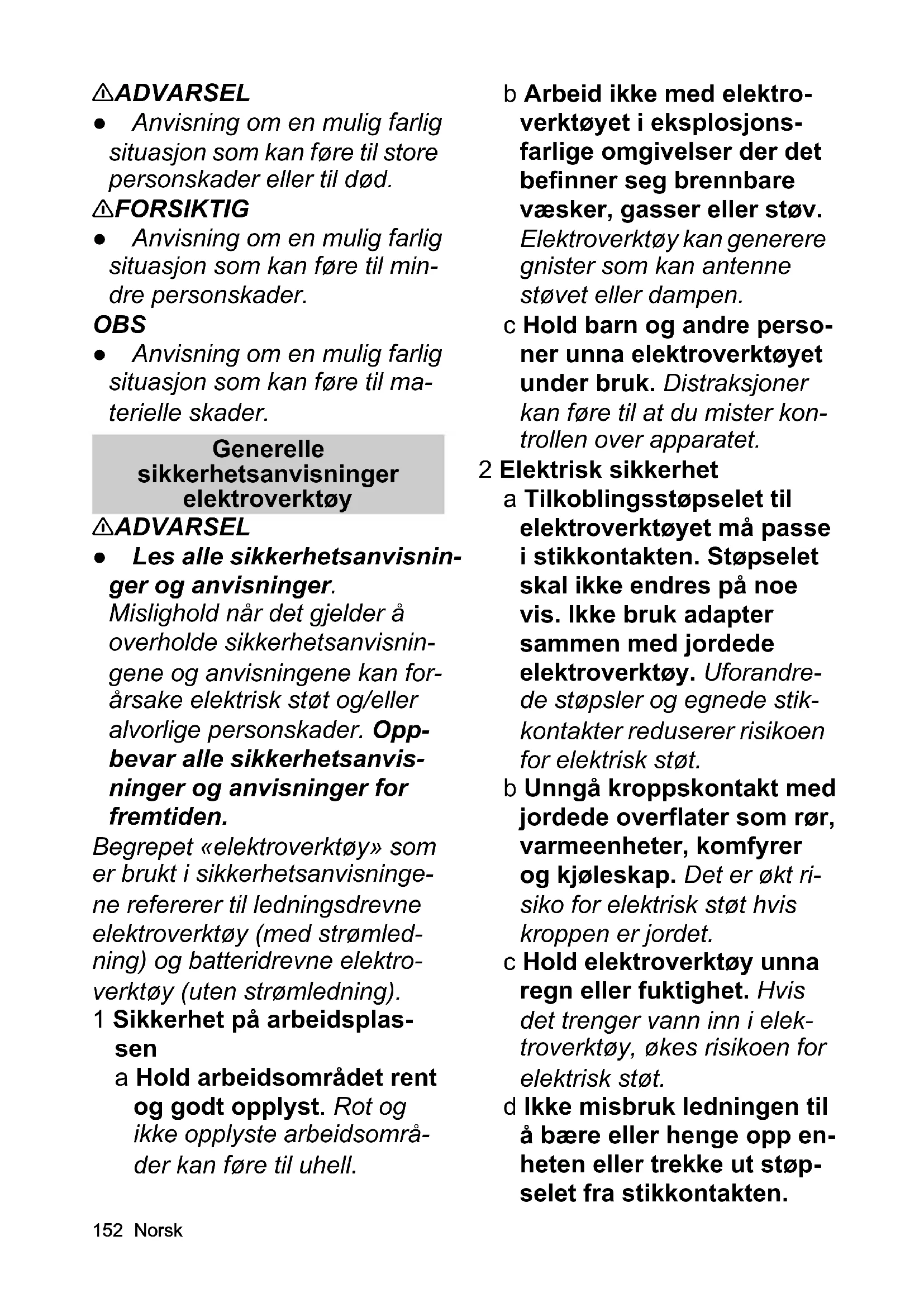 - Underskriverne handler på bestyrelsens vegne og med dennes fuldmagt. Dokumentationsbefuldmægtiget: S. Reiser Alfred Kärcher SE & Co. KG Alfred-Kärcher-Str. 28 - 40 71364 Winnenden (Germany) Tlf.: +49 7195 14-0 Fax: +49 7195 14-2212 Winnenden, 2018/09/01 Indhold Generelle merknader Før du tar i bruk apparatet første gang, må du lese og følge sikkerhetshenvisningene, den originale bruksanvisningen, de vedlagte sikkerhetshenvis- ningene for batteripakken og den vedlagte originale bruksan- visningen for batteripakken/la- deren. Følg anvisningene. Oppbevar heftene til senere bruk eller for annen eier. I tillegg til instruksene i denne bruksanvisningen må du ta hen- syn til de generelle forskrifter vedrørende sikkerhet og fore- bygging av ulykker. Sikkerhetsanvisninger Ved arbeid med motorsager er det svært stor fare for person- skader, siden det arbeides med høye motorhastigheter og veldig skarpe sagtenner. Ta hensyn til sikkerhetstilta- kene og forholdsreglene for arbeid med motorsager. Som en supplering til disse sik- kerhetsanvisningene må nasjo- nale sikkerhets- og utdannelsesforskrifter (for ek- sempel fra myndigheter, fagfo- reninger eller sosiale instanser) tas hensyn til. Bruken av mot- orsager kan være tidsbegrenset gjennom lokale forskrifter (dags- eller årstid). Følg de lokale for- skriftene. Risikonivå FARE ● Anvisning om en umiddelbar truende fare som kan føre til store personskader eller til død. Generelle merknader p. 151