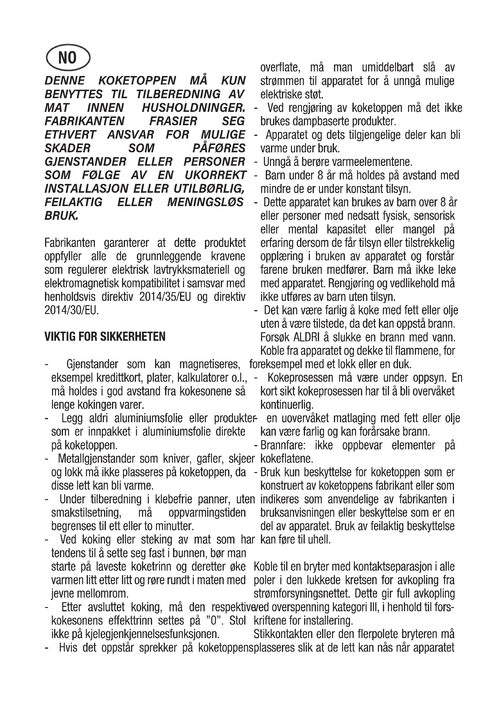 - Gjenstander som kan magnetiseres, for eksempel kredittkort, plater, kalkulatorer o.l., må holdes i god avstand fra kokesonene så lenge kokingen varer. - Legg aldri aluminiumsfolie eller produkter som er innpakket i aluminiumsfolie direkte på koketoppen. - Metallgjenstander som kniver, gafler, skjeer og lokk må ikke plasseres på koketoppen, da disse lett kan bli varme. - Under tilberedning i klebefrie panner, uten smakstilsetning, må oppvarmingstiden begrenses til ett eller to minutter. - Ved koking eller steking av mat som har tendens til å sette seg fast i bunnen, bør man starte på laveste koketrinn og deretter øke varmen litt etter litt og røre rundt i maten med jevne mellomrom. - Etter avsluttet koking, må den respektive kokesonens effekttrinn settes på ”0”. Stol ikke på kjelegjenkjennelsesfunksjonen. - Hvis det oppstår sprekker på koketoppens overflate, må man umiddelbart slå av strømmen til apparatet for å unngå mulige elektriske støt. - Ved rengjøring av koketoppen må det ikke brukes dampbaserte produkter. - Apparatet og dets tilgjengelige deler kan bli varme under bruk. - Unngå å berøre varmeelementene. - Barn under 8 år må holdes på avstand med mindre de er under konstant tilsyn. - Dette apparatet kan brukes av barn over 8 år eller personer med nedsatt fysisk, sensorisk eller mental kapasitet eller mangel på erfaring dersom de får tilsyn eller tilstrekkelig opplæring i bruken av apparatet og forstår farene bruken medfører. Barn må ikke leke med apparatet. Rengjøring og vedlikehold må ikke utføres av barn uten tilsyn. - Det kan være farlig å koke med fett eller olje uten å være tilstede, da det kan oppstå brann. Forsøk ALDRI å slukke en brann med vann. Koble fra apparatet og dekke til flammene, for eksempel med et lokk eller en duk. - Kokeprosessen må være under oppsyn. En kort sikt kokeprosessen har til å bli overvåket kontinuerlig. - en uovervåket matlaging med fett eller olje kan være farlig og kan forårsake brann. - Brannfare: ikke oppbevar elementer på kokeflatene.