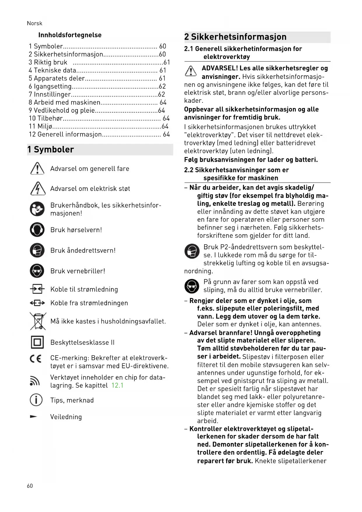 spesifikke for maskinen – Når du arbeider, kan det avgis skadelig/ giftig støv (for eksempel fra blyholdig ma ling, enkelte treslag og metall). Berøring eller innånding av dette støvet kan utgjøre en fare for operatøren eller personer som befinner seg i nærheten. Følg sikkerhets forskriftene som gjelder for ditt land. Bruk P2-åndedrettsvern som beskyttel se. I lukkede rom må du sørge for til strekkelig lufting og koble til en avsugsa nordning. På grunn av farer som kan oppstå ved sliping, må du alltid bruke vernebriller. – Rengjør deler som er dynket i olje, som f.eks. slipepute eller poleringsfilt, med vann. Legg dem utover og la dem tørke. Deler som er dynket i olje, kan antennes. – Advarsel brannfare! Unngå overoppheting av det slipte materialet eller sliperen. Tøm alltid støvbeholderen før du tar pau ser i arbeidet. Slipestøv i filterposen eller filteret til den mobile støvsugeren kan selv antennes under ugunstige forhold, for ek sempel ved gnistsprut fra sliping av metall. Det er spesielt farlig når slipestøvet har blandet seg med lakk- eller polyuretanre ster eller andre kjemiske stoffer og det slipte materialet er varmt etter langvarig arbeid. – Kontroller elektroverktøyet og slipetal lerkenen for skader dersom de har falt ned. Demonter slipetallerkenen for å kon trollere den ordentlig. Få ødelagte deler reparert før bruk. Knekte slipetallerkener Norsk 60og skadde maskiner kan føre til skader og fører til at maskinen ikke lenger er sikker. – Bruk kun originale slipetallerkener fra Festool. Tallerkener fra andre produsenter er ikke egnet for denne sliperens turtall og kan brekke. – Det kan oppstå elektrisk ladning når Longlife-støvposen brukes. Bruk alltid en antistatisk sugeslange (AS) sammen med elektroverktøyet. Lettere elektriske støt kan føre til at man skvetter og blir mindre oppmerksom, noe som kan forårsake ulyk ker. – Bruk nettadapteren kun med dette appara tet. – Bruk nettadapteren kun med en original plug it-kabel fra Festool. – Ikke bruk det batteridrevne elektroverk tøyet med strømadaptere eller batterier fra andre produsenter. Ikke lad batteriet med ladere fra andre produsenter. Bruker du tilbehør som ikke er godkjent av produ senten, kan dette føre til elektrisk støt og/ eller alvorlige ulykker.