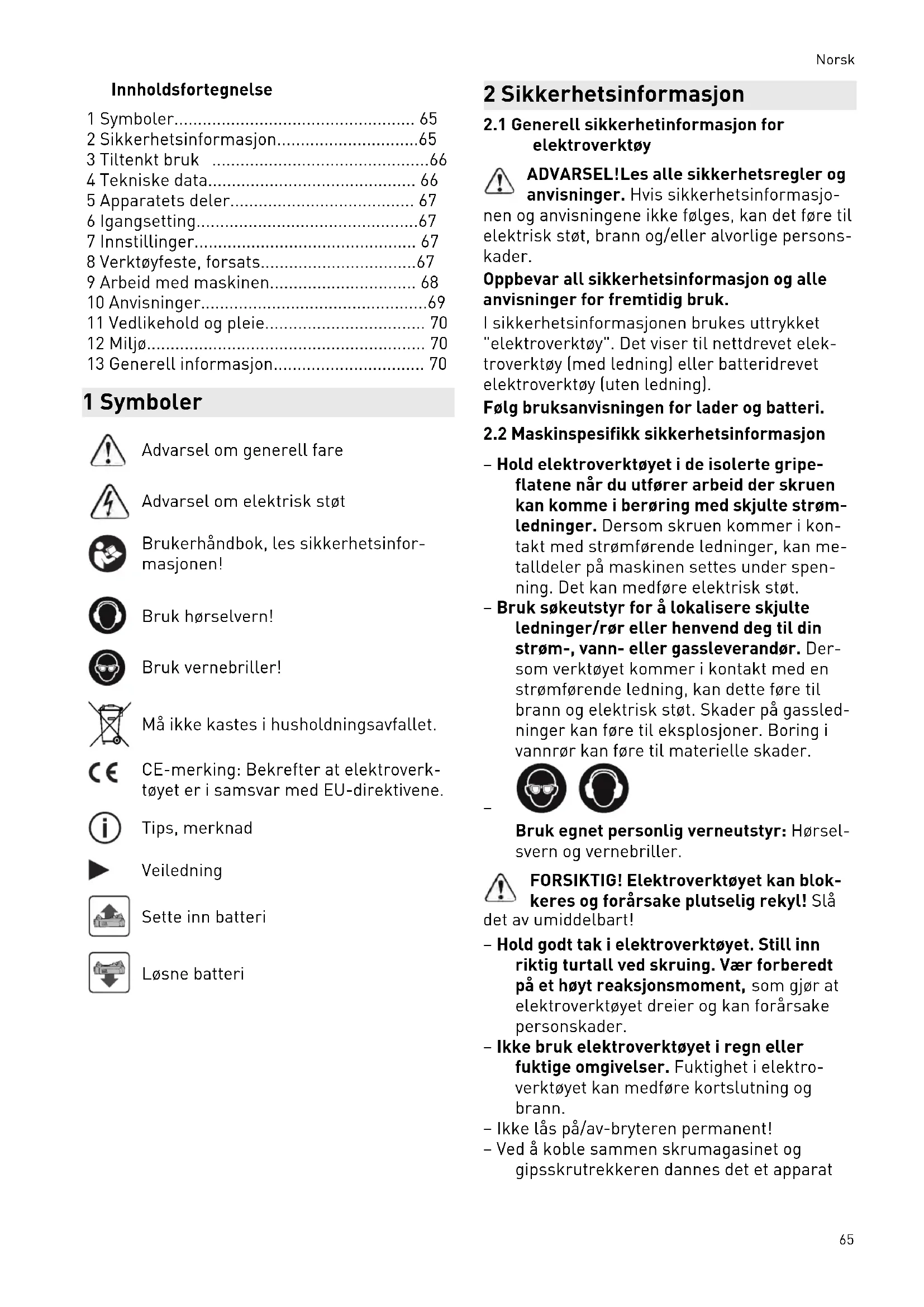 Bruk egnet personlig verneutstyr: Hørsel svern og vernebriller. FORSIKTIG! Elektroverktøyet kan blok keres og forårsake plutselig rekyl! Slå det av umiddelbart! – Hold godt tak i elektroverktøyet. Still inn riktig turtall ved skruing. Vær forberedt på et høyt reaksjonsmoment, som gjør at elektroverktøyet dreier og kan forårsake personskader. – Ikke bruk elektroverktøyet i regn eller fuktige omgivelser. Fuktighet i elektro verktøyet kan medføre kortslutning og brann. – Ikke lås på/av-bryteren permanent! – Ved å koble sammen skrumagasinet og gipsskrutrekkeren dannes det et apparat Norsk 65som sikkerhetsforskriftene og -instruksene til gipsskrutrekkeren gjelder for. – Ikke bruk det batteridrevne elektroverk tøyet med strømadaptere eller batterier fra andre produsenter. Ikke lad batteriet med ladere fra andre produsenter. Bruker du tilbehør som ikke er godkjent av produ senten, kan dette føre til elektrisk støt og/ eller alvorlige ulykker.