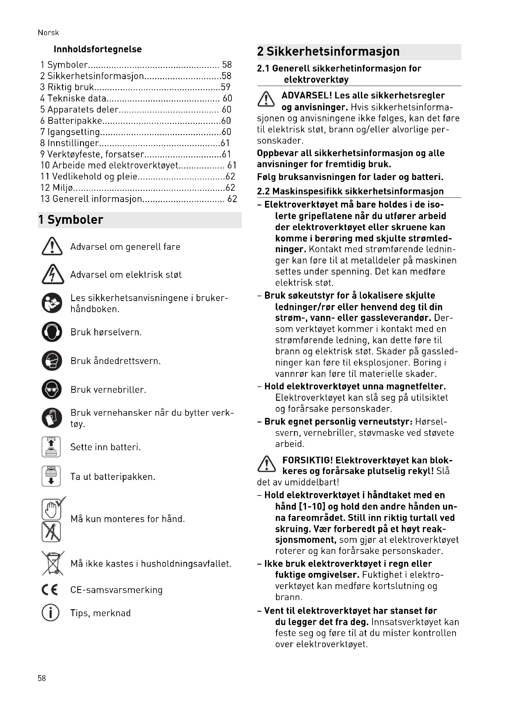 – Elektroverktøyet må bare holdes i de iso lerte gripeflatene når du utfører arbeid der elektroverktøyet eller skruene kan komme i berøring med skjulte strømled ninger. Kontakt med strømførende lednin ger kan føre til at metalldeler på maskinen settes under spenning. Det kan medføre elektrisk støt. – Bruk søkeutstyr for å lokalisere skjulte ledninger/rør eller henvend deg til din strøm-, vann- eller gassleverandør. Der som verktøyet kommer i kontakt med en strømførende ledning, kan dette føre til brann og elektrisk støt. Skader på gassled ninger kan føre til eksplosjoner. Boring i vannrør kan føre til materielle skader. – Hold elektroverktøyet unna magnetfelter. Elektroverktøyet kan slå seg på utilsiktet og forårsake personskader. – Bruk egnet personlig verneutstyr: Hørsel svern, vernebriller, støvmaske ved støvete arbeid. FORSIKTIG! Elektroverktøyet kan blok keres og forårsake plutselig rekyl! Slå det av umiddelbart! – Hold elektroverktøyet i håndtaket med en hånd[1-10] og hold den andre hånden un na fareområdet. Still inn riktig turtall ved skruing. Vær forberedt på et høyt reak sjonsmoment, som gjør at elektroverktøyet roterer og kan forårsake personskader. – Ikke bruk elektroverktøyet i regn eller fuktige omgivelser. Fuktighet i elektro verktøyet kan medføre kortslutning og brann. – Vent til elektroverktøyet har stanset før du legger det fra deg. Innsatsverktøyet kan feste seg og føre til at du mister kontrollen over elektroverktøyet. Norsk 58– Betjeningselementene, f.eks. på-/av-bryte ren, må ikke manipuleres eller blokkeres. – Bruk kun de batteripakkene som er be regnet til formålet, og ikke bruk strø madaptere til dette batteridrevne elektro verktøyet. Ikke lad batteripakken med la dere fra andre produsenter. Bruker du tilbehør som ikke er godkjent av produsen ten, kan dette føre til elektrisk støt og/eller alvorlige ulykker. – Ikke bruk innsatsverktøy og tilbehør som ikke er blitt utviklet eller anbefalt spesielt for dette elektroverktøyet av produsen ten. Selv om tilbehøret eller innsatsverk tøyet lar seg feste på elektroverktøyet, ga ranterer ikke dette sikker bruk. Det kan oppstå økt risiko for personskader samt slitasje på elektroverktøyet, og kvaliteten på arbeidsresultatene kan forringes. – Alt etter typen av tilbehør og hvordan det brukes, kan partikler, innsatsverktøy et og deler av innsatsverktøyet løsne. Det kan oppstå økt støvbelastning og uventede bevegelser. Bruk egnet personlig verneut styr. Vær forberedt på et høyt reaksjons moment, som gjør at elektroverktøyet rote rer og kan forårsake personskader.