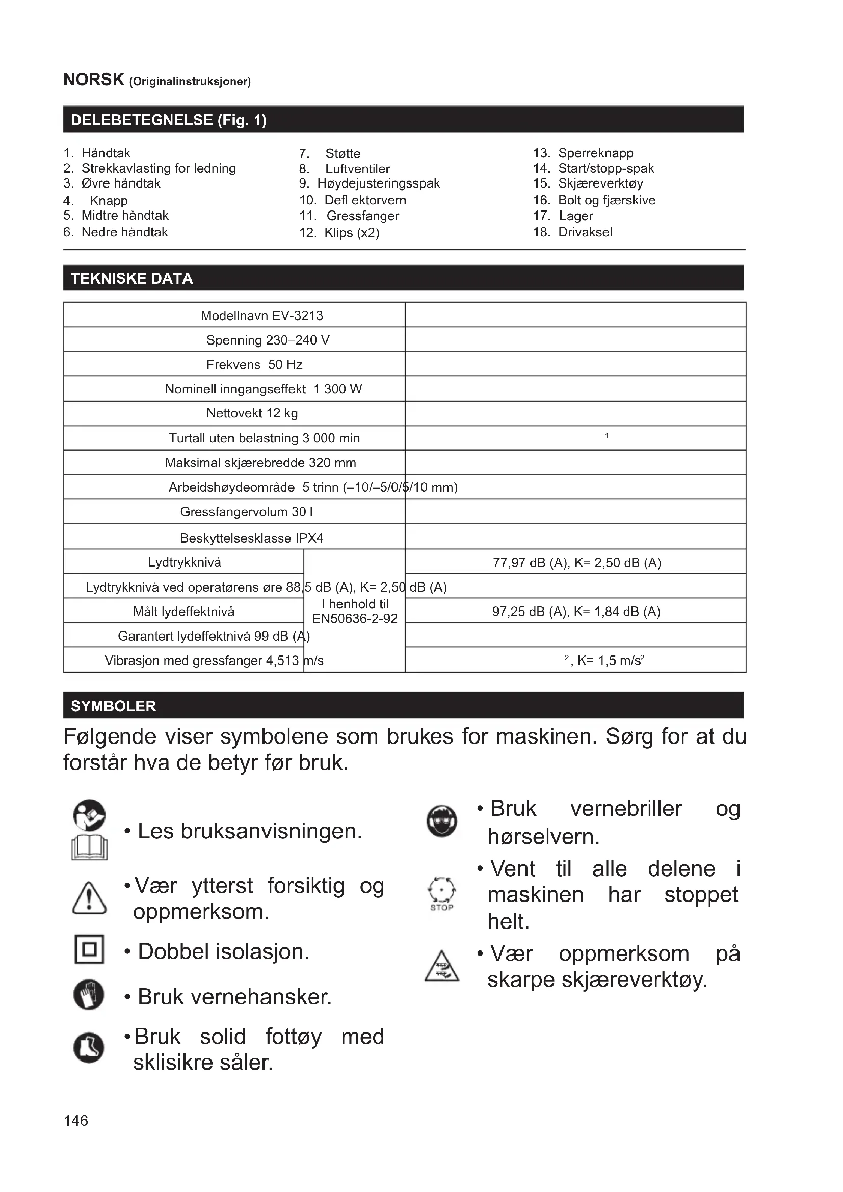 Maksimal skjærebredde 320 mm Arbeidshøydeområde 5 trinn (–10/–5/0/5/10 mm) Gressfangervolum 30 l Beskyttelsesklasse IPX4 Lydtrykknivå I henhold til EN50636-2-92 77,97 dB (A), K= 2,50 dB (A) Lydtrykknivå ved operatørens øre 88,5 dB (A), K= 2,50 dB (A) Målt lydeffektnivå 97,25 dB (A), K= 1,84 dB (A) Garantert lydeffektnivå 99 dB (A) Vibrasjon med gressfanger 4,513 m/s
