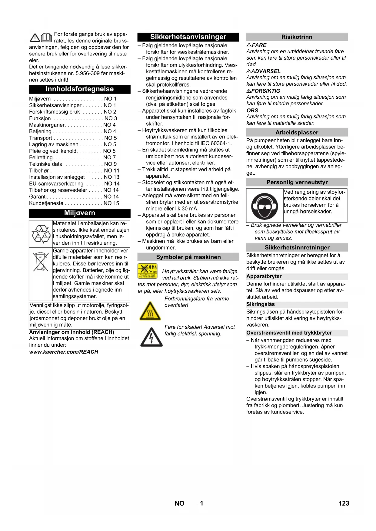 Skru dysen af. Lad maskinen køre så længe, indtil van- det træder blæsefrit ud. Lad maskinen kære evt. 10 sekunder - sluk den. Gentag denne procedure flere gange. Sluk for maskinen og skru dysen på igen. Hermed erklærer vi, at den nedenfor nævn- te maskine i design og konstruktion og i den af os i handlen bragte udgave overholder de gældende grundlæggende sikkerheds- og sundhedskrav i EU-direktiverne. Ved ændringer af maskinen, der foretages uden forudgående aftale med os, mister denne erklæring sin gyldighed. Undertegnede agerer på vegne af og med fuldmagt fra ledelsen. Dokumentationsbefuldmægtiget: S. Reiser Alfred Kärcher GmbH & Co. KG Alfred-Kärcher-Str. 28 - 40 71364 Winnenden (Germany) Tlf.: +49 7195 14-0 Fax: +49 7195 14-2212 Winnenden, 2016/11/01 Anvend kun originaltilbehør og -reservede- le. De er en garanti for en sikker og fejlfri drift af maskinen. Informationer om tilbehør og reservedele findes www.kaercher.com I de enkelte lande gælder de af vore for- handlere fastlagte garantibetingelser. Eventuelle fejl på din maskine afhjælpes gratis inden for garantifristen, såfremt ma- teriale- og produktionsfejl er skyld i disse fejl. Garantien træder kun i kraft hvis forhandle- ren ved købet udfylder, afstempler og un- derskriver det vedlagte svarkort og du der- efter sender svarkortet til salgsselskabet i dit land. Hvis du vil gøre din garanti gældende, be- des du henvende dig til din forhandler eller nærmeste autoriserede kundeservice med tilbehør og kvittering. Indstillinger Beredskabsperiode Monteringssæt Blødgører (option) Maskinen skal afluftes EU-overensstemmelses- erklæring Produkt: Højtryksrenser Type: 1.524-xxx Gældende EU-direktiver 2006/42/EF (+2009/127/EF) 2014/30/EU Anvendte harmoniserede standarder EN 55014–1: 2006+A1: 2009+A2: 2011 EN 55014–2: 2015 EN 60335–1 EN 60335–2–79 EN 61000–3–2: 2006+A1: 2009+A2: 2009 EN 61000–3–3: 2013 EN 62233: 2008 Tilbehør og reservedele Garanti CEO Head of Approbation 121DA- 15 Prøvet af: Diagnose: Prøvet af: Diagnose: Prøvet af: Diagnose: Prøvet af: Diagnose: Kundeservice Anlægstype: Produktionsnr. Ibrugtagning den: Underskrift Underskrift Underskrift Underskrift 122 DA- 1 Før første gangs bruk av appa- ratet, les denne originale bruks- anvisningen, følg den og oppbevar den for senere bruk eller for overlevering til neste eier. Det er tvingende nødvendig å lese sikker- hetsinstruksene nr. 5.956-309 før maski- nen settes i drift! Anvisninger om innhold (REACH) Aktuell informasjon om stoffene i innholdet finner du under: www.kaercher.com/REACH – Følg gjeldende lovpålagte nasjonale forskrifter for væskestrålemaskiner. – Følg gjeldende lovpålagte nasjonale forskrifter om ulykkesforhindring. Væs- kestrålemaskinen må kontrolleres re- gelmessig og resultatene av kontrollen skal protokollføres. – Sikkerhetsanvisningene vedrørende rengjøringsmidlene som anvendes (dvs. på etiketten) skal følges. – Apparatet skal kun installeres av fagfolk under hensyntaken til nasjonale for- skrifter. – Høytrykksvaskeren må kun tilkobles strømuttak som er installert av en elek- tromontør, i henhold til IEC 60364-1. – En skadet strømledning må skiftes ut umiddelbart hos autorisert kundeser- vice eller autorisert elektriker. – Trekk alltid ut støpselet ved arbeid på apparatet. – Støpselet og stikkontakten må også et- ter installasjonen være fritt tilgjengelige. – Anlegget må være sikret med en feil- strømbryter med en utløserstrømstyrke mindre eller lik 30 mA. – Apparatet skal bare brukes av personer som er opplært i eller kan dokumentere kjennskap til bruken, og som har fått i oppdrag å bruke apparatet. – Maskinen må ikke brukes av barn eller ungdommer. Høytrykkstråler kan være farlige ved feil bruk. Strålen må ikke ret- tes mot personer, dyr, elektrisk utstyr som er på, eller høytrykksvaskeren selv. FARE Anvisning om en umiddelbar truende fare som kan føre til store personskader eller til død. 몇 ADVARSEL Anvisning om en mulig farlig situasjon som kan føre til store personskader eller til død. 몇 FORSIKTIG Anvisning om en mulig farlig situasjon som kan føre til mindre personskader. OBS Anvisning om en mulig farlig situasjon som kan føre til materielle skader. På pumpeenheten blir anlegget bare inn- og utkoblet. Ytterligere arbeidsplasser be- finner seg ved tilbehørsapparatene (spyle- innretninger) som er tilknyttet tappestede- ne, avhengig av oppbyggingen av anleg- get. – Bruk egnede verneklær og vernebriller som beskyttelse mot tilbakesprut av vann og smuss. Sikkerhetsinnretninger er beregnet for å beskytte brukeren og må ikke settes ut av drift eller omgås. Denne forhindrer utilsiktet start av appara- tet. Slå av ved arbeidspauser og etter av- sluttet arbeid. Sikringslåsen på håndsprøytepistolen for- hindrer utilsiktet aktivering av høytrykks- vaskeren. – Når vannmengden reduseres med trykk-/mengdereguleringen, åpner overstrømsventilen og en del av vannet går tilbake til pumpens sugeside. – Hvis spaken på håndsprøytespistolen slippes, slår en trykkbryter av pumpen, og høytrykksstrålen stopper. Når spa- ken betjenes igjen, kobles pumpen inn igjen. Overstrømsventil og trykkbryter er innstilt fra fabrikk og plombert. Justering må kun foretas av kundeservice. Innholdsfortegnelse Miljøvern . . . . . . . . . . . . . . . . . NO 1 Sikkerhetsanvisninger . . . . . . . NO 1 Forskriftsmessig bruk . . . . . . . NO 2 Funksjon . . . . . . . . . . . . . . . . . NO 3 Maskinorganer. . . . . . . . . . . . . NO 4 Betjening . . . . . . . . . . . . . . . . . NO 4 Transport . . . . . . . . . . . . . . . . . NO 5 Lagring av maskinen . . . . . . . . NO 5 Pleie og vedlikehold. . . . . . . . . NO 5 Feilretting. . . . . . . . . . . . . . . . . NO 7 Tekniske data . . . . . . . . . . . . . NO 9 Tilbehør . . . . . . . . . . . . . . . . . . NO 11 Installasjon av anlegget . . . . . . NO 13 EU-samsvarserklæring . . . . . . NO 