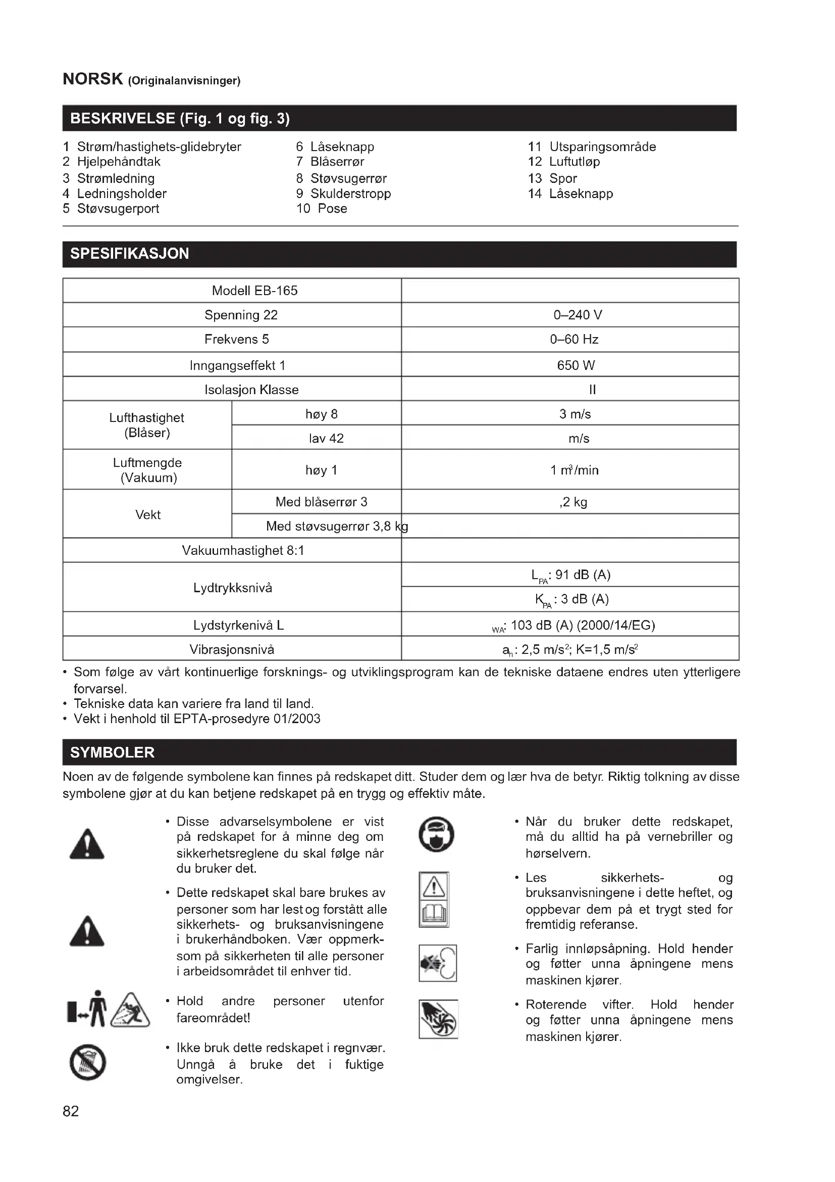 1 Utsparingsområde 12 Luftutløp 13 Spor 14 Låseknapp SPESIFIKASJON Modell EB-165 Spenning 22 0–240 V Frekvens 5 0–60 Hz Inngangseffekt 1 650 W Isolasjon Klasse