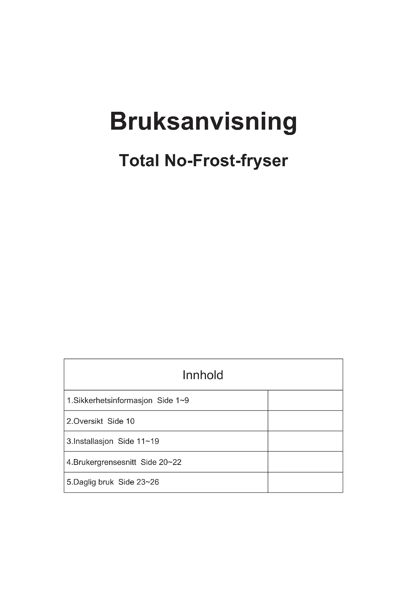 - Quando è tutto asciutto, l'elettrodomestico può essere rimesso in servizio. Sostituzione della lampada L'illuminazione interna è a LED. Per sostituire la lampada, rivolgersi a un tecnico qualificato. Soluzione dei problemi Attenzione! Prima di tentare di risolvere un problema, scollegare l'alimentazione. Le procedure per la soluzione dei problemi non riportate nel presente manuale devono essere eseguite solo da un elettricista qualificato. Importante Alcuni rumori (compressore, circolazione del refrigerante) sono normali e non indicano malfunzionamenti. 25Inutilizzo per lunghi periodi ¾ Se l'elettrodomestico non viene utilizzato per un lungo periodo di tempo: ¾ Togliere gli alimenti e staccare il cavo di alimentazione. ¾ Pulire l'elettrodomestico come descritto nella sezione "Cura e pulizia - Generalità". ¾ Per evitare la produzione di cattivi odori all'interno, lasciare aperti gli sportelli dell'elettrodomestico e i cassetti del congelatore. Interruzione della corrente In caso di interruzione della corrente, per mantenere freddi gli alimenti in maniera sicura vedere la targhetta. Durante un'interruzione prolungata della corrente, soprattutto in estate, attenersi ai suggerimenti seguenti: ¾ Limitare al massimo l'apertura dello sportello o del cassetto. ¾ In caso di interruzione della corrente, non collocare altri alimenti nell'elettrodomestico. ¾ Se viene fornito un preavviso di interruzione della corrente di durata superiore al numero di ore indicate sulla targhetta, produrre un po' di ghiaccio e collocarlo nella parte superiore del comparto frigorifero. ¾ Il periodo di conservazione e la commestibilità degli alimenti si riducono. Per evitare rischi per la salute, gli alimenti che si scongelano devono essere consumati oppure cotti e ricongelati (se possibile). Disponibilità dei ricambi ¾ Termostati, sensori di temperatura, circuiti stampati e lampade rimangono disponibili per almeno 7 anni dopo l'immissione sul mercato dell'ultima unità del modello. ¾ Maniglie e cerniere degli sportelli, vassoi e cestelli rimangono disponibili per almeno di 7 anni e le guarnizioni degli sportelli per almeno 10 anni dopo l'immissione sul mercato dell'ultima unità del modello. Per contattare l'assistenza tecnica, visitare il nostro sito web: https://corporate.haier- europe.com/en/ Nella sezione "sito web", scegliere la marca del proprio prodotto e il proprio paese. Si aprirà il sito web specifico contenente il numero di telefono e il modulo per contattare l'assistenza tecnica. Per ulteriori informazioni sul prodotto, consultare https:// eprel.ec.europa.eu/ o effettuare una scansione del codice QR apposto sull'etichetta energetica fornita con l'elettrodomestico. 26Bruksanvisning Total No-Frost-fryser Innhold 1.Sikkerhetsinformasjon Side 1~9 2.Oversikt Side 10 3.Installasjon Side 11~19 4.Brukergrensesnitt Side 20~22 5.Daglig bruk Side 23~26Takk for at du har kjøpt dette produktet. Før du bruker kjøleskapet, må du lese denne brukerhåndboken nøye for å få best mulig ytelse. Oppbevar all dokumentasjon for senere bruk eller for andre eiere. Dette produktet er utelukkende beregnet på husholdningsbruk eller lignende bruksområder, for eksempel: - personalets kjøkkenområder i butikker, kontorer og andre arbeidsmiljøer; - på gårdsbruk, av hotellklientell, moteller og andre boligtyper - ved seng og hotell (B & B) - når det gjelder utsalgstjenester, tjenester og lignende bruksområder, er det ikke aktuelt. Dette apparatet må kun brukes for lagring av mat, eventuell annen bruk anses som farlig, og produsenten vil ikke være ansvarlig for eventuelle utelatelser. Det anbefales at du er oppmerksom på garantivilkårene. SIKKERHETSINFORMASJON Les drifts- og installasjonsinstruksjonene nøye! De inneholder viktig informasjon om hvordan du installerer, bruker og vedlikeholder apparatet. Produsenten er ikke ansvarlig hvis du ikke overholder instruksjonene og advarslene. Behold alle dokumentene for senere bruk eller for neste eier. x Ikke koble apparatet til strømforsyningen før alle paknings- og transittbeskyttere er fjernet. Hold barn borte fra emballasjen og dens deler. Kvelningsfare på grunn av brettede kartonger og plastfilm! x La kompressoroljen stå i minst fire timer før du slår på produktet for å la kompressoroljen synke hvis den transporteres horisontalt. x Kontroller at det ikke er noen transportskade. x Ikke skad kjølevæskekretsen. 1x Vedlikehold ventilasjonsåpninger i apparatets kabinett eller i den innebygde konstruksjonen må ikke tildekkes. x Ikke bruk vann til å vaske kompressorens posisjon, tørk av med en tørr klut grundig etter rengjøring for å forhindre rust. x Håndter alltid apparatet med minst to personer fordi det er tungt. x Installer og juster apparatet i et område som passer for størrelse og bruk. x Forsikre deg om at den elektriske informasjonen på typeskiltet stemmer overens med strømforsyningen. Hvis ikke, kontakt en elektriker. x Apparatet drives av en 220-240 VAC / 50 Hz strømforsyning. Unormal spenningssvingning kan føre til at apparatet ikke starter, eller at temperaturreguleringen eller kompressoren blir skadet, eller det kan være unormal støy under bruk. I slike tilfeller skal det monteres en automatisk regulator. x Bare for Storbritannia: Apparatets strømkabel er utstyrt med 3-ledningskontakt (jording) som passer til en standard 3-ledningskontakt (jordet). Aldri kutt av eller demonter den tredje pinnen (jording). Etter at apparatet er installert, skal støpselet være tilgjengelig. x Pass på at strømledningen ikke sitter fast under apparatet under og etter at apparatet er fraktet/flyttet, for å unngå at nettkabelen blir 2kuttet eller skadet. Hvis strømledningen er skadet, må den byttes ut av produsenten, serviceagenten eller tilsvarende kvalifiserte personer for å unngå fare. x Ikke installer apparatet på fuktige, oljete eller støvete steder eller utsett det for direkte sollys eller vann. x Ikke installer apparatet nær