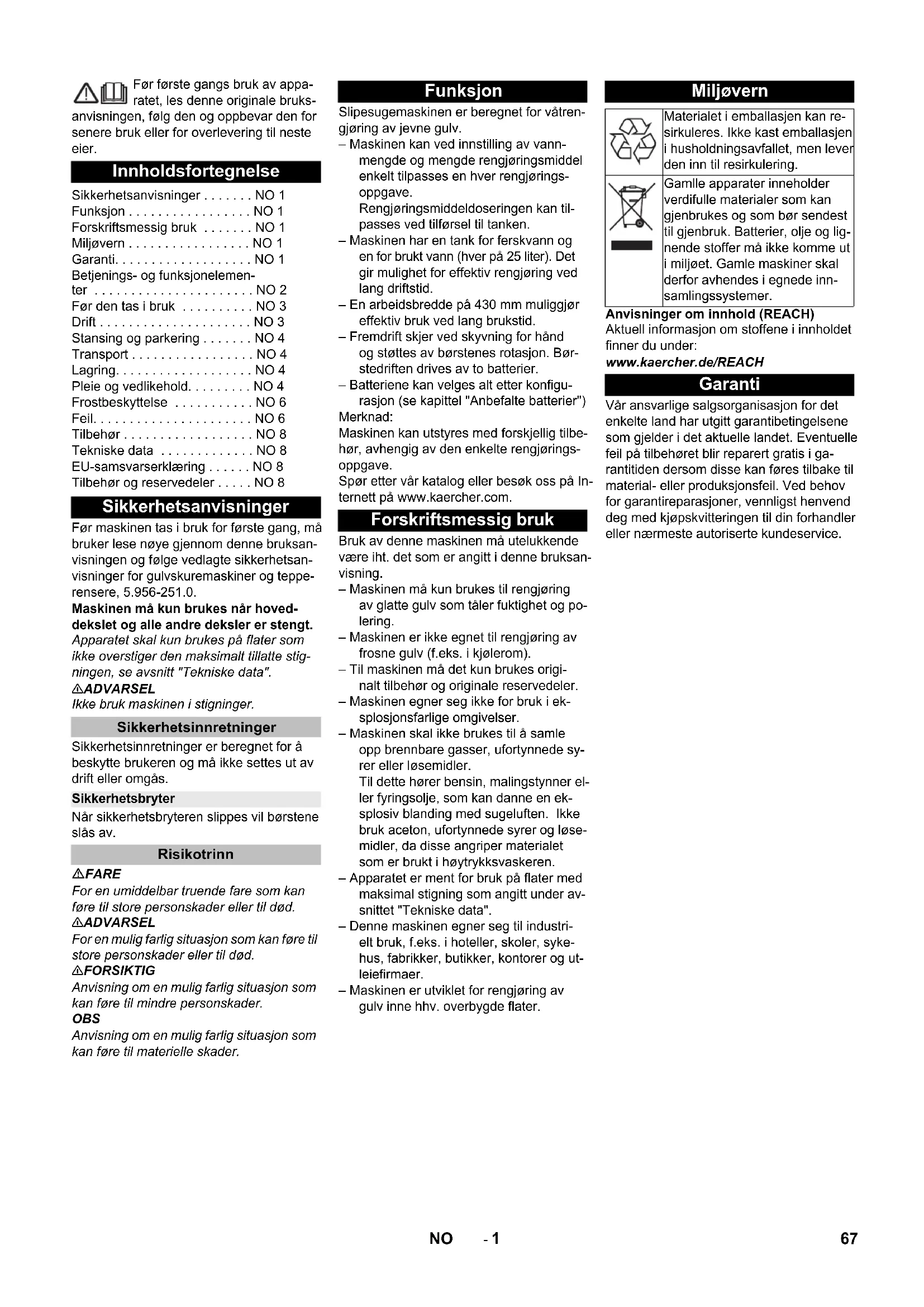 Tilbehør og reservedele Chairman of the Board of Management Director Regulatory Affairs & Certification 66 DA- 1 Før første gangs bruk av appa- ratet, les denne originale bruks- anvisningen, følg den og oppbevar den for senere bruk eller for overlevering til neste eier. Før maskinen tas i bruk for første gang, må bruker lese nøye gjennom denne bruksan- visningen og følge vedlagte sikkerhetsan- visninger for gulvskuremaskiner og teppe- rensere, 5.956-251.0. Maskinen må kun brukes når hoved- dekslet og alle andre deksler er stengt. Apparatet skal kun brukes på flater som ikke overstiger den maksimalt tillatte stig- ningen, se avsnitt "Tekniske data". 몇 ADVARSEL Ikke bruk maskinen i stigninger. Sikkerhetsinnretninger er beregnet for å beskytte brukeren og må ikke settes ut av drift eller omgås. Når sikkerhetsbryteren slippes vil børstene slås av. FARE For en umiddelbar truende fare som kan føre til store personskader eller til død. 몇 ADVARSEL For en mulig farlig situasjon som kan føre til store personskader eller til død. 몇 FORSIKTIG Anvisning om en mulig farlig situasjon som kan føre til mindre personskader. OBS Anvisning om en mulig farlig situasjon som kan føre til materielle skader. Slipesugemaskinen er beregnet for våtren- gjøring av jevne gulv. – Maskinen kan ved innstilling av vann- mengde og mengde rengjøringsmiddel enkelt tilpasses en hver rengjørings- oppgave. Rengjøringsmiddeldoseringen kan til- passes ved tilførsel til tanken. – Maskinen har en tank for ferskvann og en for brukt vann (hver på 25 liter). Det gir mulighet for effektiv rengjøring ved lang driftstid. – En arbeidsbredde på 430 mm muliggjør effektiv bruk ved lang brukstid. – Fremdrift skjer ved skyvning for hånd og støttes av børstenes rotasjon. Bør- stedriften drives av to batterier. – Batteriene kan velges alt etter konfigu- rasjon (se kapittel "Anbefalte batterier") Merknad: Maskinen kan utstyres med forskjellig tilbe- hør, avhengig av den enkelte rengjørings- oppgave. Spør etter vår katalog eller besøk oss på In- ternett på www.kaercher.com. Bruk av denne maskinen må utelukkende være iht. det som er angitt i denne bruksan- visning. – Maskinen må kun brukes til rengjøring av glatte gulv som tåler fuktighet og po- lering. – Maskinen er ikke egnet til rengjøring av frosne gulv (f.eks. i kjølerom). – Til maskinen må det kun brukes origi- nalt tilbehør og originale reservedeler. – Maskinen egner seg ikke for bruk i ek- splosjonsfarlige omgivelser. – Maskinen skal ikke brukes til å samle opp brennbare gasser, ufortynnede sy- rer eller løsemidler. Til dette hører bensin, malingstynner el- ler fyringsolje, som kan danne en ek- splosiv blanding med sugeluften. Ikke bruk aceton, ufortynnede syrer og løse- midler, da disse angriper materialet som er brukt i høytrykksvaskeren. – Apparatet er ment for bruk på flater med maksimal stigning som angitt under av- snittet "Tekniske data". – Denne maskinen egner seg til industri- elt bruk, f.eks. i hoteller, skoler, syke- hus, fabrikker, butikker, kontorer og ut- leiefirmaer. – Maskinen er utviklet for rengjøring av gulv inne hhv. overbygde flater. Anvisninger om innhold (REACH) Aktuell informasjon om stoffene i innholdet finner du under: www.kaercher.de/REACH Vår ansvarlige salgsorganisasjon for det enkelte land har utgitt garantibetingelsene som gjelder i det aktuelle landet. Eventuelle feil på tilbehøret blir reparert gratis i ga- rantitiden dersom disse kan føres tilbake til material- eller produksjonsfeil. Ved behov for garantireparasjoner, vennligst henvend deg med kjøpskvitteringen til din forhandler eller nærmeste autoriserte kundeservice. Innholdsfortegnelse Sikkerhetsanvisninger . . . . . . . NO 1 Funksjon . . . . . . . . . . . . . . . . . NO 1 Forskriftsmessig bruk . . . . . . . NO 1 Miljøvern . . . . . . . . . . . . . . . . . NO 1 Garanti. . . . . . . . . . . . . . . . . . . NO 1 Betjenings- og funksjonelemen- ter . . . . . . . . . . . . . . . . . . . . . . NO 2 Før den tas i bruk . . . . . . . . . . NO 3 Drift . . . . . . . . . . . . . . . . . . . . . NO 3 Stansing og parkering . . . . . . . NO 4 Transport . . . . . . . . . . . . . . . . . NO 4 Lagring. . . . . . . . . . . . . . . . . . . NO 4 Pleie og vedlikehold. . . . . . . . . NO 4 Frostbeskyttelse . . . . . . . . . . . NO 6 Feil. . . . . . . . . . . . . . . . . . . . . . NO 6 Tilbehør . . . . . . . . . . . . . . . . . . NO 8 Tekniske data . . . . . . . . . . . . . NO 8 EU-samsvarserklæring . . . . . . NO 8 Tilbehør og reservedeler . . . . . NO 8 Sikkerhetsanvisninger Sikkerhetsinnretninger Sikkerhetsbryter Risikotrinn Funksjon Forskriftsmessig bruk Miljøvern Materialet i emballasjen kan re- sirkuleres. Ikke kast emballasjen i husholdningsavfallet, men lever den inn til resirkulering. Gamlle apparater inneholder verdifulle materialer som kan gjenbrukes og som bør sendest til gjenbruk. Batterier, olje og lig- nende stoffer må ikke komme ut i miljøet. Gamle maskiner skal derfor avhendes i egnede inn- samlingssystemer. Garanti 67NO- 2 1Losil 2 Sikkerhetsbryter 3 Batteri * 4 Tappeslange bruktvann med dose- ringsinnretning 5 Holdeskinne for Homebase 6Flottør 7 Rentvannstank 8 Lås rentvannstank 9 Rengjøringshode 10 Skivebørste 11 Påfyllingsåpning rentvannstank 12 Bøyle børsteskifte 13 Spillvanntank 14 Pedal transportkjørestell 15 Nivåanvisning rentvann 16 Dreiehåndtak for justering av vinkel på sugebom 17 Høyderegulering sugebom * 18 Vingemuttere for festing av sugebom 19 Sugebom* 20 Sugeslange 21 Reguleringsknapp for vannmengden 22 Batterikontakt 23 Hendel for senking av sugebommen 24 Betjeningspanel 25 Skyvebøyle 26 Plasseringsflate for rengjøringssett "Homebase Box" 27 Deksel spillvanntank
