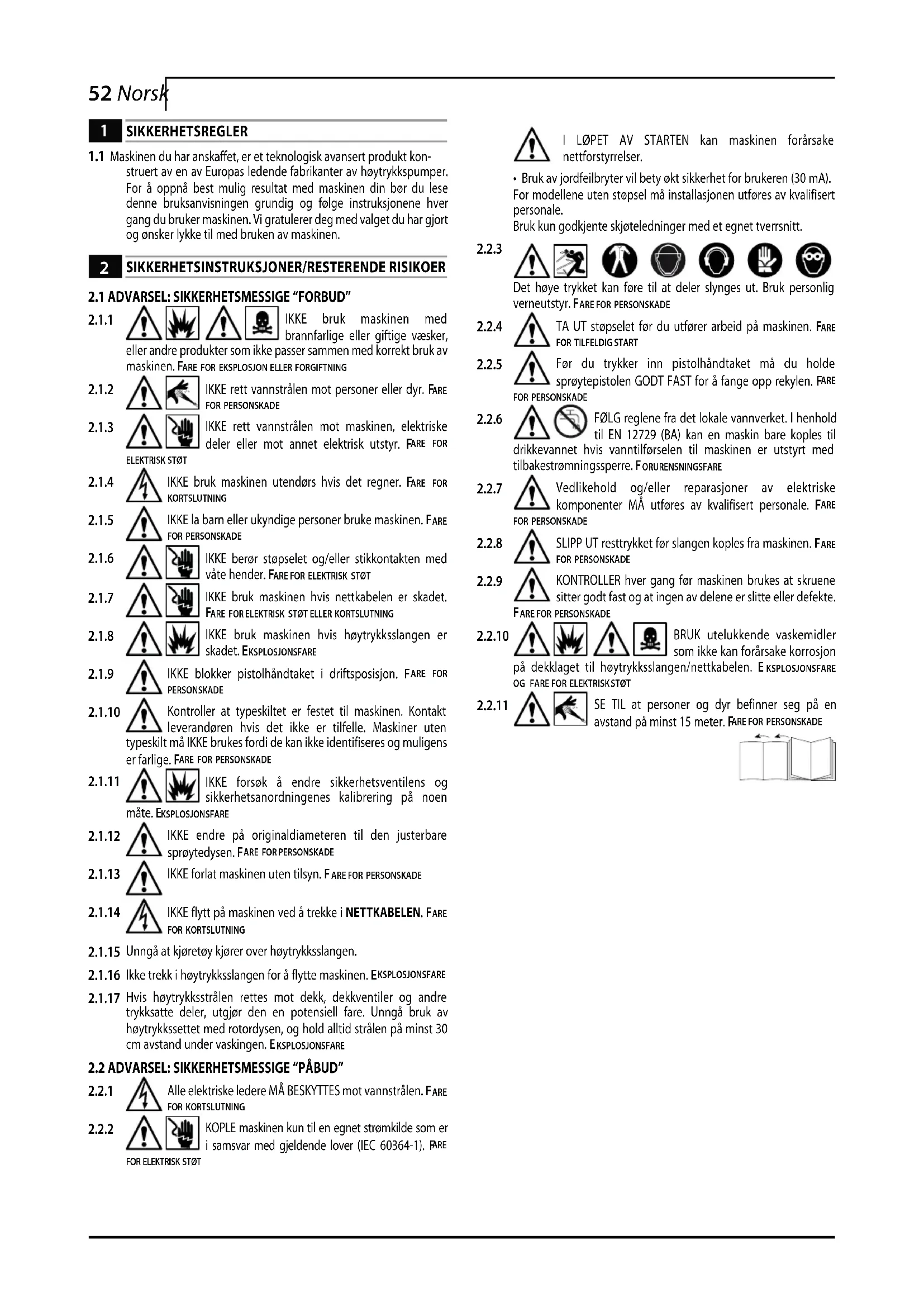 Alle elektriske ledere MÅ BESKYTTES mot vannstrålen. F ARE FOR KORTSLUTNING KOPLE maskinen kun til en egnet strømkilde som er i samsvar med gjeldende lover (IEC 60364-1). F ARE FOR ELEKTRISK STØT I LØPET AV STARTEN kan maskinen forårsake nettforstyrrelser.• Bruk av jordfeilbryter vil bety økt sikkerhet for brukeren (30 mA).For modellene uten støpsel må installasjonen utføres av kvalifisert personale.Bruk kun godkjente skjøteledninger med et egnet tverrsnitt. Det høye trykket kan føre til at deler slynges ut. Bruk personlig verneutstyr. F ARE FOR PERSONSKADE TA UT støpselet før du utfører arbeid på maskinen. F ARE FOR TILFELDIG START Før du trykker inn pistolhåndtaket må du holde sprøytepistolen GODT FAST for å fange opp rekylen. F ARE FOR PERSONSKADE FØLG reglene fra det lokale vannverket. I henhold til EN 12729 (BA) kan en maskin bare koples til drikkevannet hvis vanntilførselen til maskinen er utstyrt med tilbakestrømningssperre. FORURENSNINGSFARE Vedlikehold og/eller reparasjoner av elektriske komponenter MÅ utføres av kvalifisert personale. F ARE FOR PERSONSKADE SLIPP UT resttrykket før slangen koples fra maskinen. F ARE FOR PERSONSKADE KONTROLLER hver gang før maskinen brukes at skruene sitter godt fast og at ingen av delene er slitte eller defekte.