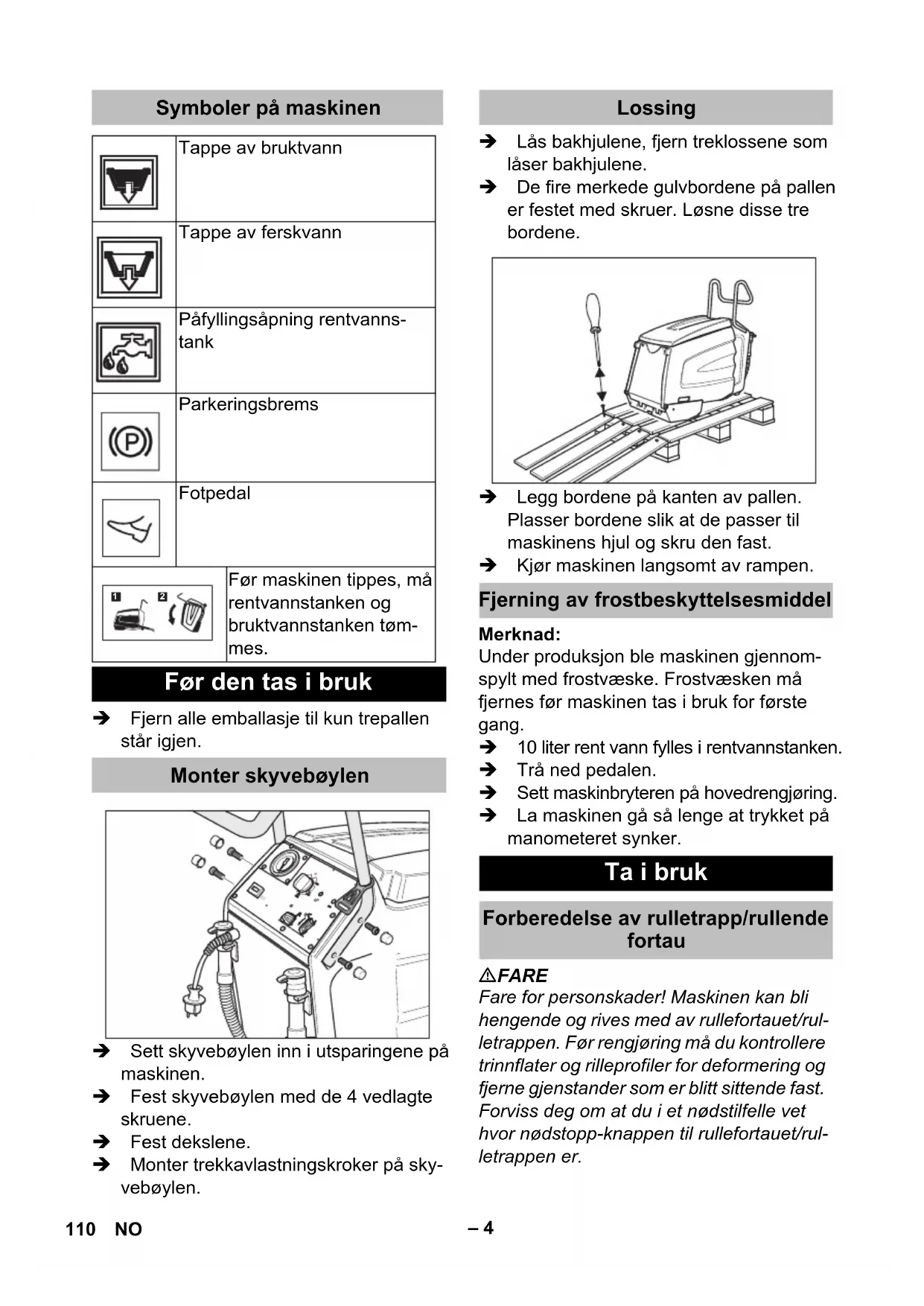 Chairman of the Board of Management Director Regulatory Affairs & Certification 106 DA– 1 Før første gangs bruk av appa- ratet, les denne originale bruks- anvisningen, følg den og oppbevar den for senere bruk eller for overlevering til neste eier. For brukeren: Forsikre deg om at alle som benytter denne makinen er fortrolig med innholdet i denne bruksanvisning, samt de gjeldende forskrif- ter fra Arbeidstilsynet. De som skal bruke maskinen må på forhånd ha fått fagmessig opplæring i bruk. For bruker: Før maskinen tas i bruk for første gang må bruker lese nøye gjennom denne bruksan- visningen og følge vedlagte sikkerhetsan- visninger for gulvskuremaskiner 5.956-251.0. FARE For en umiddelbar truende fare som kan føre til store personskader eller til død. 몇 ADVARSEL For en mulig farlig situasjon som kan føre til store personskader eller til død. 몇 FORSIKTIG Anvisning om en mulig farlig situasjon som kan føre til mindre personskader. OBS Anvisning om en mulig farlig situasjon som kan føre til materielle skader. Sikkerhetsinnretninger er beregnet for å beskytte brukeren og må ikke settes ut av drift eller omgås. Apparatet kan kun startes når pedalen er trådd helt inn. Når pedalen slippes opp, stopper maskinen. Rengjøringsvæske (fra rentvannstanken) påføres rulletrappen/rullefortauet i bevegel- se fra stillestående rulletrapprengjørings- maskin. Børstevalsene børster dermed rengjøringsvæsken mot kjøreretningen i rulletrappens/rullefortauets riller. I samme arbeidsoperasjon blir den brukte rengjø- ringsvæsken suget opp i maskinens brukt- vannstank via opptaksbørstene. Dette apparatet er egnet for kommersiell og industriell bruk, f.eks. i hoteller, skoler, fa- brikker, butikker, kontorer og leiegårder. Bruk av denne maskinen må utelukkende være iht. det som er angitt i denne bruksan- visning. – Maskinen skal kun brukes til rengjøring av trinnflatene på rulletrapper og rulle- fortauer. – Dette apparatet er kun ment for bruk innendørs. – Kjøreretningen på rulletrappen/rullefor- tauet som skal rengjøres må være inn- stilt slik at den beveger seg vekk fra maskinen. – Ved rengjøring av rulletrapper må mas- kinen kun brukes i bunnen av rulletrap- pen. – Til maskinen må det kun brukes origi- nalt tilbehør og originale reservedeler. Innholdsfortegnelse Sikkerhetsanvisninger. . . . . . . NO 1 Funksjon . . . . . . . . . . . . . . . . . NO 1 Forskriftsmessig bruk . . . . . . . NO 1 Miljøvern . . . . . . . . . . . . . . . . . NO 2 Betjenings- og funksjonelemen- ter . . . . . . . . . . . . . . . . . . . . . . NO 3 Før den tas i bruk . . . . . . . . . . NO 4 Ta i bruk . . . . . . . . . . . . . . . . . NO 4 Drift . . . . . . . . . . . . . . . . . . . . . NO 5 Stans av driften . . . . . . . . . . . . NO 7 Pleie og vedlikehold . . . . . . . . NO 7 Transport. . . . . . . . . . . . . . . . . NO 10 Lagring . . . . . . . . . . . . . . . . . . NO 10 Feilretting . . . . . . . . . . . . . . . . NO 11 Tekniske data . . . . . . . . . . . . . NO 12 Garanti . . . . . . . . . . . . . . . . . . NO 12 Tilbehør og reservedeler. . . . . NO 12 EU-samsvarserklæring . . . . . . NO 13 Sikkerhetsanvisninger Risikotrinn Sikkerhetsinnretninger Fotpedal Funksjon Forskriftsmessig bruk 107NO– 2 Anvisninger om innhold (REACH) Aktuell informasjon om stoffene i innholdet finner du under: www.kaercher.com/REACH Miljøvern Materialet i emballasjen kan re- sirkuleres. Ikke kast emballasjen i husholdningsavfallet, men le- ver den inn til resirkulering. Gamle apparater inneholder ver- difulle materialer som kan resir- kuleres. Disse bør leveres inn til gjenvinning. Batterier, olje og lig- nende stoffer må ikke komme ut i miljøet. Gamle maskiner skal derfor avhendes i egnede inn- samlingssystemer. 108 NO– 3 1 Skyvebøyle 2 Avløpsslange friskvann 3 Avløpsslange spillvann 4 Støpsel 5 Strekkavlastningskroker 6 Fotpedal 7 Bakhjul med låsehendel 8 Deksel spillvannstank 9 Forhjul 10 Spillvannstank 11 Påfyllingsåpning rentvannstank 12 Pedal for senking/heving av børsteho- det 13 Hendel for låsing av børstehode 1 Driftstimeteller 2 Display pumpetrykk 3 Apparatbryter 4 Kontrollampe "Spillvanntank full" 5 Kontrollampe "Overbelastning børste- motor" Betjenings- og funksjonelementer Betjeningspanel 109NO– 4 Fjern alle emballasje til kun trepallen står igjen. Sett skyvebøylen inn i utsparingene på maskinen. Fest skyvebøylen med de 4 vedlagte skruene. Fest dekslene. Monter trekkavlastningskroker på sky- vebøylen. Lås bakhjulene, fjern treklossene som låser bakhjulene. De fire merkede gulvbordene på pallen er festet med skruer. Løsne disse tre bordene. Legg bordene på kanten av pallen. Plasser bordene slik at de passer til maskinens hjul og skru den fast. Kjør maskinen langsomt av rampen. Merknad: Under produksjon ble maskinen gjennom- spylt med frostvæske. Frostvæsken må fjernes før maskinen tas i bruk for første gang. 10 liter rent vann fylles i rentvannstanken. Trå ned pedalen. Sett maskinbryteren på hovedrengjøring. La maskinen gå så lenge at trykket på manometeret synker. FARE Fare for personskader! Maskinen kan bli hengende og rives med av rullefortauet/rul- letrappen. Før rengjøring må du kontrollere trinnflater og rilleprofiler for deformering og fjerne gjenstander som er blitt sittende fast. Forviss deg om at du i et nødstilfelle vet hvor nødstopp-knappen til rullefortauet/rul- letrappen er. Symboler på maskinen Tappe av bruktvann Tappe av ferskvann Påfyllingsåpning rentvanns- tank Parkeringsbrems Fotpedal Før maskinen tippes, må rentvannstanken og bruktvannstanken tøm- mes. Før den tas i bruk Monter skyvebøylen