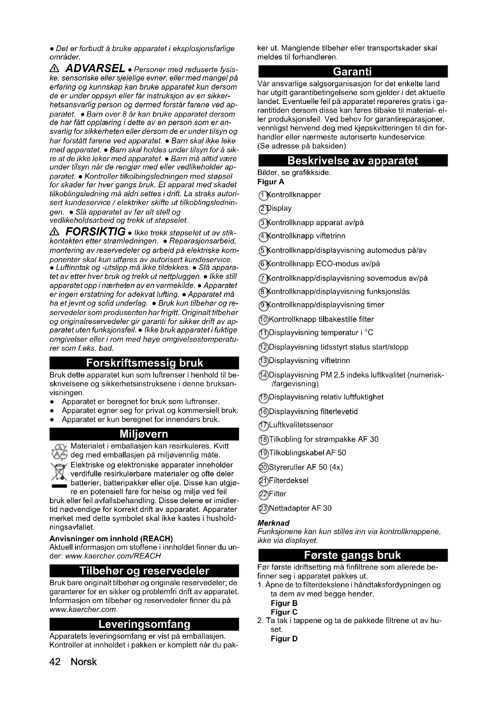 - Tekniske spesifikasjoner Norsk ● Det er forbudt å bruke apparatet i eksplosjonsfarlige områder. 몇 ADVARSEL ● Personer med reduserte fysis- ke, sensoriske eller sjelelige evner, eller med mangel på erfaring og kunnskap kan bruke apparatet kun dersom de er under oppsyn eller får instruksjon av en sikker- hetsansvarlig person og dermed forstår farene ved ap- paratet. ● Barn over 8 år kan bruke apparatet dersom de har fått opplæring i dette av en person som er an- svarlig for sikkerheten eller dersom de er under tilsyn og har forstått farene ved apparatet. ● Barn skal ikke leke med apparatet. ● Barn skal holdes under tilsyn for å sik- re at de ikke leker med apparatet. ● Barn må alltid være under tilsyn når de rengjør med eller vedlikeholder ap- paratet. ● Kontroller tilkolbingsledningen med støpsel for skader før hver gangs bruk. Et apparat med skadet tilkoblingsledning må aldri settes i drift. La straks autori- sert kundeservice / elektriker skifte ut tilkoblingslednin- gen. ● Slå apparatet av før alt stell og vedlikeholdsarbeid og trekk ut støpselet. 몇 FORSIKTIG ● Ikke trekk støpselet ut av stik- kontakten etter strømledningen. ● Reparasjonsarbeid, montering av reservedeler og arbeid på elektriske kom- ponenter skal kun utføres av autorisert kundeservice. ● Luftinntak og -utslipp må ikke tildekkes. ● Slå appara- tet av etter hver bruk og trekk ut nettpluggen. ● Ikke still apparatet opp i nærheten av en varmekilde. ● Apparatet er ingen erstatning for adekvat lufting. ● Apparatet må ha et jevnt og solid underlag. ● Bruk kun tilbehør og re- servedeler som produsenten har frigitt. Originalt tilbehør og originalreservedeler gir garanti for sikker drift av ap- paratet uten funksjonsfeil. ● Ikke bruk apparatet i fuktige omgivelser eller i rom med høye omgivelsestemperatu- rer som f.eks. bad. Forskriftsmessig bruk Bruk dette apparatet kun som luftrenser i henhold til be- skrivelsene og sikkerhetsinstruksene i denne bruksan- visningen. ● Apparatet er beregnet for bruk som luftrenser. ● Apparatet egner seg for privat og kommersiell bruk. ● Apparatet er kun beregnet for innendørs bruk. Miljøvern Materialet i emballasjen kan resirkuleres. Kvitt deg med emballasjen på miljøvennlig måte. Elektriske og elektroniske apparater inneholder verdifulle resirkulerbare materialer og ofte deler batterier, batteripakker eller olje. Disse kan utgjø- re en potensiell fare for helse og miljø ved feil bruk eller feil avfallsbehandling. Disse delene er imidler- tid nødvendige for korrekt drift av apparatet. Apparater merket med dette symbolet skal ikke kastes i hushold- ningsavfallet. Anvisninger om innhold (REACH) Aktuell informasjon om stoffene i innholdet finner du un- der: www.kaercher.com/REACH Tilbehør og reservedeler Bruk bare originalt tilbehør og originale reservedeler; de garanterer for en sikker og problemfri drift av apparatet. Informasjon om tilbehør og reservedeler finner du på www.kaercher.com. Leveringsomfang Apparatets leveringsomfang er vist på emballasjen. Kontroller at innholdet i pakken er komplett når du pak- ker ut. Manglende tilbehør eller transportskader skal meldes til forhandleren. Garanti Vår ansvarlige salgsorganisasjon for det enkelte land har utgitt garantibetingelsene som gjelder i det aktuelle landet. Eventuelle feil på apparatet repareres gratis i ga- rantitiden dersom disse kan føres tilbake til material- el- ler produksjonsfeil. Ved behov for garantireparasjoner, vennligst henvend deg med kjøpskvitteringen til din for- handler eller nærmeste autoriserte kundeservice. (Se adresse på baksiden) Beskrivelse av apparatet Bilder, se grafikkside. Figur A 1 Kontrollknapper 2 Display 3 Kontrollknapp apparat av/på 4 Kontrollknapp viftetrinn 5 Kontrollknapp/displayvisning automodus på/av 6 Kontrollknapp ECO-modus av/på 7 Kontrollknapp/displayvisning sovemodus av/på 8 Kontrollknapp/displayvisning funksjonslås 9 Kontrollknapp/displayvisning timer 10 Kontrollknapp tilbakestille filter 11 Displayvisning temperatur i °C 12 Displayvisning tidsstyrt status start/stopp 13 Displayvisning viftetrinn 14 Displayvisning PM 2,5 indeks luftkvalitet (numerisk- /fargevisning) 15 Displayvisning relativ luftfuktighet 16 Displayvisning filterlevetid 17 Luftkvalitetssensor 18 Tilkobling for strømpakke AF 30 19 Tilkoblingskabel AF 50 20 Styreruller AF 50 (4x) 21 Filterdeksel 22 Filter 23 Nettadapter AF 30 Merknad Funksjonene kan kun stilles inn via kontrollknappene, ikke via displayet. Første gangs bruk Før første idriftsetting må finfiltrene som allerede be- finner seg i apparatet pakkes ut. p. 4542