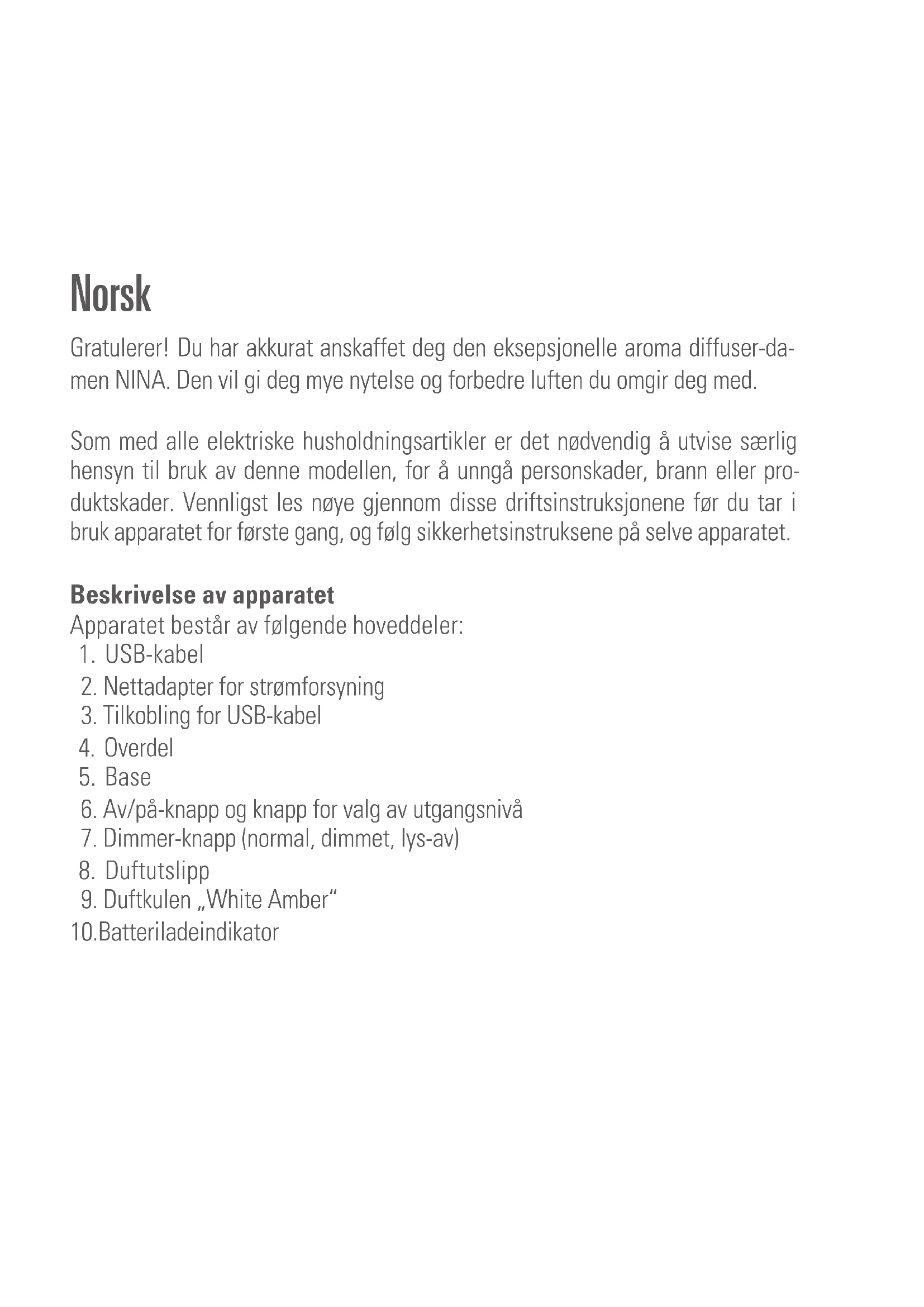 - Batteriet lades opp: LED lyser konstant Når apparatet er helt oppladet, slukkes LED’en. Nå kan du ta ut USB-kabelen og bruke apparatet i batteridrift (i opptil 50 h i strekk). OBS: Duftkule-sortimentet omfatter 6 forskjellige duftvarianter: White Amber, Orange Bergamot, Red Jasmine, Blue Rosewood, Black Orchid, Yellow Vanilla. Duftkulene er å få kjøpt hos den forhandleren, der du kjøpte Nina. Rengjøring Før vedlikehold og etter bruk, slå av enheten og dra ut nettverksadapteren fra støpselet.OBS: Aldri senk enheten i vann (fare for kortslutning).