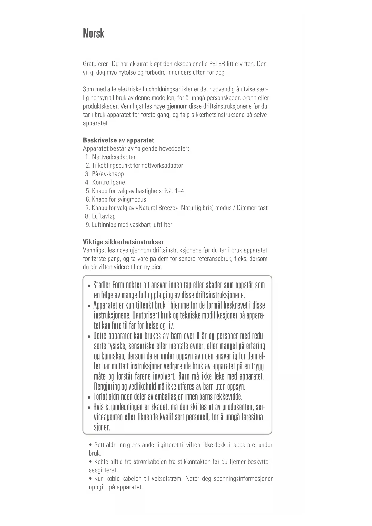 Last ned instruksjonene for din Vifte i PDF-format gratis! Finn veiledningen din Peter little - STADLER FORM og ta den elektroniske enheten tilbake i hendene. På denne siden er alle dokumenter som er nødvendige for bruken av enheten din publisert. Peter little av merket STADLER FORM.