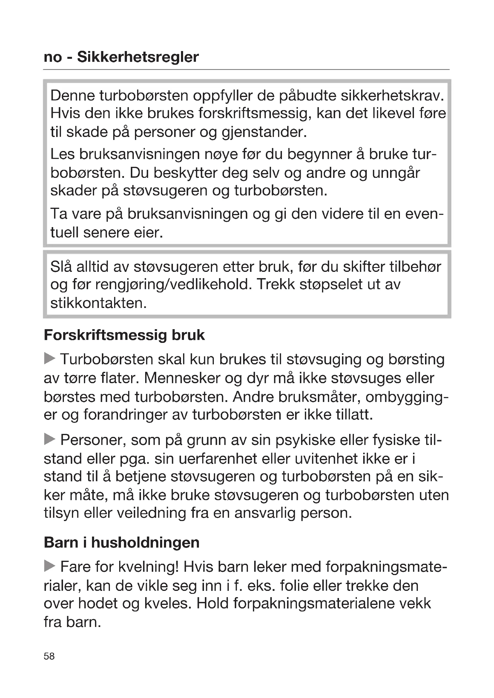 Denne turbobørsten oppfyller de påbudte sikkerhetskrav. Hvis den ikke brukes forskriftsmessig, kan det likevel føre til skade på personer og gjenstander. Les bruksanvisningen nøye før du begynner å bruke tur- bobørsten. Du beskytter deg selv og andre og unngår skader på støvsugeren og turbobørsten. Ta vare på bruksanvisningen og gi den videre til en even- tuell senere eier. Slå alltid av støvsugeren etter bruk, før du skifter tilbehør og før rengjøring/vedlikehold. Trekk støpselet ut av stikkontakten. Forskriftsmessig bruk Turbobørsten skal kun brukes til støvsuging og børsting av tørre flater. Mennesker og dyr må ikke støvsuges eller børstes med turbobørsten. Andre bruksmåter, ombygging- er og forandringer av turbobørsten er ikke tillatt. Personer, som på grunn av sin psykiske eller fysiske til- stand eller pga. sin uerfarenhet eller uvitenhet ikke er i stand til å betjene støvsugeren og turbobørsten på en sik- ker måte, må ikke bruke støvsugeren og turbobørsten uten tilsyn eller veiledning fra en ansvarlig person. Barn i husholdningen Fare for kvelning! Hvis barn leker med forpakningsmate- rialer, kan de vikle seg inn i f.eks. folie eller trekke den over hodet og kveles. Hold forpakningsmaterialene vekk fra barn.no - Sikkerhetsregler